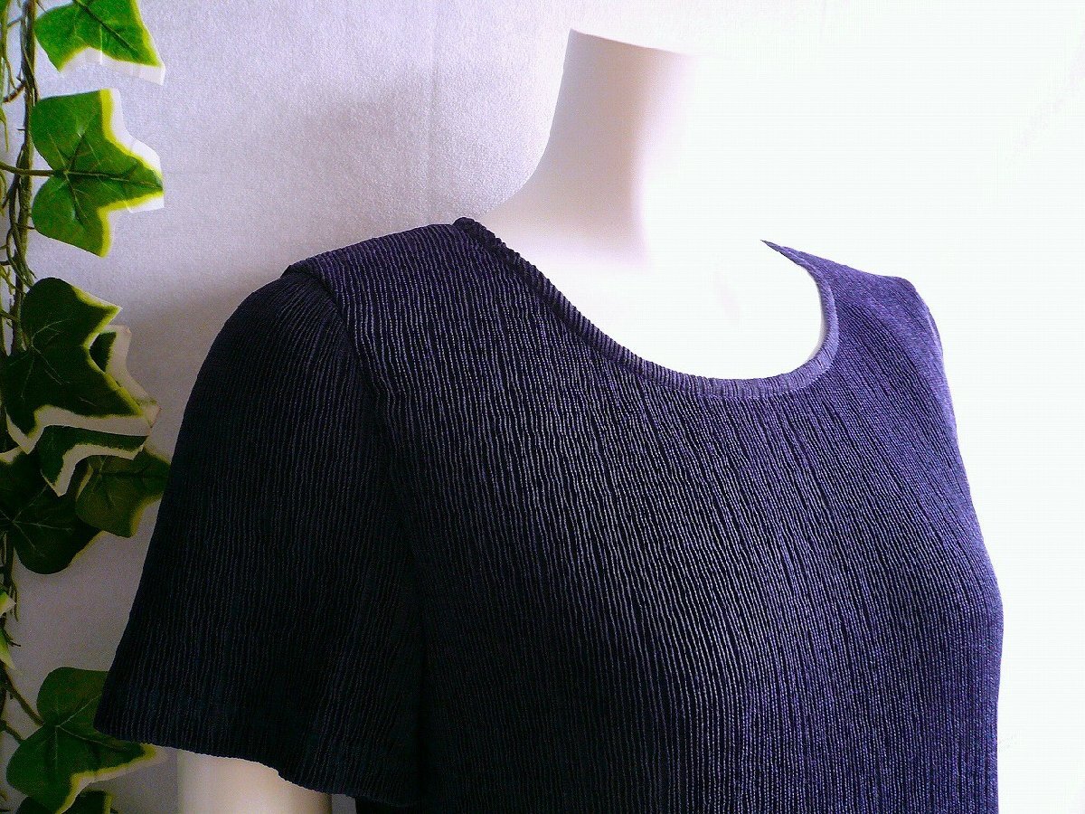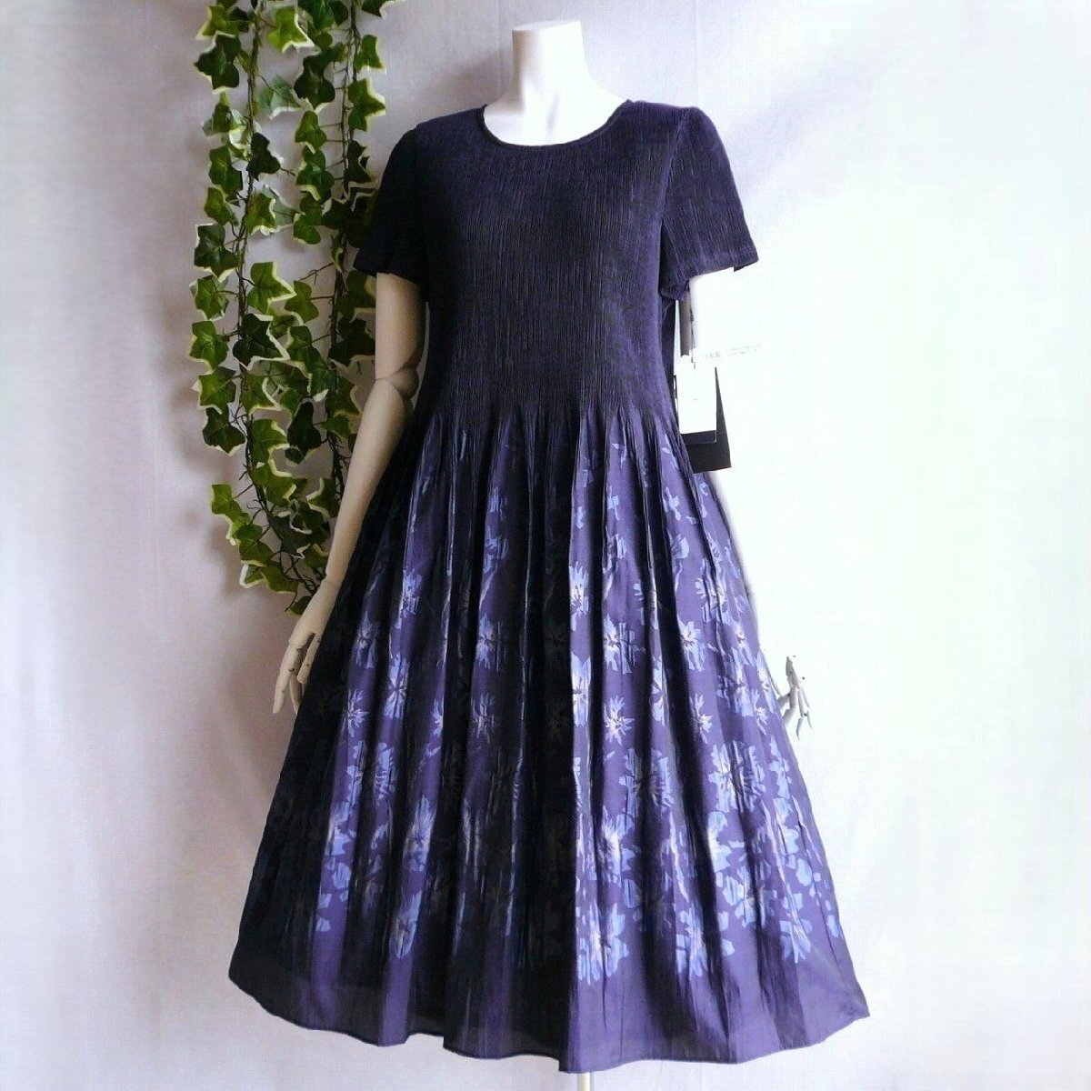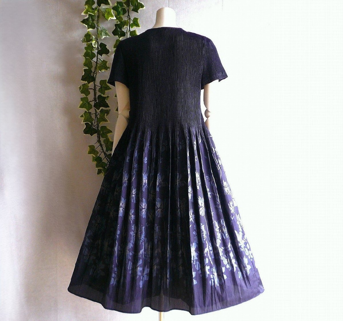 新品 9713 L 日本製 桐生織 プリーツ ワンピース 春 夏 秋 紫系 レディース 綿混 抑揚花模様 ペチコート付 高級 上質 上品 50代 60代 70代