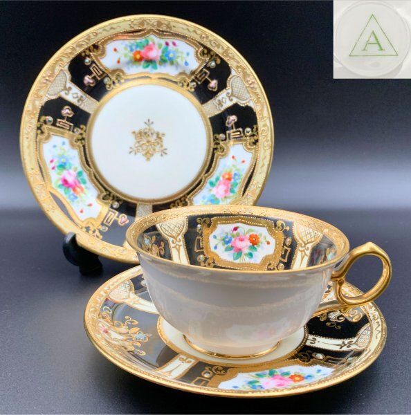 【希少】オールドノリタケ 里帰り 金彩×黒地ジュエルの豪華装飾!アンティーク トリオ(カップ&ソーサー&プレート) 明治期 T004
