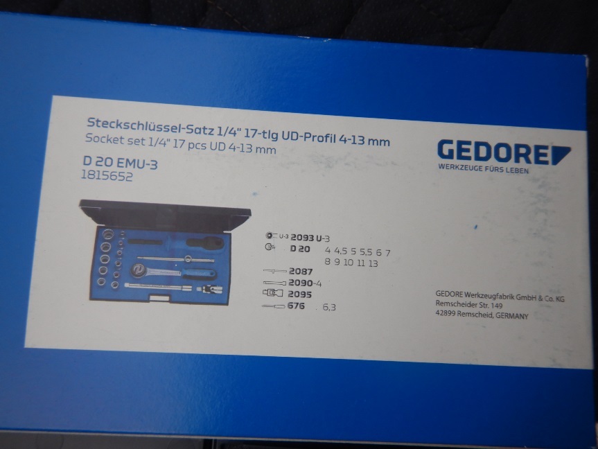 | 即決税込 未使用品 GEDOREゲドレー ソケットレンチセット 6.35mm角1/4 17点 D20EMU-3 ソケット4~13mm ================== 構成内容 ラチェットハンドル2093U-3 全長129mm ソケット12角D20 4mm 4.5mm 5mm 5.5mm 6mm 7mm 8mm 9mm 10mm 11mm 13mm T形ハンドル2087 エクステンションバー2090-4 全長97mm ユニバーサルジョイント2095 ドライバーハンドル676 プラスチックケース ============= 即決ですので入札=落札です。 落札価格は消費税込みの金額です。 早いもの勝ち!! |