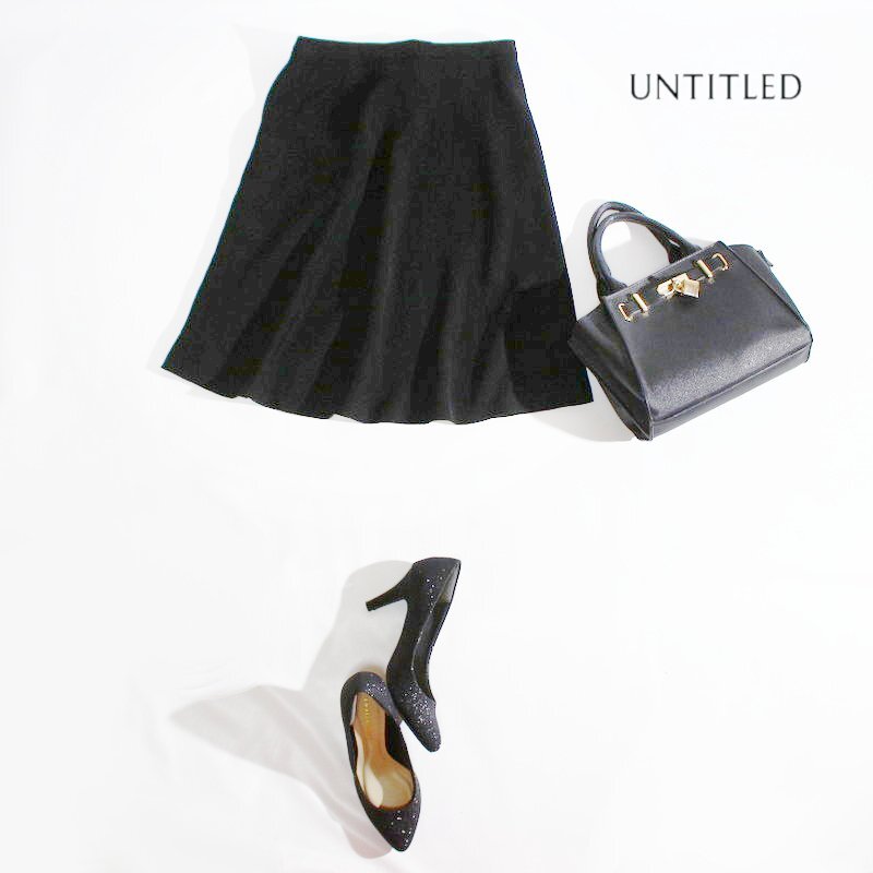 美品 アンタイトル UNTITLED 株) ワールド 合物 ストレッチ ジャージ― スーツ フレアスカート 1 S ブラック 黒 フォーマル 綺麗め 上品