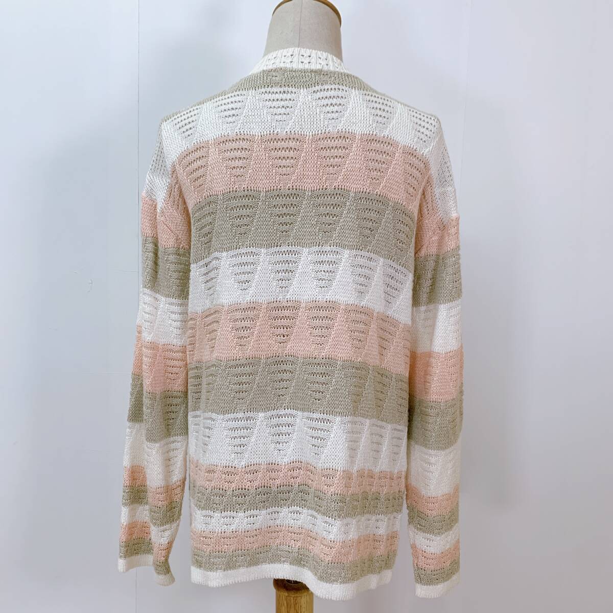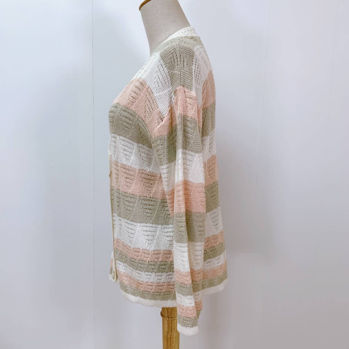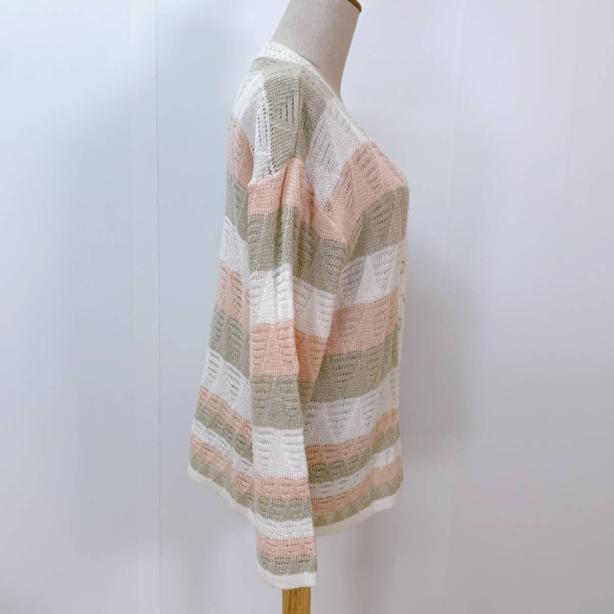 YH1582 BARENTS レディース 麻混 長袖 カーディガン リネン 日本製 ピンク ベージュ ホワイト ボーダー柄 パステルカラー かわいい USED