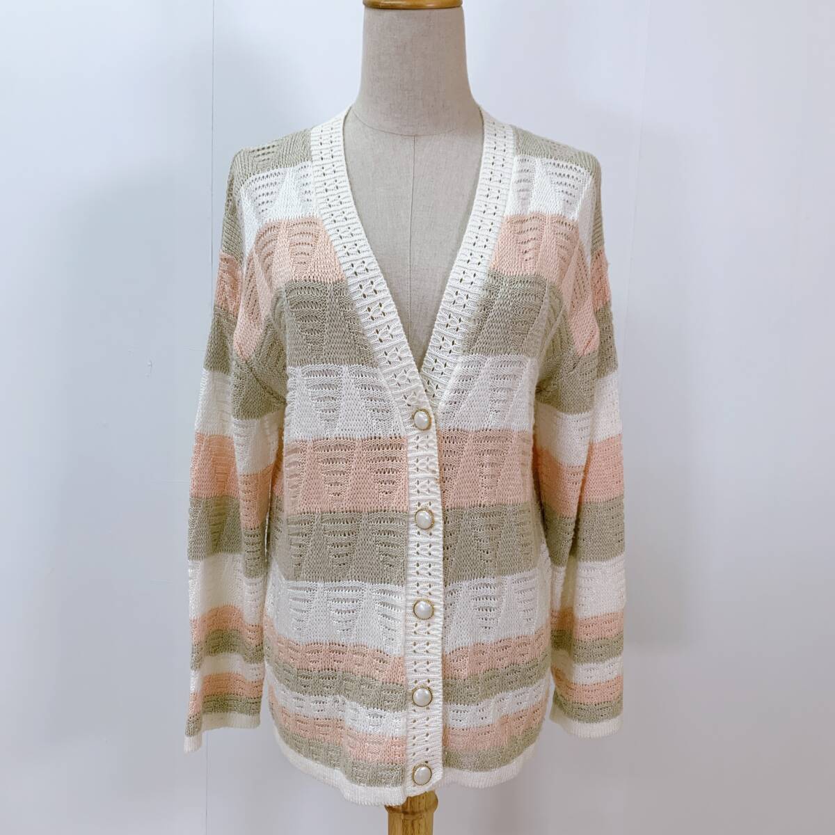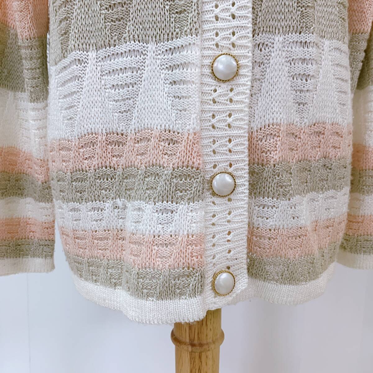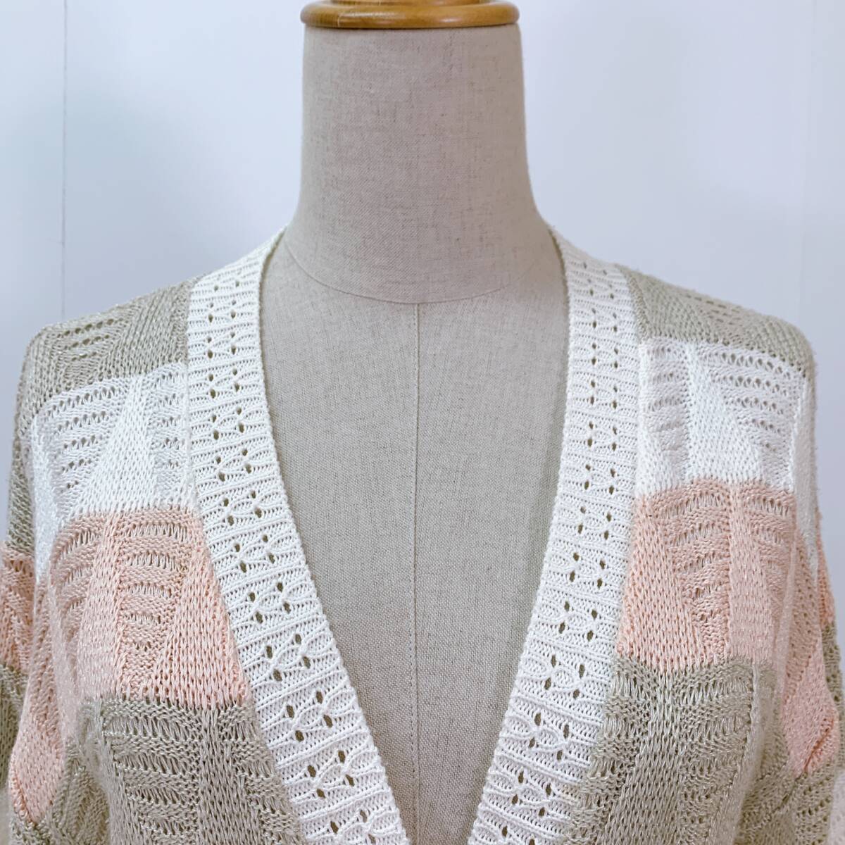 YH1582 BARENTS レディース 麻混 長袖 カーディガン リネン 日本製 ピンク ベージュ ホワイト ボーダー柄 パステルカラー かわいい USED
