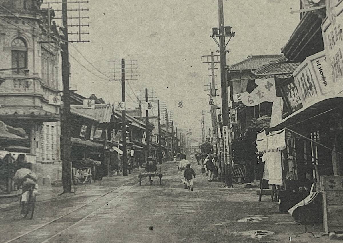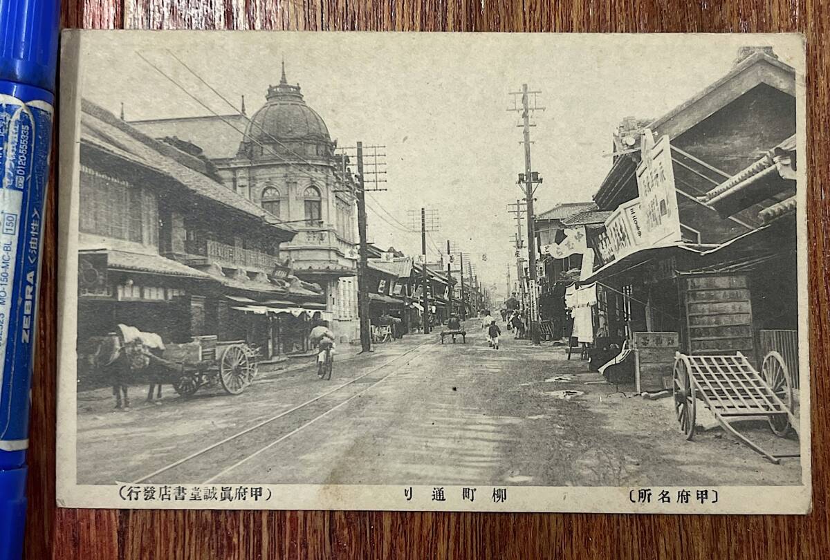 昔の甲府 戦後絵葉書 古写真★山梨 柳町通り★有信銀行本店 荷車 馬車鉄道線路?★大正後期〜昭和初期