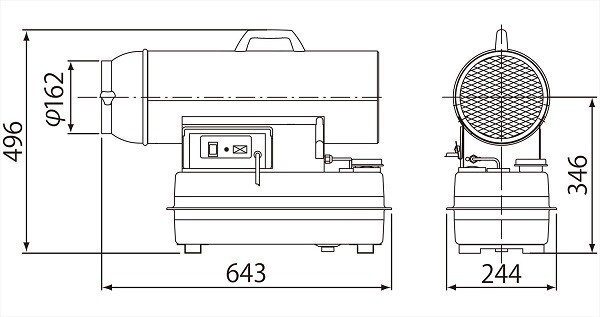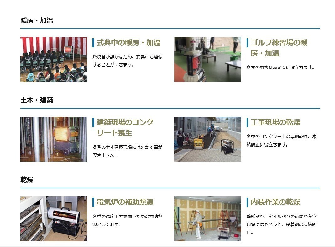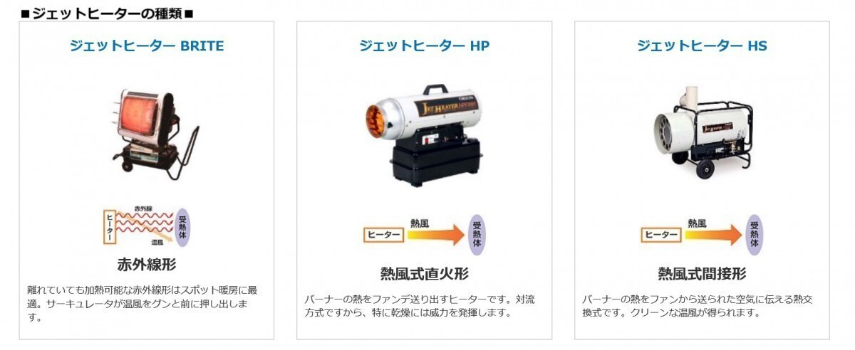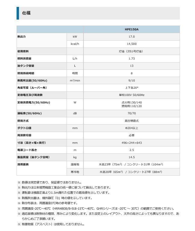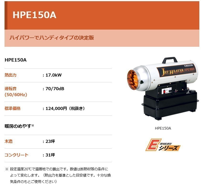 【商品詳細】 ~こちらの商品は〈業務用〉となります。~ 型式:HPE150A1 60Hz 熱出力(強/弱)kW kcal/h : 17.0 14,500 使用燃料 :灯油(JIS1号灯油) 燃料消費量 L/h :1.73 油タンク容量 L :13 燃焼持続時間 時間 :8 熱風吹出量 m3/min :9/10 角度可変(ルーバー角 ) : 上下各 20° 定格電圧及び周波数 : 単相100V 60Hz 定格消費電力 W : 点火時140 燃焼時120 運転音 dB : 70 燃焼方式 :高圧噴霧式 ダクト口径 mm : φ204以上 周波数切替 : 必要 電源コード長さ m : 2.5m 製品質量(油タンク空時)kg : 14.5 寸法(高さ×奥行×幅) mm 496×643×244 適用面積 温暖地 坪(m2) 木造 23(75)/ コンクリート 31(104) 寒冷地 坪(m2) 木造 20(65)/ コンクリート 27(88) ■シーズン商品になりますので、在庫が無くなる場合がございます。 お急ぎの場合は、必ずご注文の前に納期をお問合せ下さい。 ※廃番・後継等がございます。その際は、お知らせさせて頂きます。<br/>※仕様は、予告なく変更する場合がございます。 ■写真は、イメージです。 メーカーホームページはこちらからオリオン機械株式会社 ※仕様は予告な ◆ご購入前に必ずご確認ください◆
