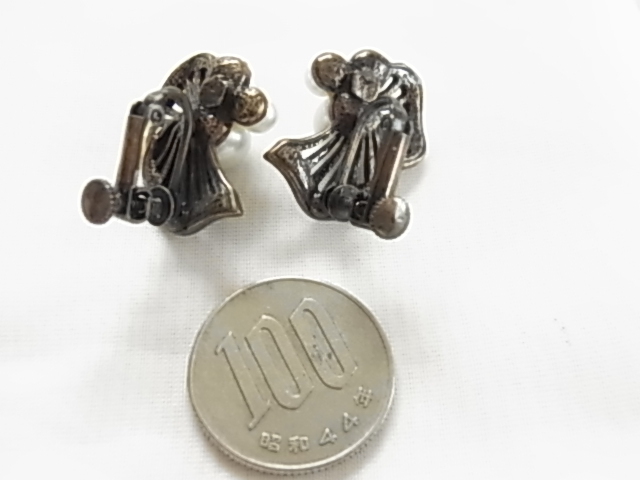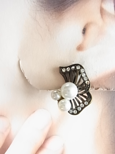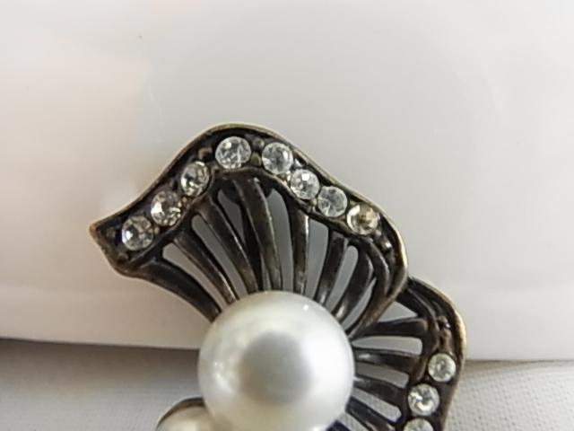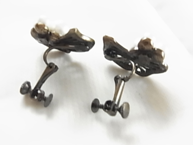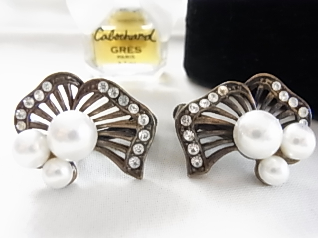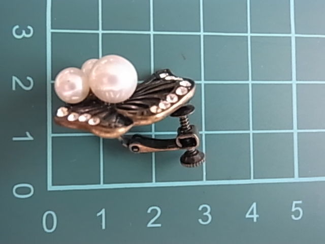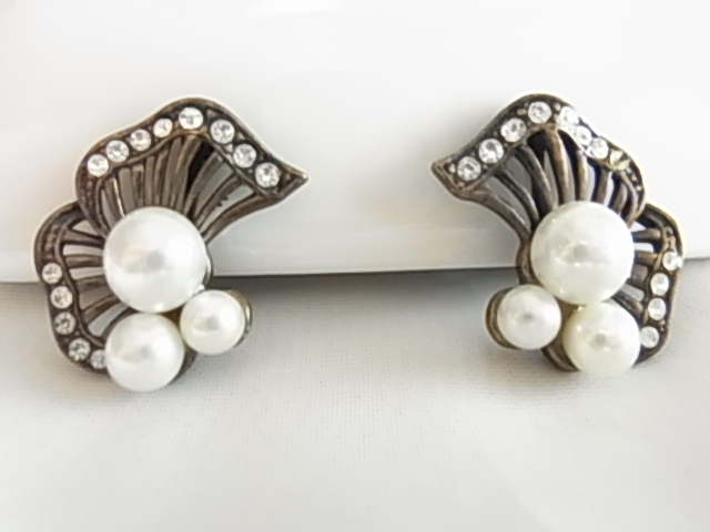 ♪ビンテージ/ヴィンテージ イミテーションパールとイミテーションダイヤ調のラインストーンが輝くレトロ 銅色?飴色系 イヤリング