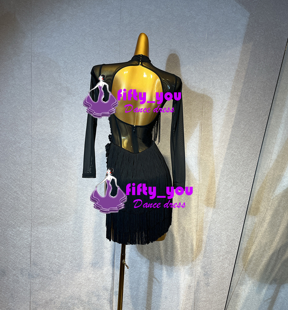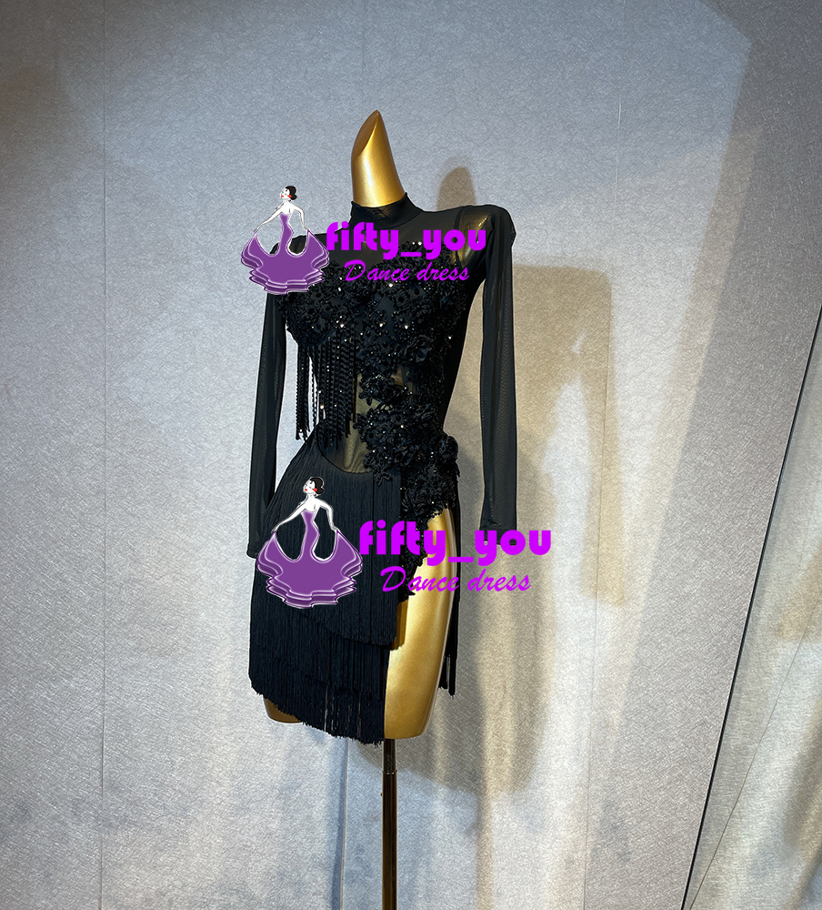 新品fifty_you レディース社交ダンス衣装 ラテンドレス 競技試合デモ着用ダンスドレス モチーフ飾り 魅力サイズオーダー 黒色