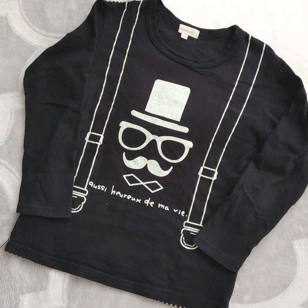 お洒落なひげメガネとサスペンダーのプリントが目を引くカットソー。