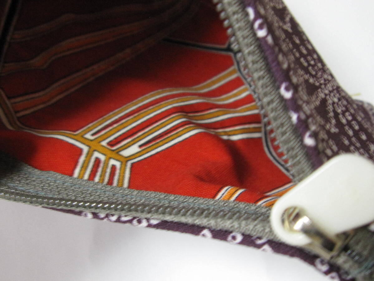 内側は、古布 (ライン調な模様:ウール?)  ◎ファスナーは、グレー系 (つまみ付き)