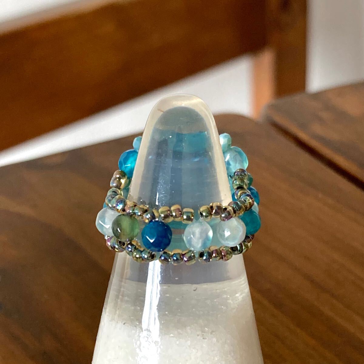 10mmのブルーグリーンのパールビーズ、4mmのブルーミックスの瑪瑙ビーズ、2mmの薄いブルーグリーンのボタンカットビーズ、グリーンオーロラ系の丸小ビーズで作ったリングです。