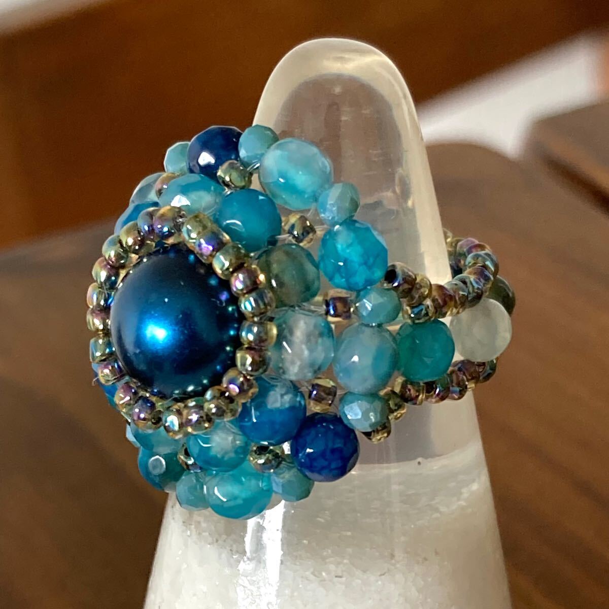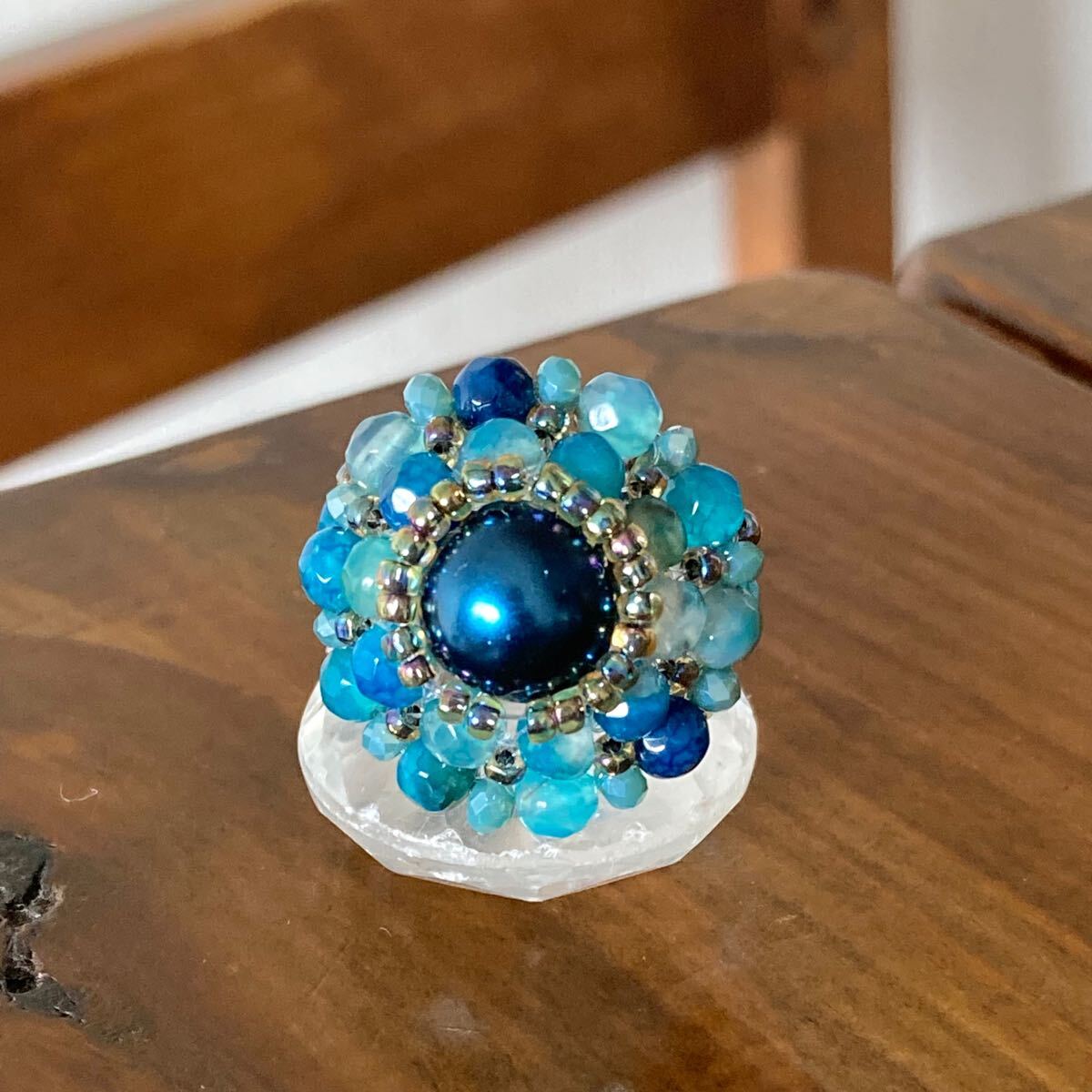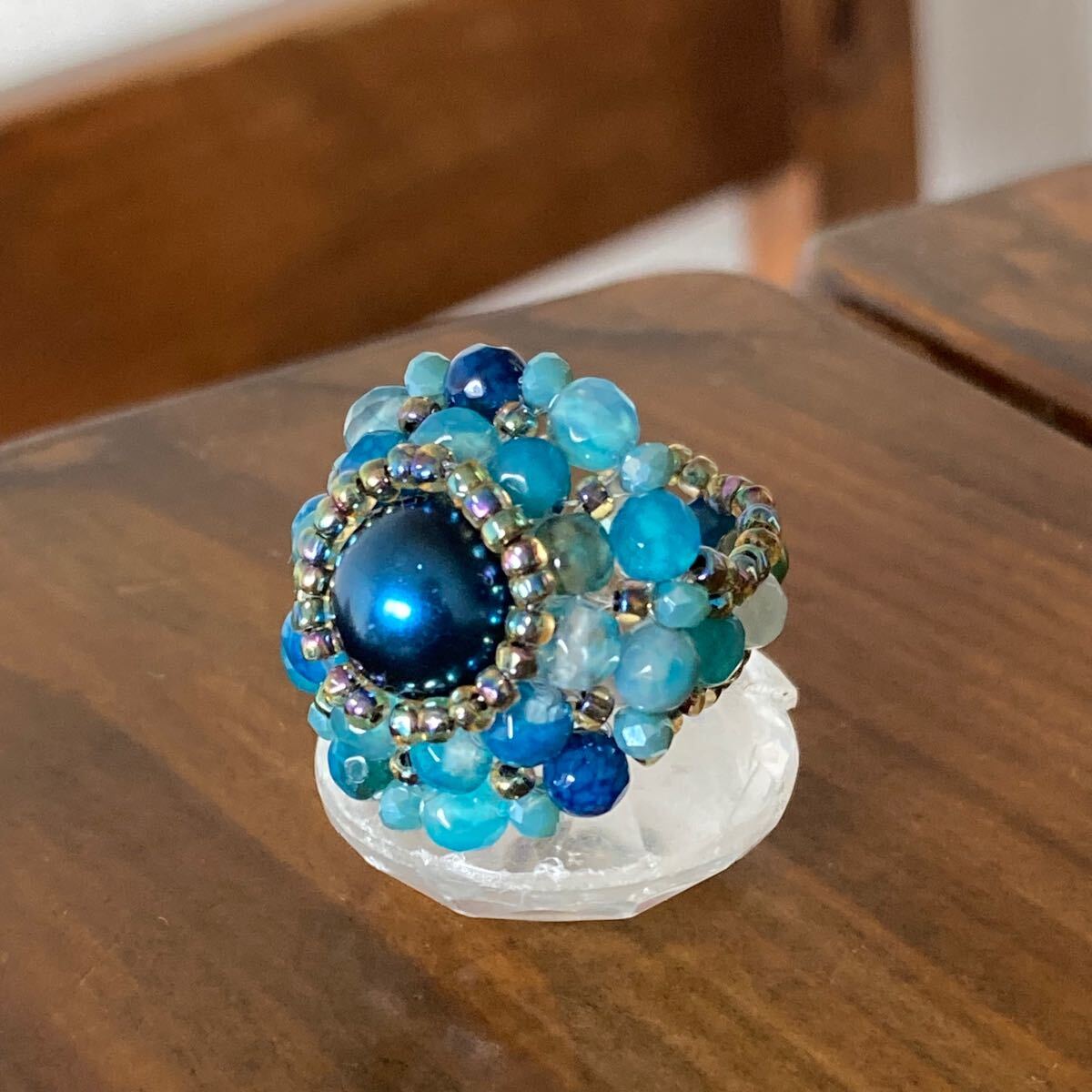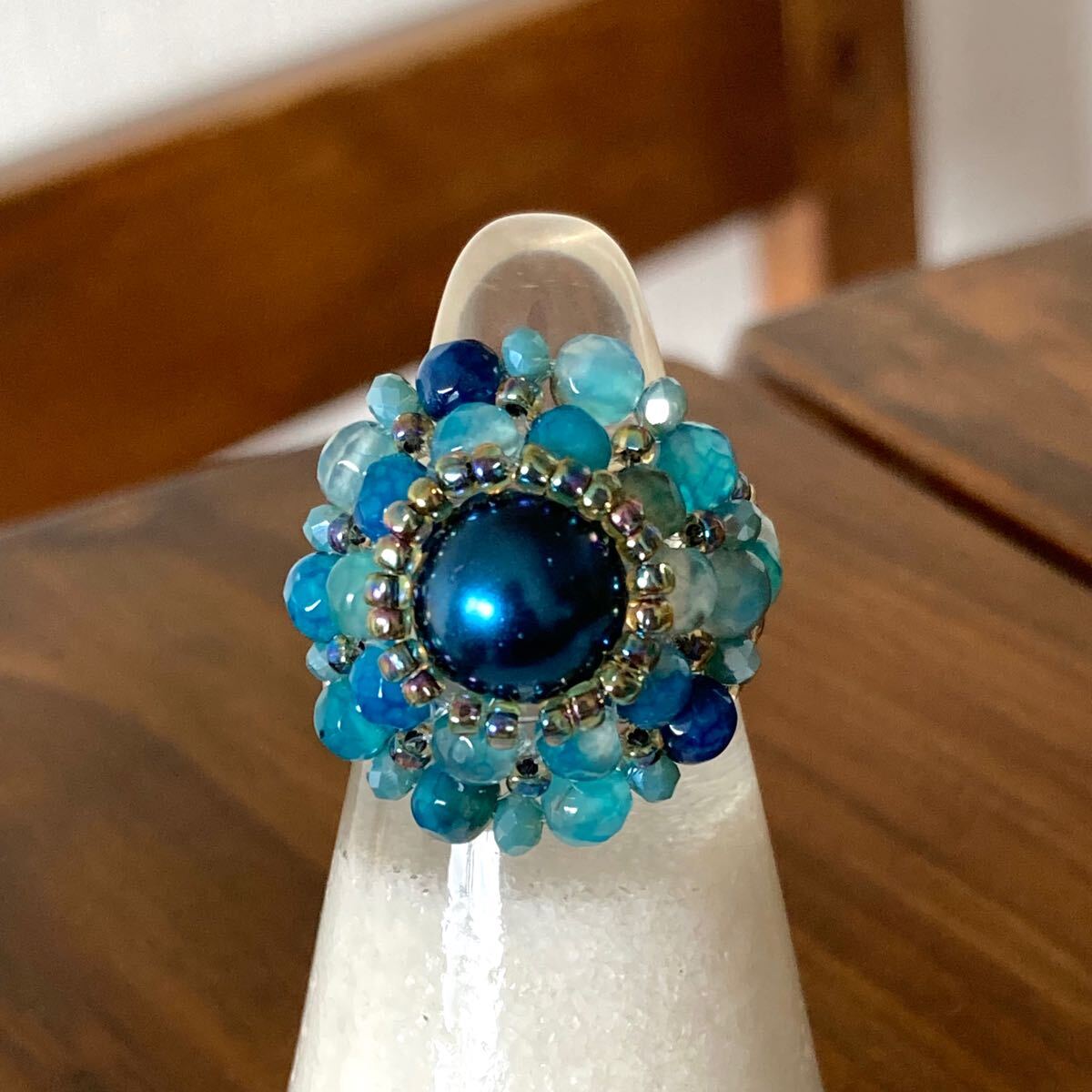 パールビーズの周りを多面カットが綺麗なブルーミックス瑪瑙ビーズと丸小ビーズで3重に編んだボリュームリングです♪