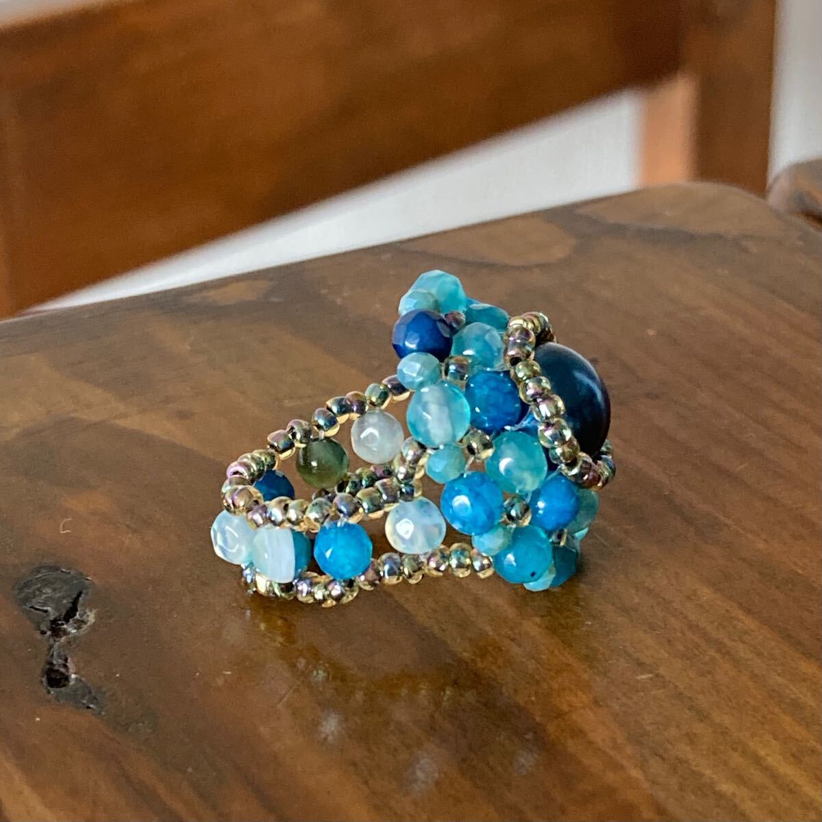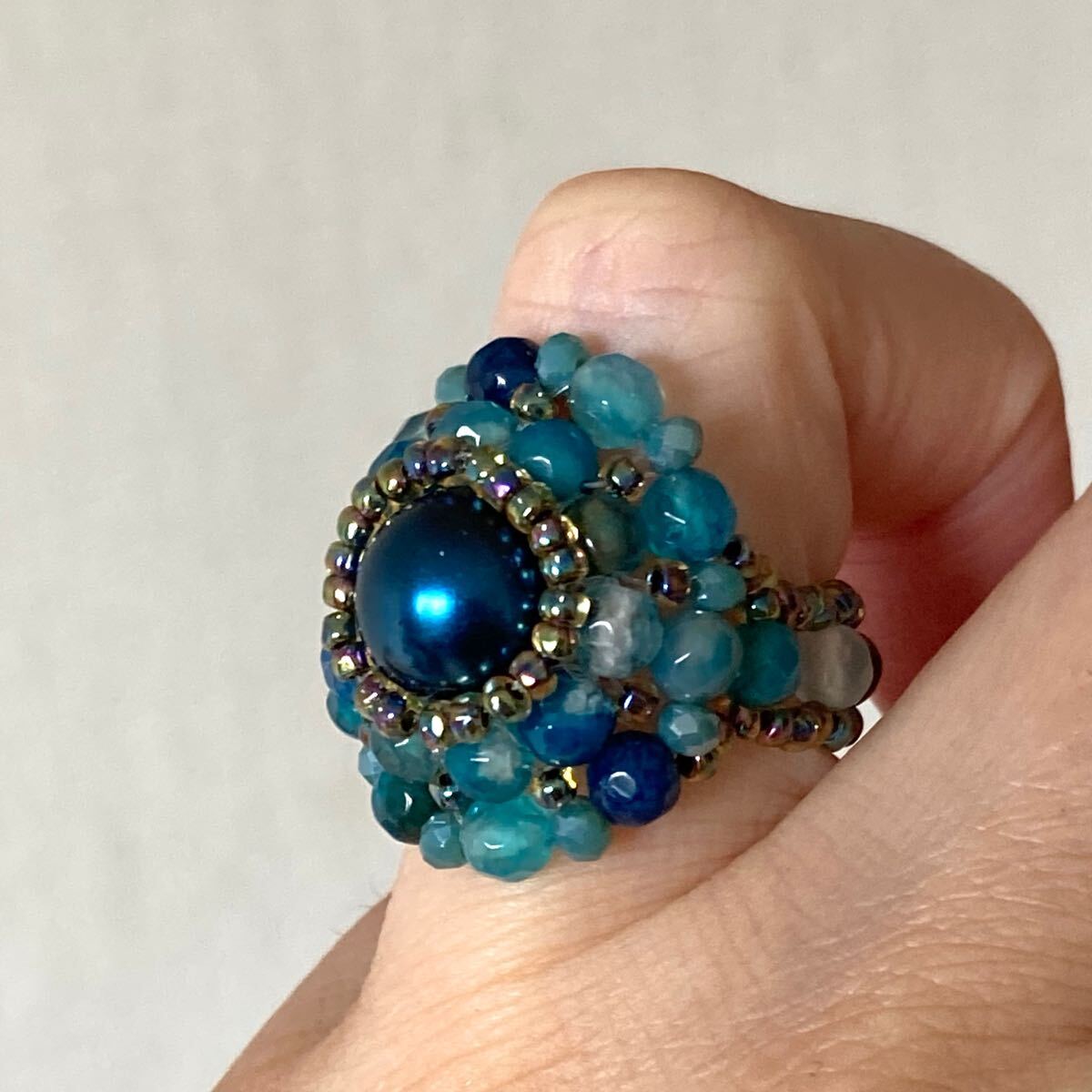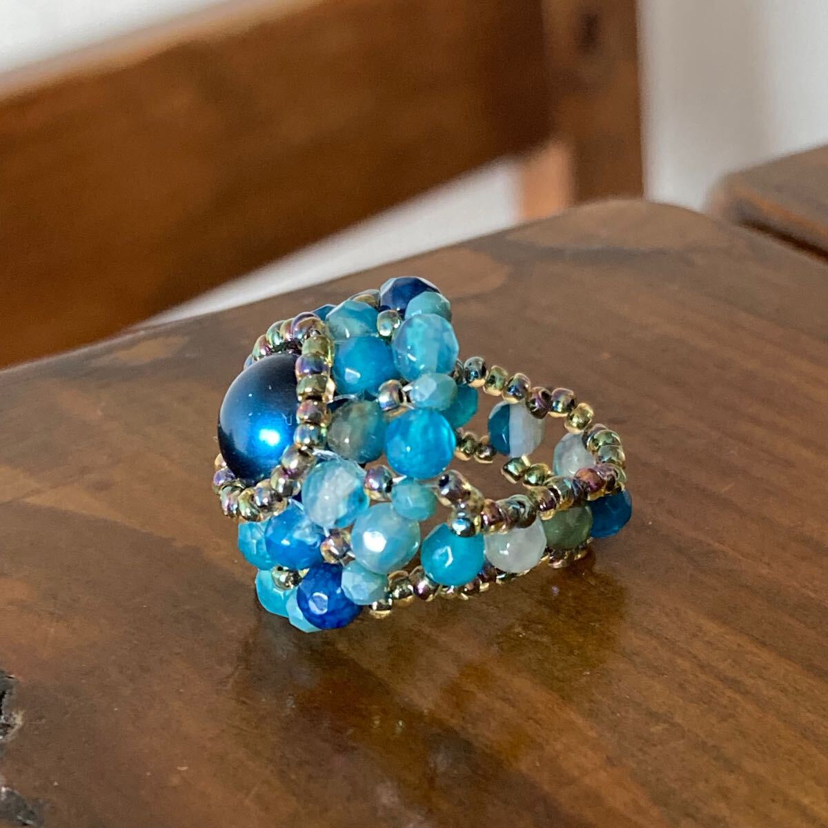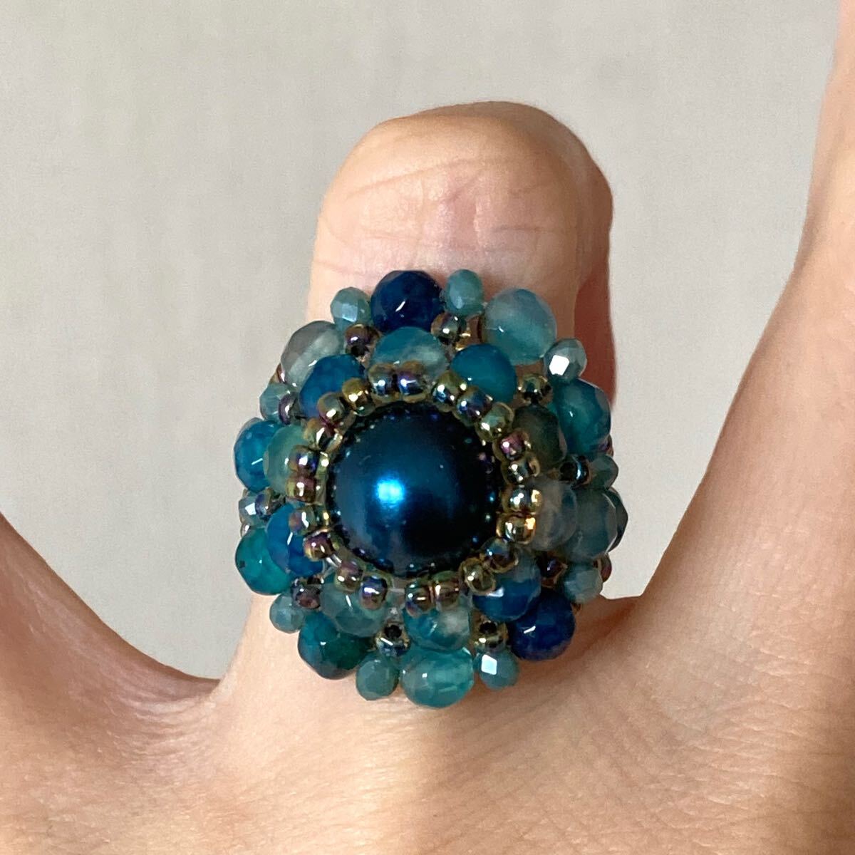 パールビーズの周りを多面カットが綺麗なブルーミックス瑪瑙ビーズと丸小ビーズで3重に編んだボリュームリングです♪