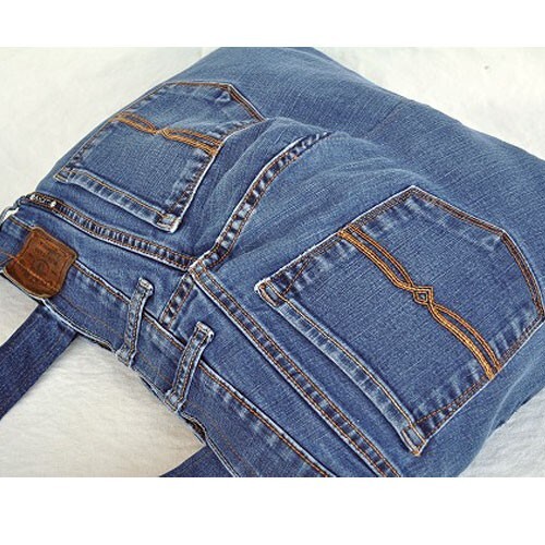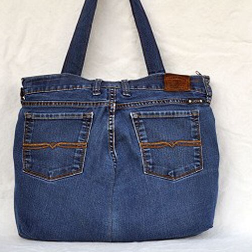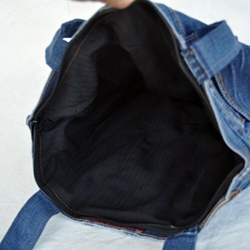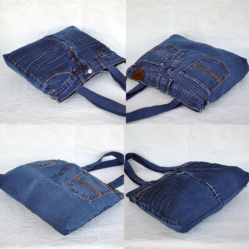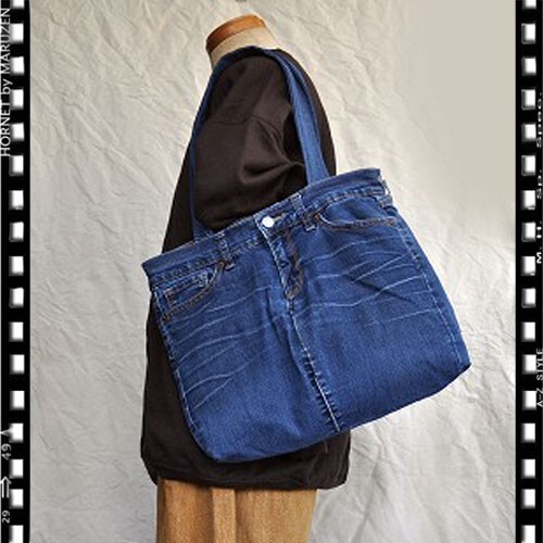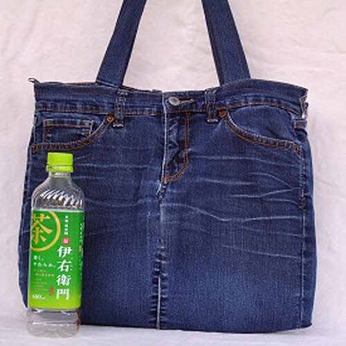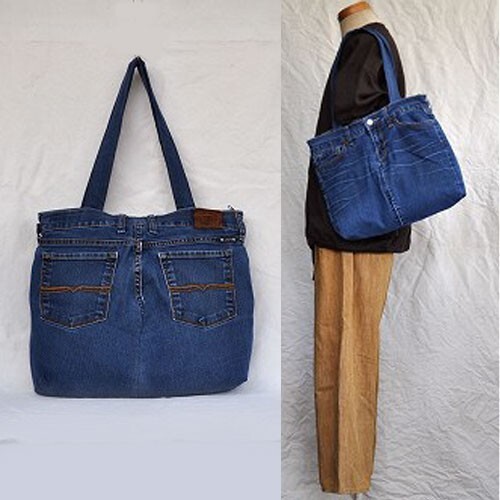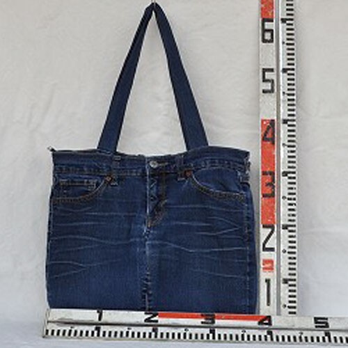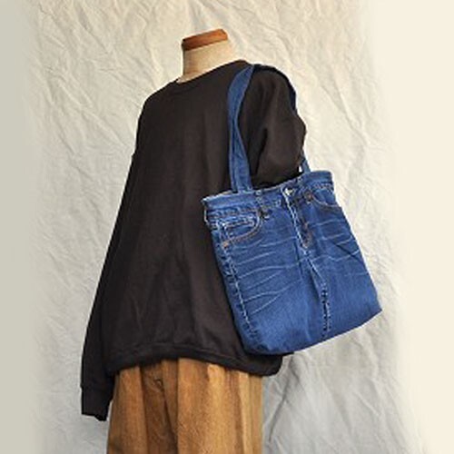 ▼アップサイクルデニムバッグ DB-10th113 ミディアムトートバッグ 中古リメイク 小さなポケットが多いバッグで便利