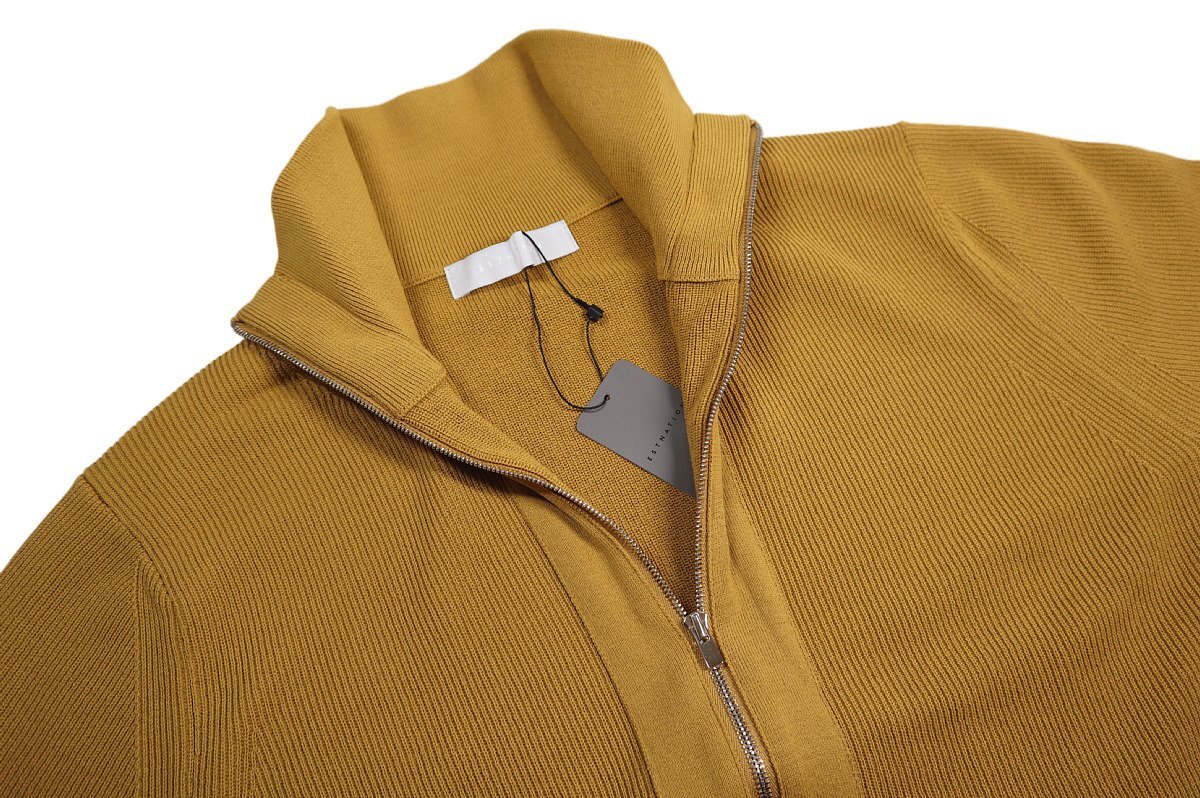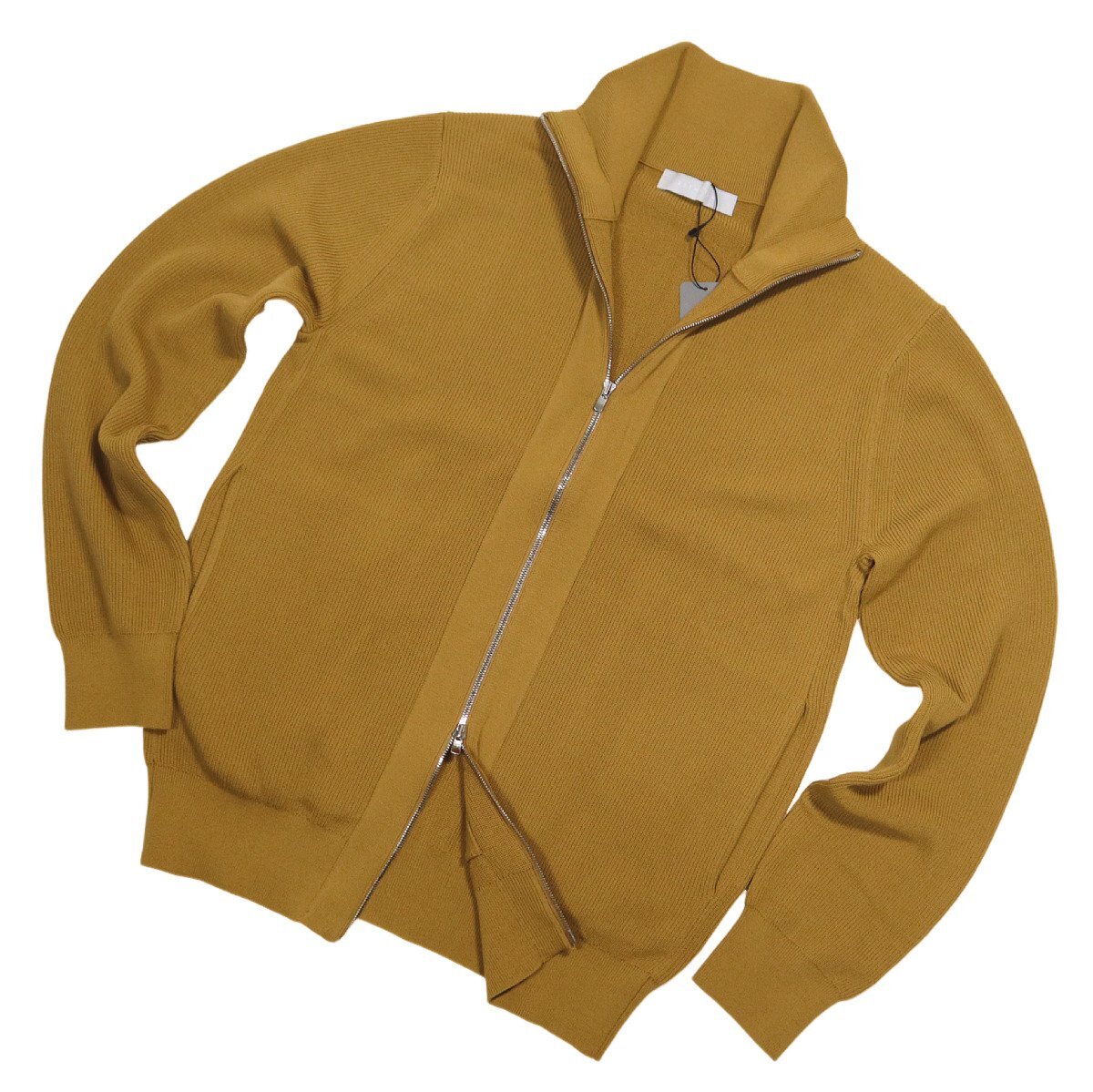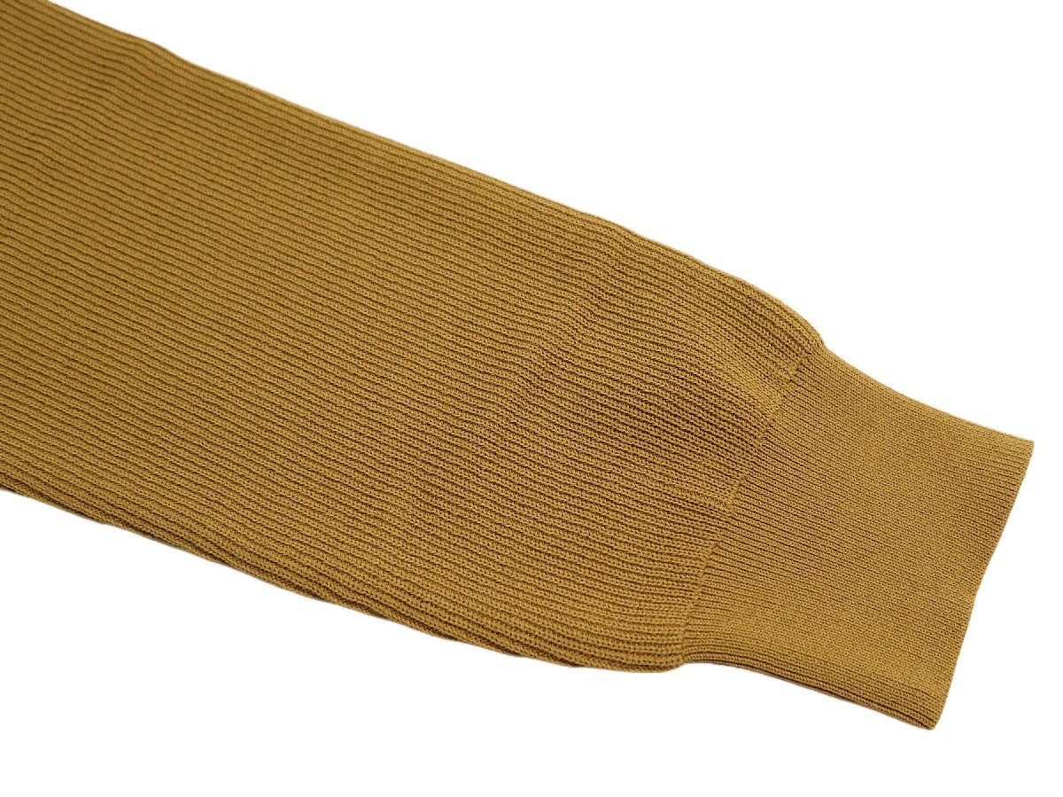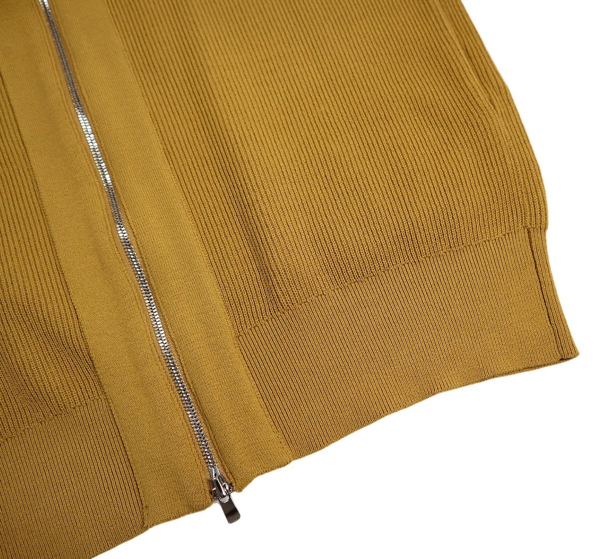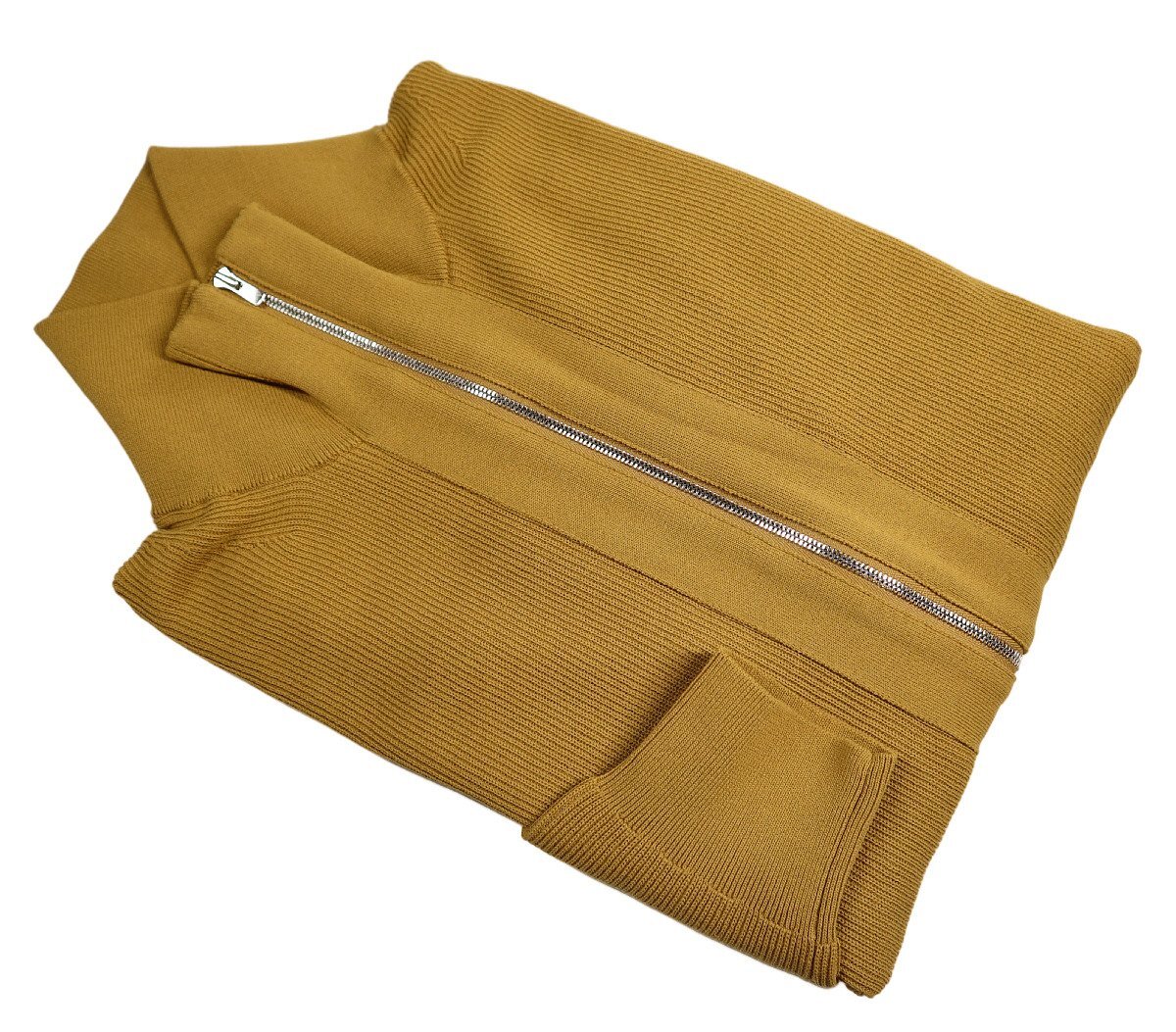 高機能ポリエステルとコットンの複合によるジャージーニット素材を使用した、明るめのキャメル色のリブ編み。輝きの美しいシルバーのダブルジップも上質感があります。