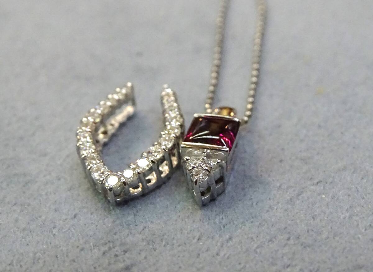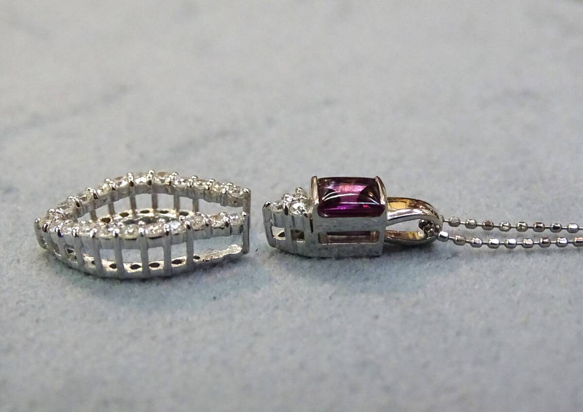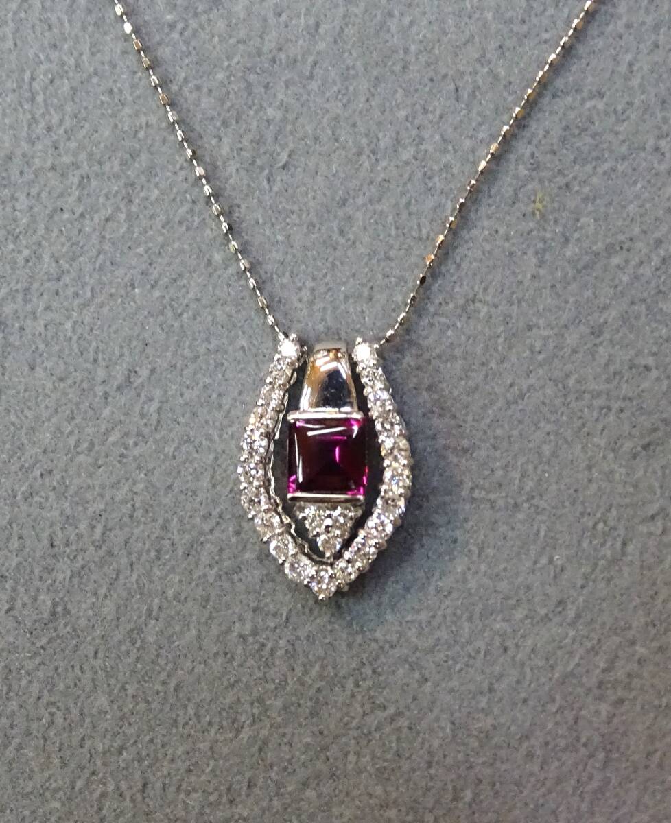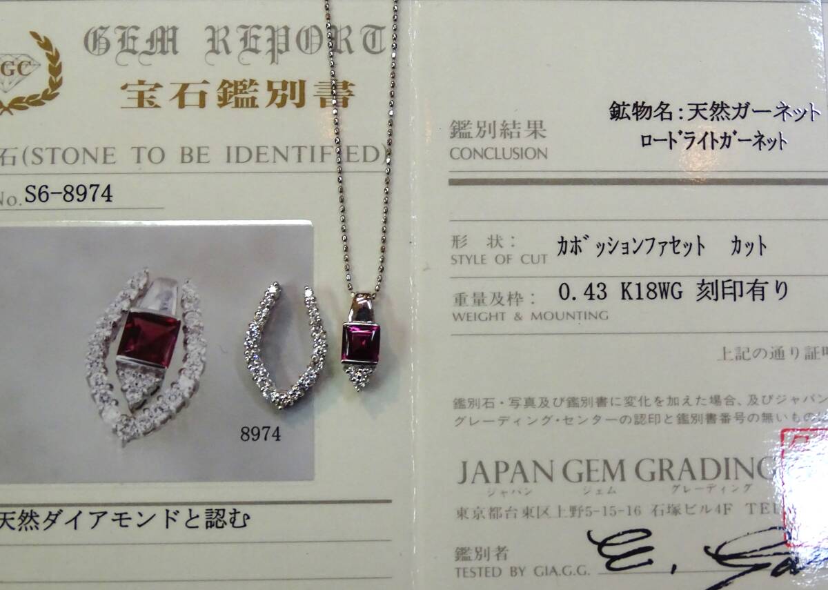 ♪【色・テリ・輝き・カット】等、すべてに【トップグレード】のガーネットの中でもピンクカラーが入った、特に綺麗な希少石!【天然:ロードライト・ガーネット:0.43c】を【K18WG】製の枠に、留めた、上品で個性的な【ペンダント】!また、【K18WG・天然ダイヤモンド】製の枠と、セットでも、単独でも使える【2Way】タイプですので、色々と変化を楽しめます! この機会に、ご自分へのご褒美に、大切な方へのプレゼントにもどうぞ! 年齢を問わず、どなたにもお似合いになります! ♪【ネックレス】は【Pt850】製【カットボール・ネックレス:45cmフリーサイズ・0.80㎜巾・45cmまで自由に長さを 調節出来るもの】が付いていますので、どんなお洋服にも合わせられます! *ネックレスは、ペンダントから外せますので、他のペンダントにも使えて便利です! 【総重量=4.1g(ペンダント=2.5g・ネックレス=1.6g)】(バチカン穴=3.5×1.8mm径) 【ペンダント=バチカンを含む縦巾=17.2mm・最大横巾=11.1mm・最大厚=5.4mm】 【ネックレス=Pt850・カットボール・45cmフリーサイズ・0.80mm巾】 *新品・未使用・本物。*鑑別書付き。 【送料・消費税・システム料・鑑別書・ケース、すべて無料!!】 ●注意●この商品は、他のサイトでも出品中ですので、万が一、そちらで落札された場合は、お譲り出来ないことをご了承下さ い。 **発送方法は、ヤマト便(送料:無料)です。指定配達日と時間指定出来ます。 **【商品代金について】 消費税・システム使用料・落札手数料・送料すべて込みです。 【お届けについて】 すべての商品の送料込みの値段です。 (1万円以上の商品はヤマト便・手渡し。1万円未満は配達記録郵便です。) 【ご返品について】 万が一、お届け商品が偽物・欠陥品・不良品のみ商品のお届け日から3日以内 の場合は、まず電話かメールでご連絡頂いた上で返品をお受けします。 ご落札者様のご都合(イメージが違う・入札商品、入札価格の入れ間違い)での ご返品の場合は、落札手数料及びシステム使用料・送料をご負担頂きます。 また、事前にご連絡の無い場合・4日以上経過しての返品・使用後の返品・ サイズ直し後のご返品は、一切お受け出来ませんのでご理解下さい。 【キャンセルの場合】 ご落札後のキャンセルは、ヤフー評価システムにより自動的に【悪い評価】が ご落札者に付いてしまいます。ご理解の上のご入札・ご落札をお願いします。