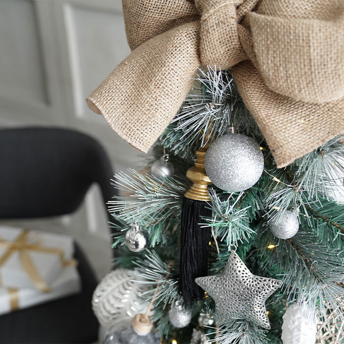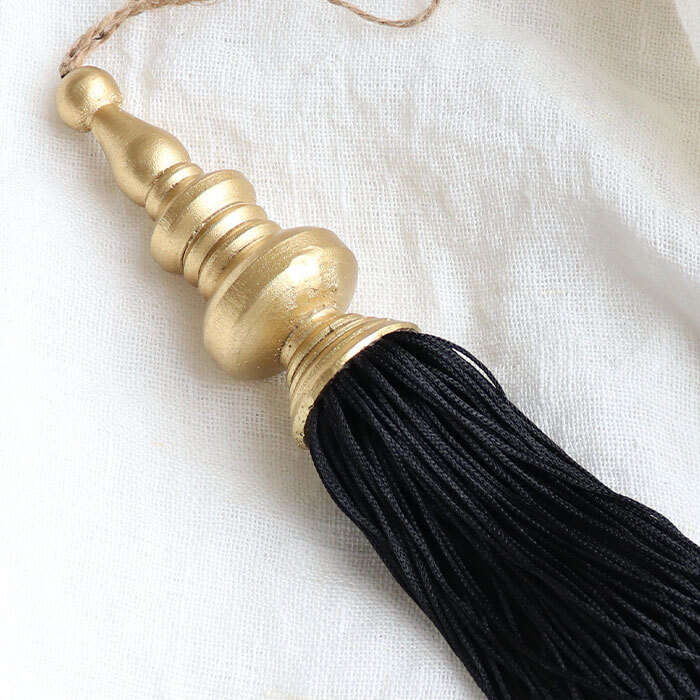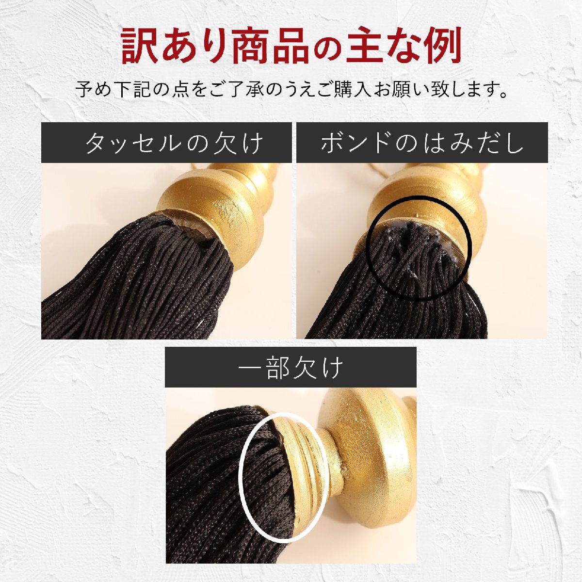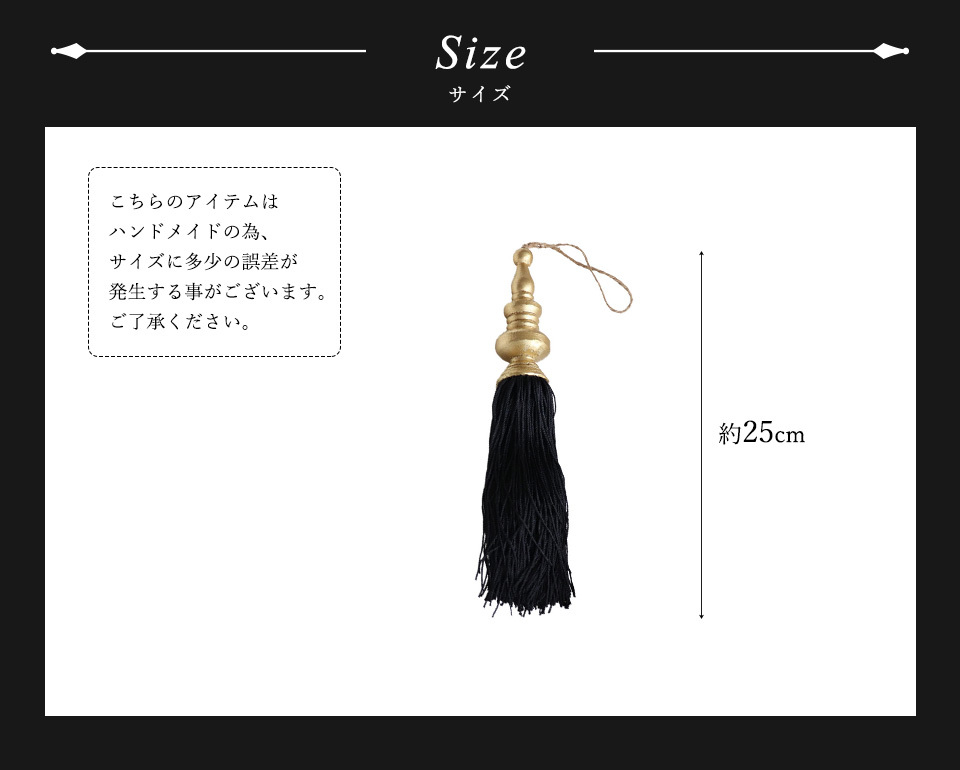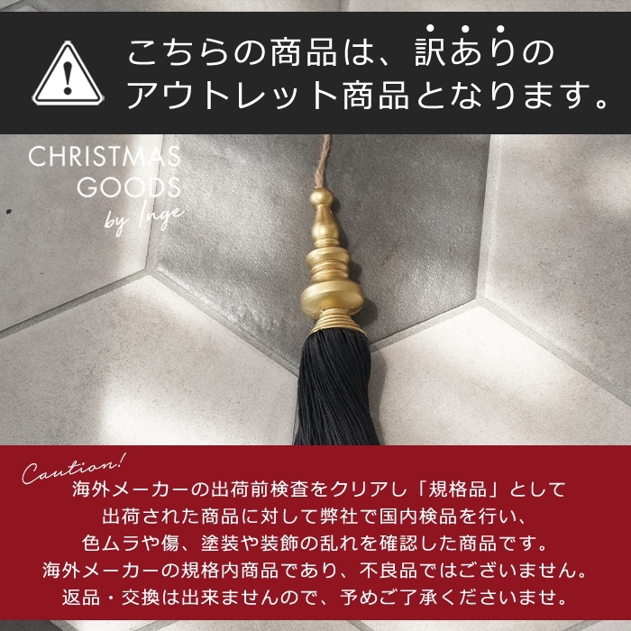 ★【こちらは訳ありのアウトレット商品です。】 欧州メーカーの出荷前検査をクリアし「規格品」として出荷された商品に対して弊社で国内検品を行い、色ムラや傷、塗装や装飾の乱れを確認した商品です。 欧州メーカーの規格内商品であり、不良品ではございません。返品・交換は出来ませんので、予めご了承くださいませ。 上品な華やかさでクリスマスツリーをドレスアップさせてくれるタッセルオーナメント。 落ち着きのあるブラックカラーがツリーに程よい品格を添えてくれます。 長めに取ったタッセルの落ち感が不思議と優雅な雰囲気を漂わせるお洒落なデザインです。 クリスマスツリーを大人の気品漂うエレガントな雰囲気や、重厚でクラシカルな雰囲気に仕上げたい方におすすめです。 ツリーにもう少し華やかさをプラスしたい方や、あと一つ物足りなさを感じている方にもぜひ取り入れていただきたいアイテムです。 季節を問わずお楽しみいただけるデザインなので、クリスマスの時期が過ぎてもお部屋のインテリアとしてお使いいただけます。玄関先やリビングの壁に掛けてウォールデコレーションを楽しんだり、ドアノブや花瓶、お気に入りの小物類などに掛けてアレンジしたり、様々な用途でご使用いただけます。 サイズは高さが約23cmです。 | |