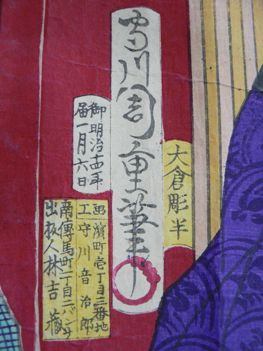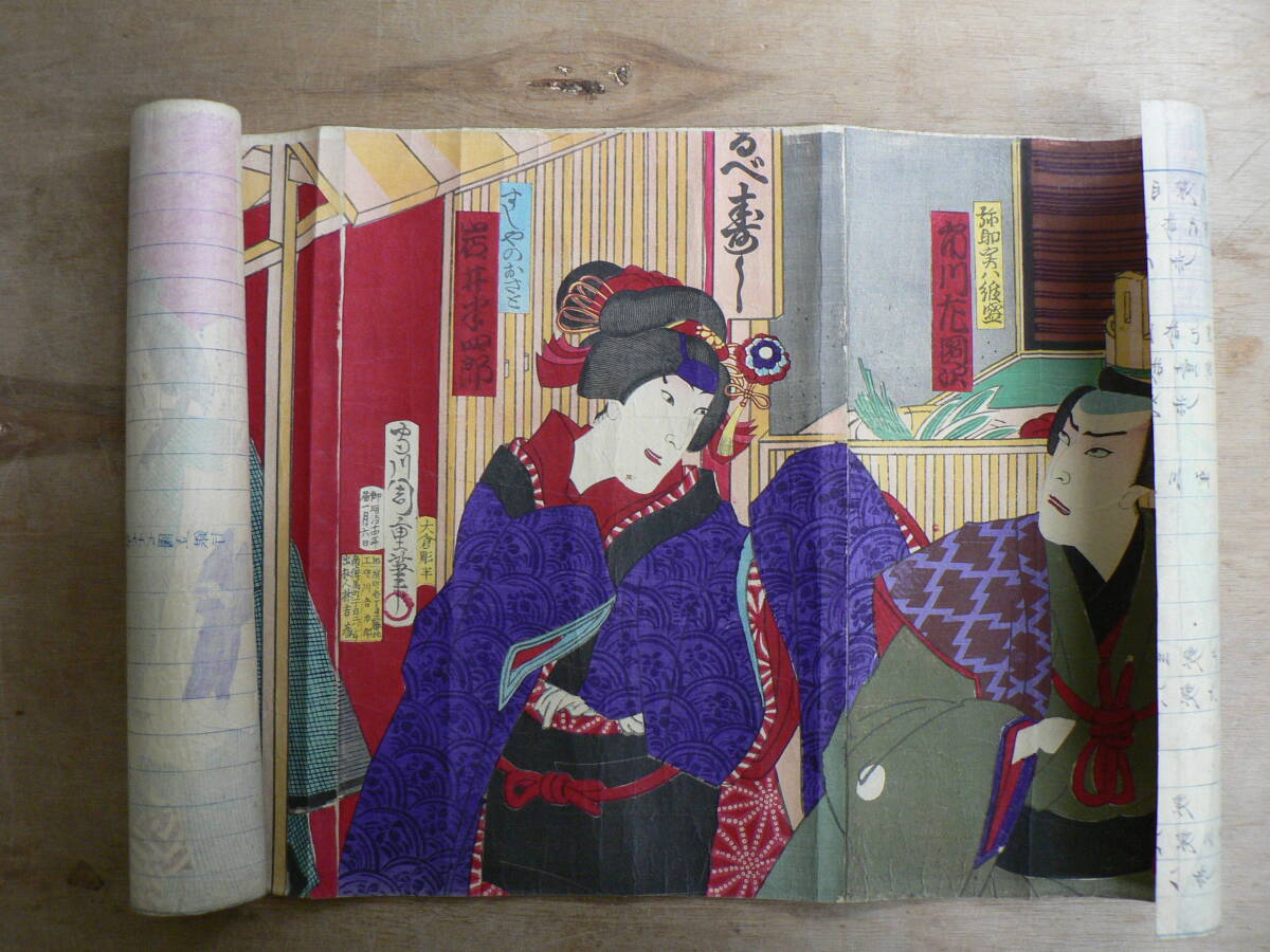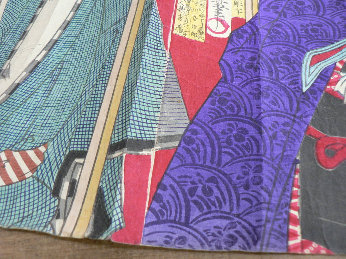 真作 錦絵 守川周重 市川左団次 尾上菊五郎 岩井半四郎 弥助実ハ維盛 いがみの權太 すしやのおさと 明治14年 木版画 浮世絵 役所絵 a033 |
