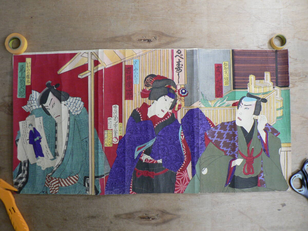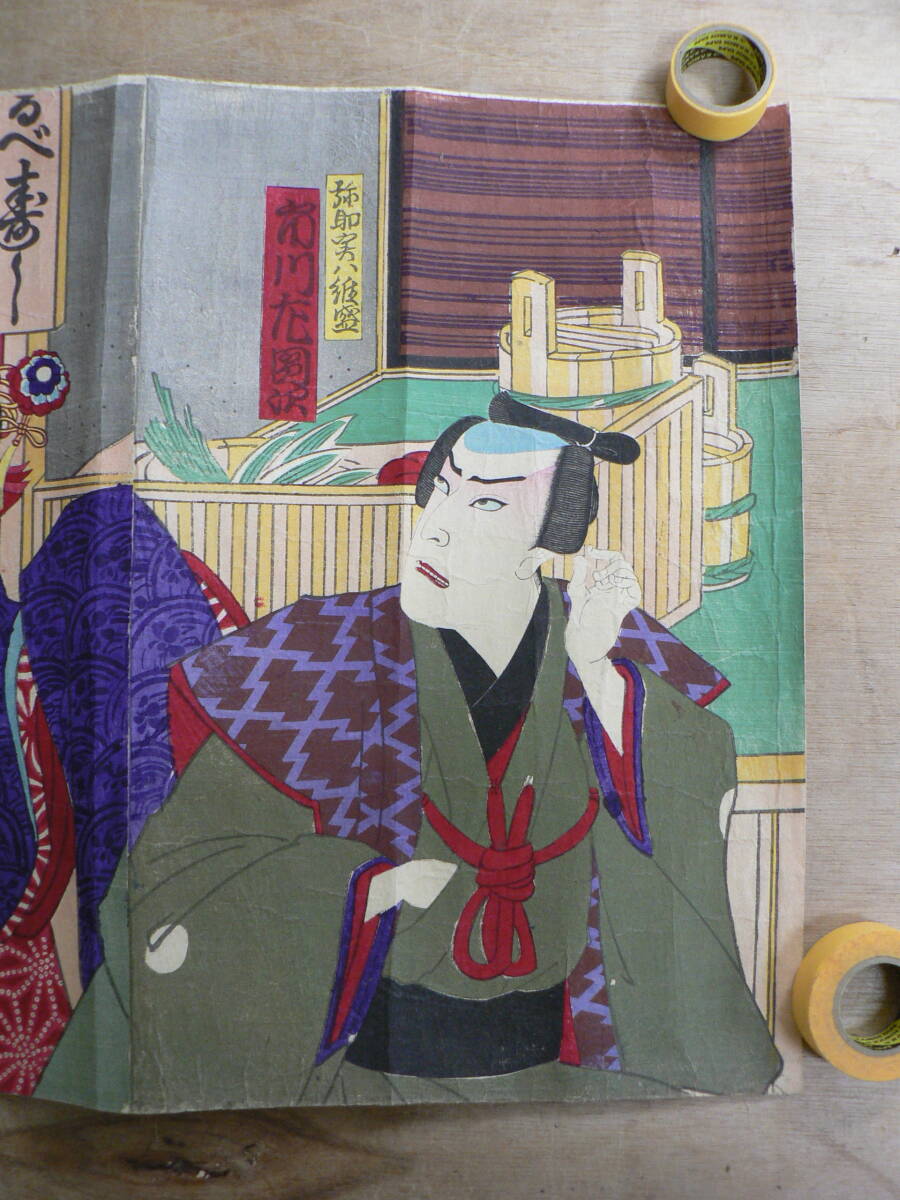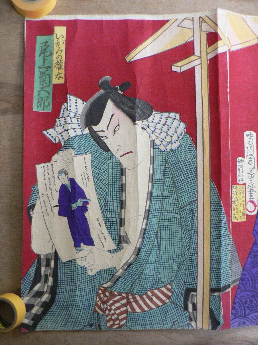 真作 錦絵 守川周重 市川左団次 尾上菊五郎 岩井半四郎 弥助実ハ維盛 いがみの權太 すしやのおさと 明治14年 木版画 浮世絵 役所絵 a033 |