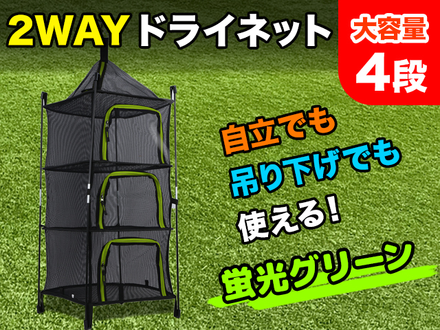 【立体ドライネット】自立&吊り下げ式2WAYのドライネットです。平面に自立させたり、木の枝に吊り下げたり、環境に応じて使い分けができます。 【大容量4段】4段あるので多くの食器や食材などを乾燥できます。また、全段開け口の広いジッパー付きなので、大きめのお皿や調理器具なども出し入れできます。 【衛生面も安心】きめ細かな通気性の高いメッシュ素材が、虫やホコリの侵入を防ぎます。 【コンパクト】専用収納袋にコンパクトに収納でき持ち運びもらくらく。またフラットなので収納場所も取りません。 【商品詳細】◆パッケージ内容…2WAYドライネット、ボール、専用収納袋、◆サイズ…組み立て時:幅39cmx高さ92cm(吊り下げ用ベルト8cm)収納時:47cmx45cm ※数センチの誤差があります。、◆カラーバリエーション(4色):レッド、蛍光グリーン、ブラック、クリーム |
