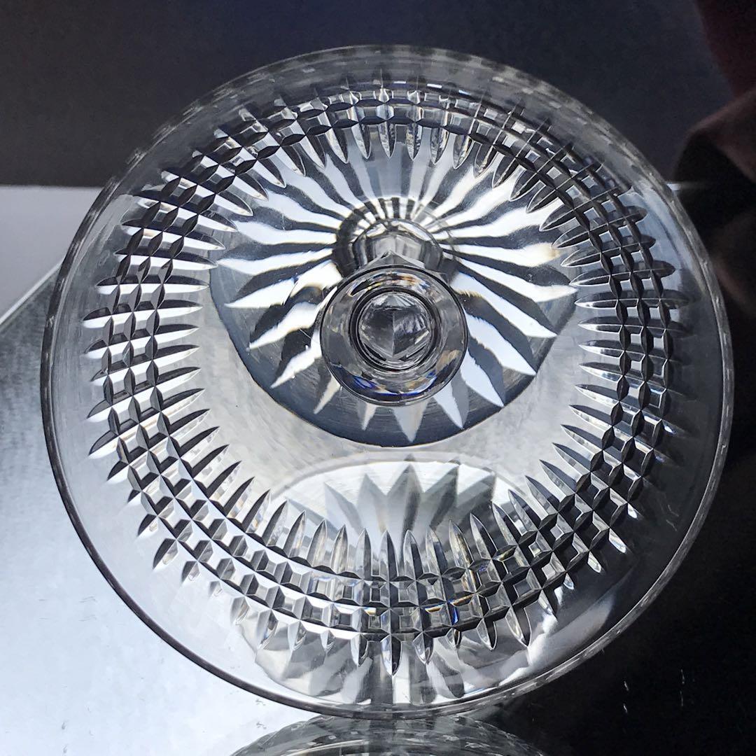 クリスタルガラスに施された丁寧な縦横のカットが光を集めて