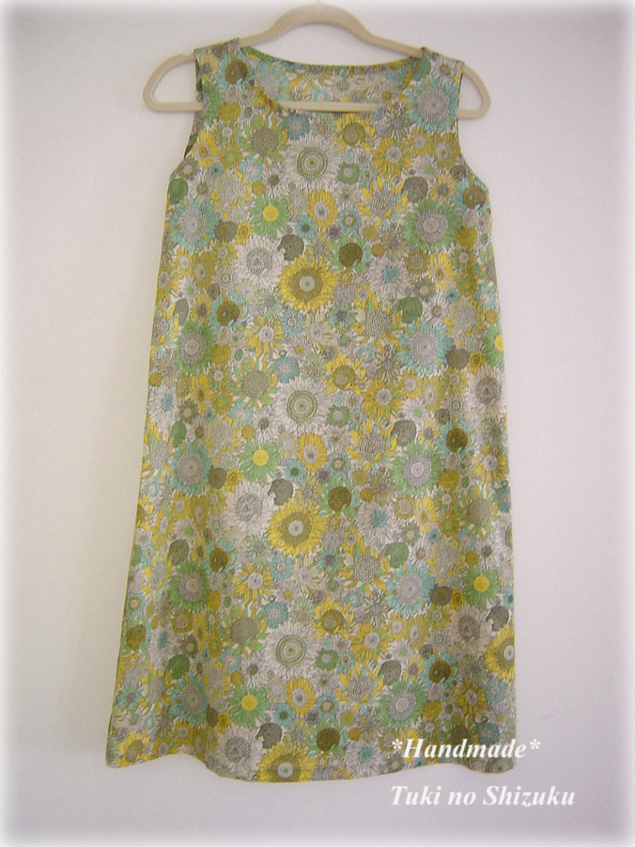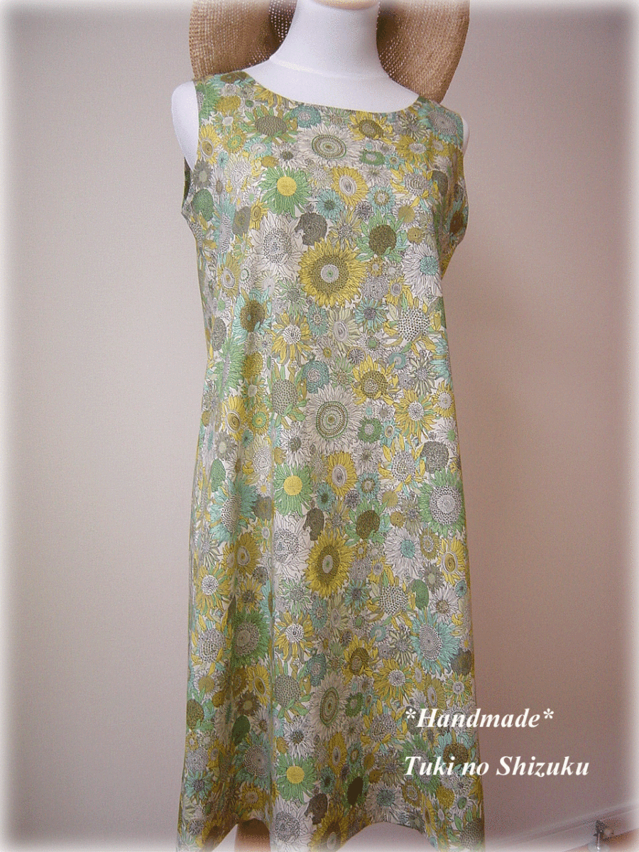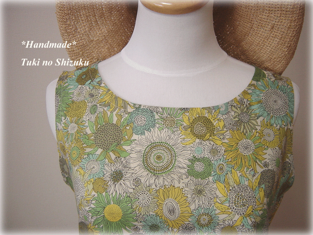 | ********************* ****** 商品説明 ****** ********************* アトリエ*月の滴*の作品をご覧いただき ありがとうございます (^ ^) リバティ生地でワンピースを ハンドメイドいたします♪ シルクのような手触りと、お色の綺麗さから 人気のある、高級素材のリバティのタナローン コットン100%の生地を使います。 柄は「スモールスザンナ」です。 イエロー系の中に、グリーンや水色が入り 春夏にぴったりのひまわり柄です。 お色違いのパープル、ピンク、ブルーでも お仕立てできます。 デザインは「シンプルAラインワンピース」♪ タックやギャザーなどを入れず、 適度に裾幅をおさえたAラインですので パンツやレギンスなどにも合わせやすく シンプルですっきりとしたワンピースです。 ボートネックに近い感じのラウンドネックで 胸元が気にならず、安心感があります。 楽な着心地で、上品に見えるのは さすが、「リバティ」です。 一度、手にしたら手放せない 極上の生地かと思います♪ ********************* ********************* |