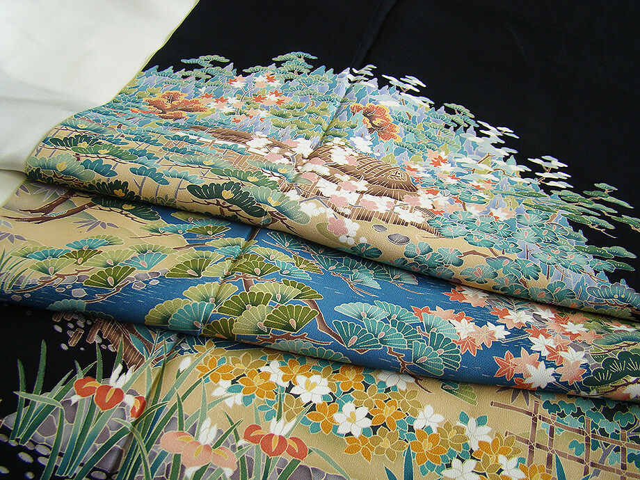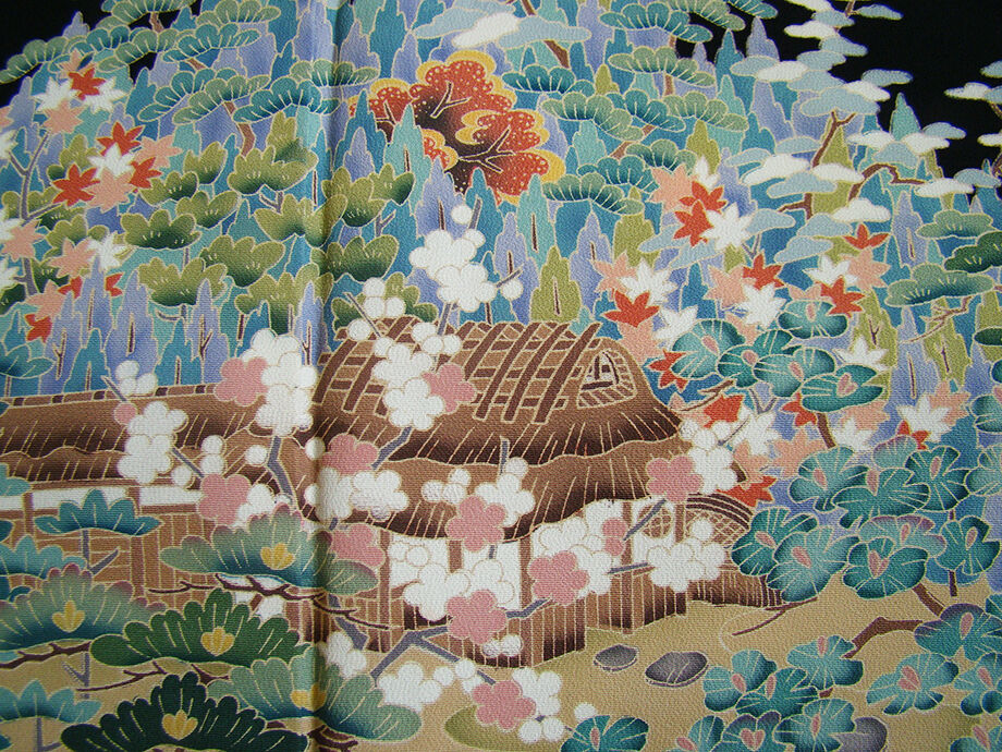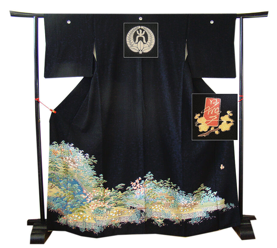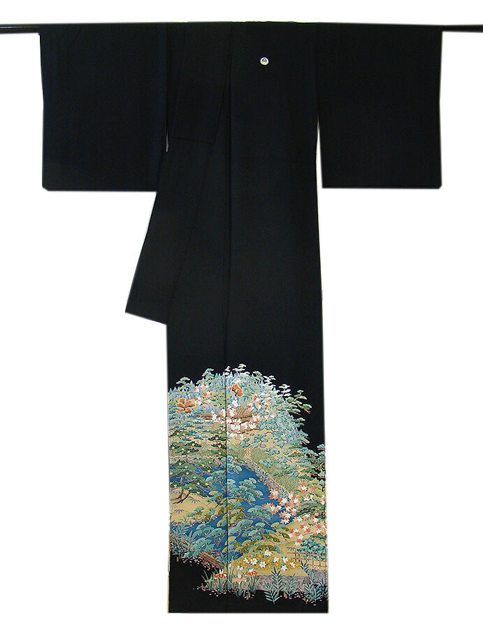 商品説明 | 大変にしなやかな手触りのしっとりとした柔らかな極上の着心地を誘う重厚感溢れる 重めの極上ちりめん地の生地の黒留袖。 黒色地に松竹梅や四季の花木、家屋等の日本庭園柄の染柄、 比翼仕立て。 五ヶ紋。 裄が少し長め。 作家物、落款入り。 |