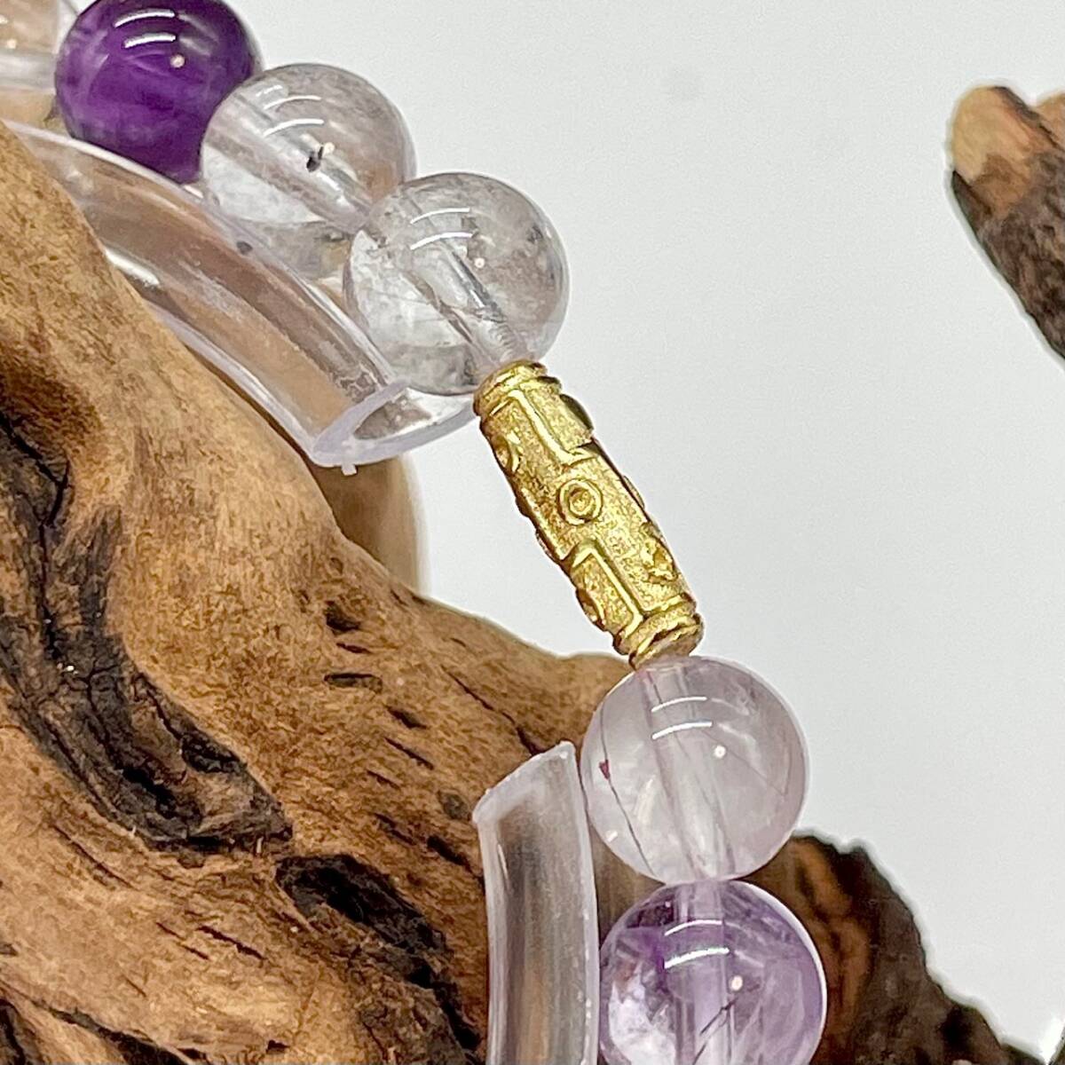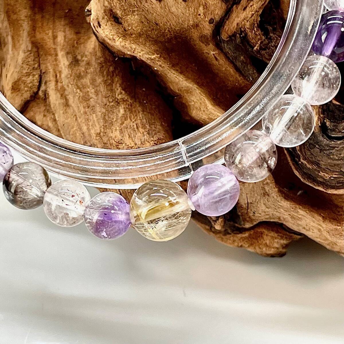 周りには、強力な7つのエネルギーを纏うことから最強のパワーストーンと呼ばれるスーパーセブン、優しい透明感と照りを持つ玉を繋ぎました。