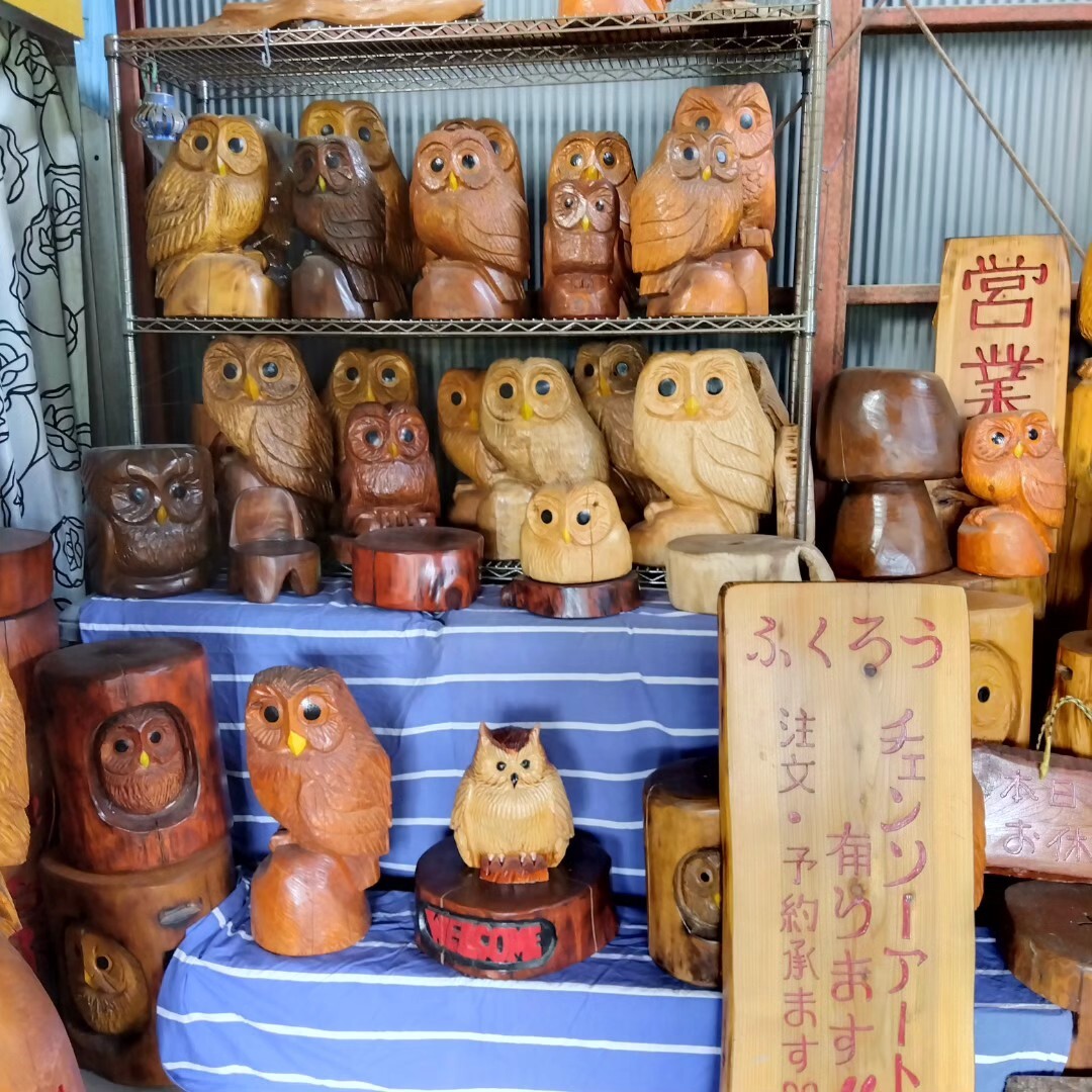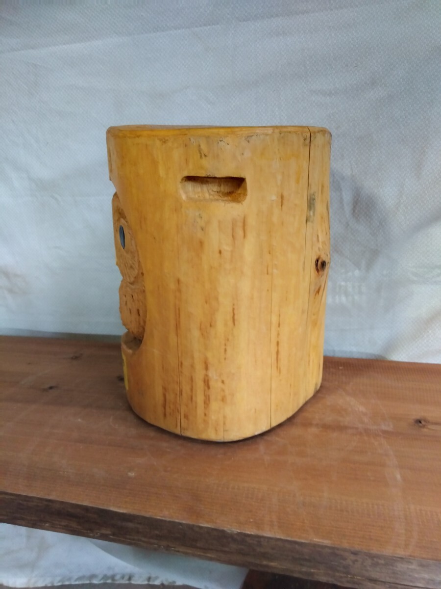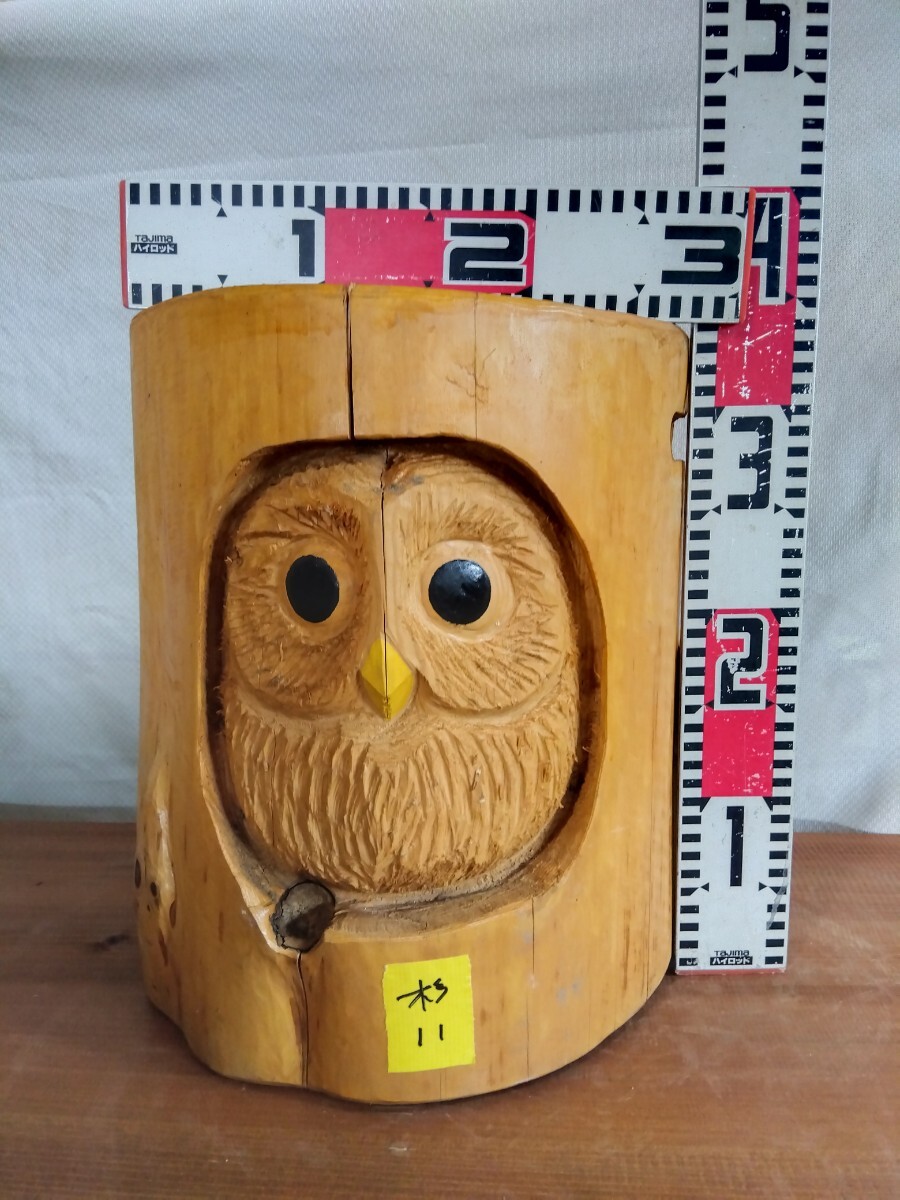 裏山の杉の木(すぎ)を整備兼ねて、伐った材でチェンソーアートで自作したフクロウに成ります。木材特有の割れやヒビや腐れ有ったり、今後出たりしますので、自然木の特性、理解頂ける方にお願いします。8枚目以降は工房兼作業場風景に成ります。多数、展示、販売してますので、お出掛け出来る方は、工房に見学大歓迎ですから、質問より予約後にお越し下さい。本来、現物を観て購入して欲しいのですが、遠方の方で、探されている方に、画像から、ご判断、ご納得いただける方居ましたら、宜しくお願いします。発送はおてがる配送の100サイズに成ります。尚、土、日、祝日はフリーマーケットやハンドメイドマーケット出店の場合、翌日の発送に成ります。また、即決価格ですから、タイミングみてご購入いただければ、スムーズな発送出来ます。宜しくお願いします。ありがとうございます。