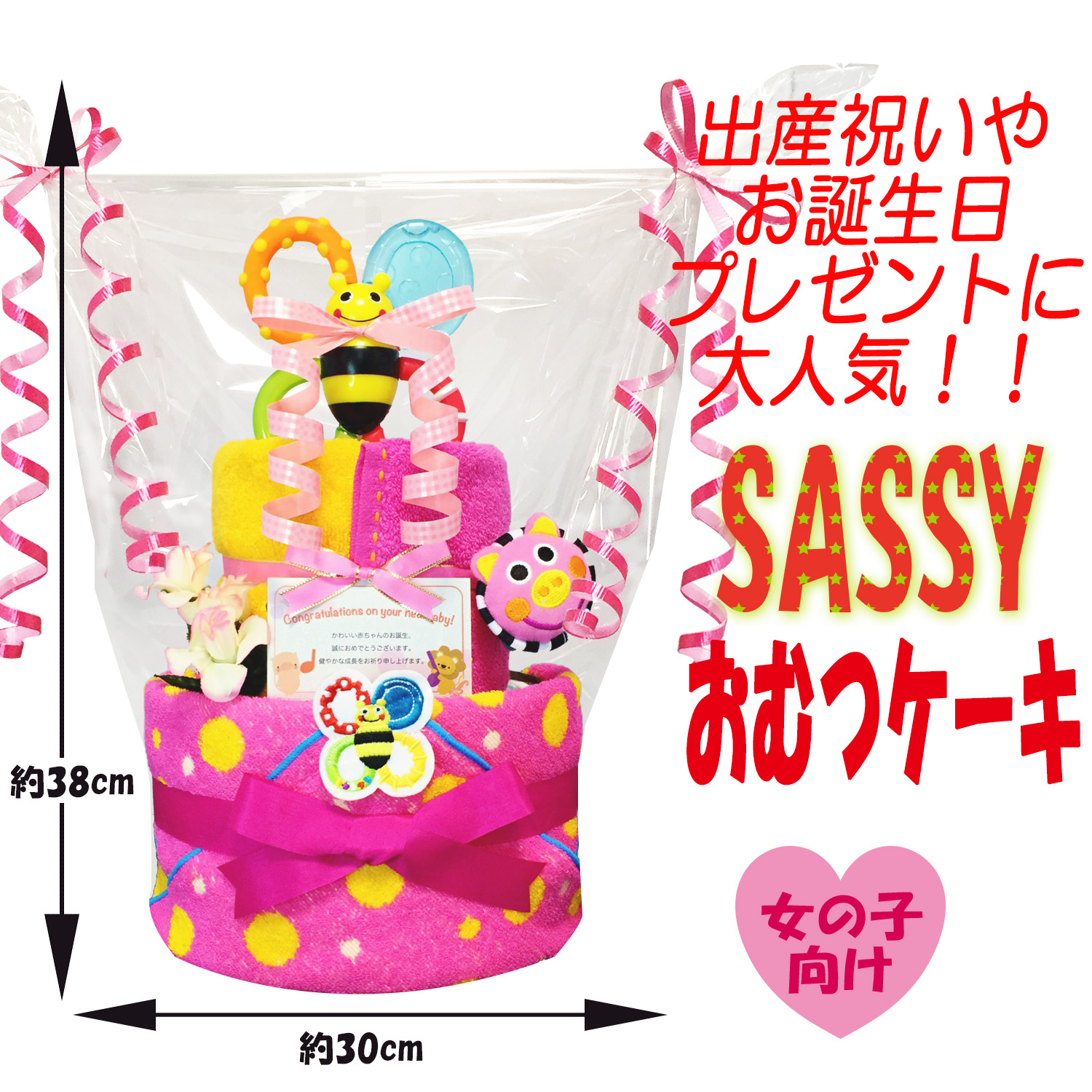 子供達に大人気のSassy/サッシーのタオルや歯固めなどを1つ1つ丁寧に取り付け手作りされたおむつケーキのギフトです♪ 大人気のSassy/サッシーとパンパースの組み合わせで豪華なおむつケーキになっております。出産祝いやお誕生日プレゼントに大変喜ばれるギフトです。 ギフト用にラッピングを施し、可愛いギフトボックスにお入れしてお送りいたします。 おむつケーキに使われているおむつはお届け先の赤ちゃんやお母様にも安心していただける様に、衛生面にも考慮し、手を洗った後に手袋を着用し、1枚1枚個別包装してありますので、ホコリや湿気をしかっりガードいたします。 そのままお出かけにも持ち運べます。 ご購入していただいたお客様に満足して頂くことはもちろん、贈り先の赤ちゃんやお母さん、お父さんの幸せを願ってお作りいたしております。 |