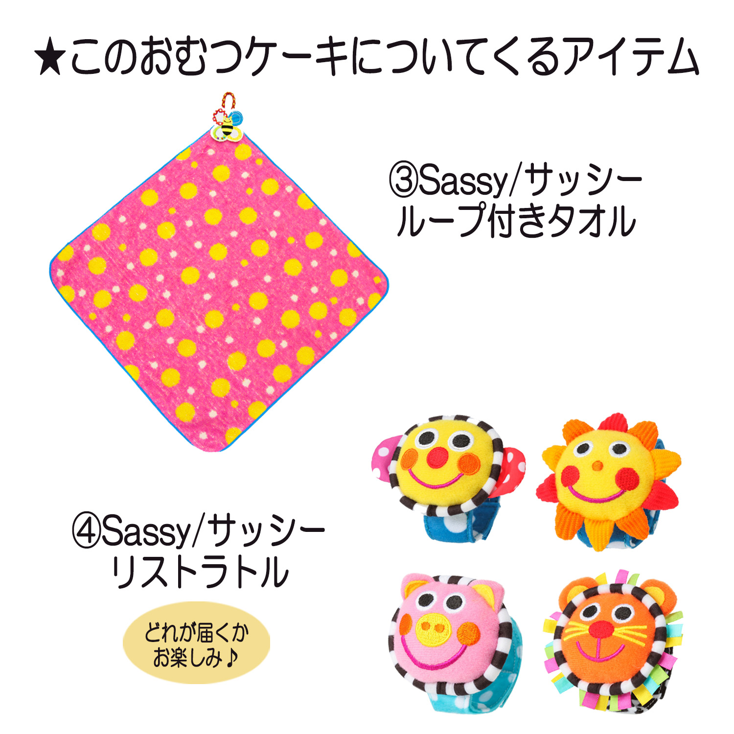 ●Sassy/サッシー ループ付きタオル ×1 ●Sassy/サッシー ミニタオル ×2 ●Sassy/サッシー リストラトル ×1 ●Sassy/サッシー バンブルバイツ(歯固め)×1 ●パンパース テープタイプSサイズ 22枚 or Mサイズ 19枚 ●デザインギフトボックス ●メッセージカード ●ギフトラッピング ●造花 ※造花、リボンのお色は弊社スタッフのコーディネートになりますので、画像とは異なる場合がございます |