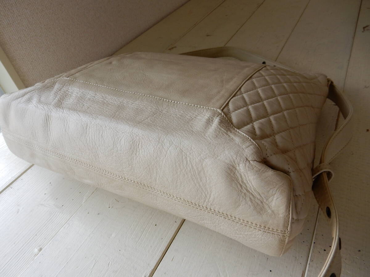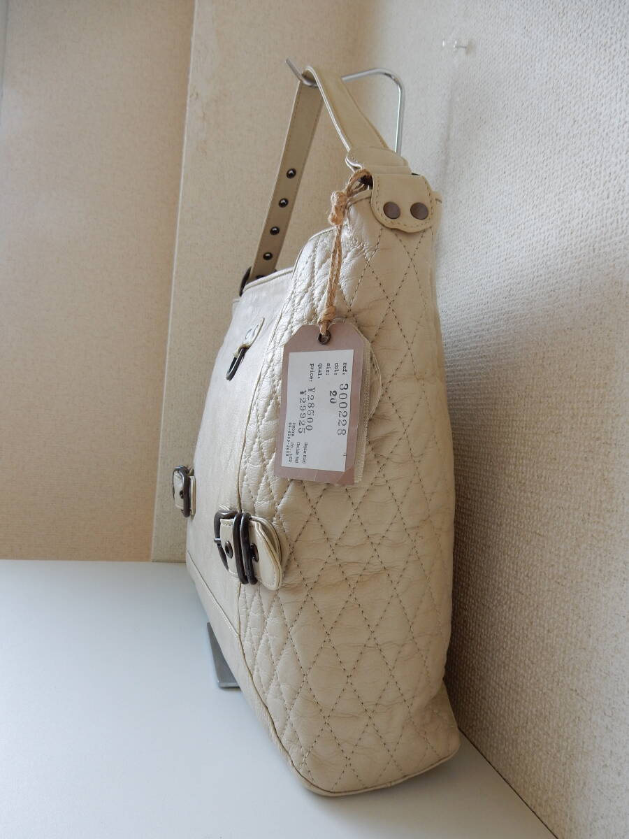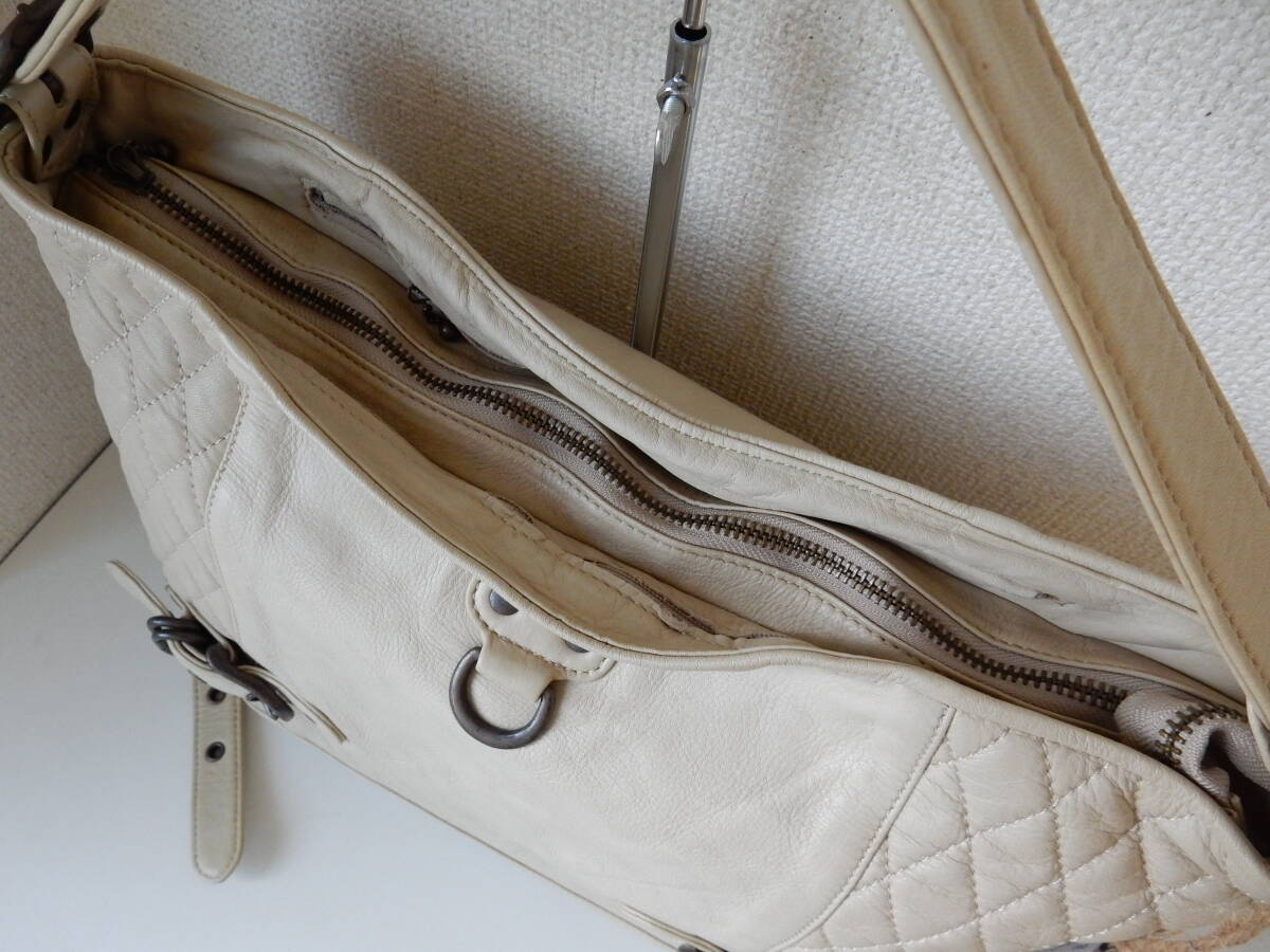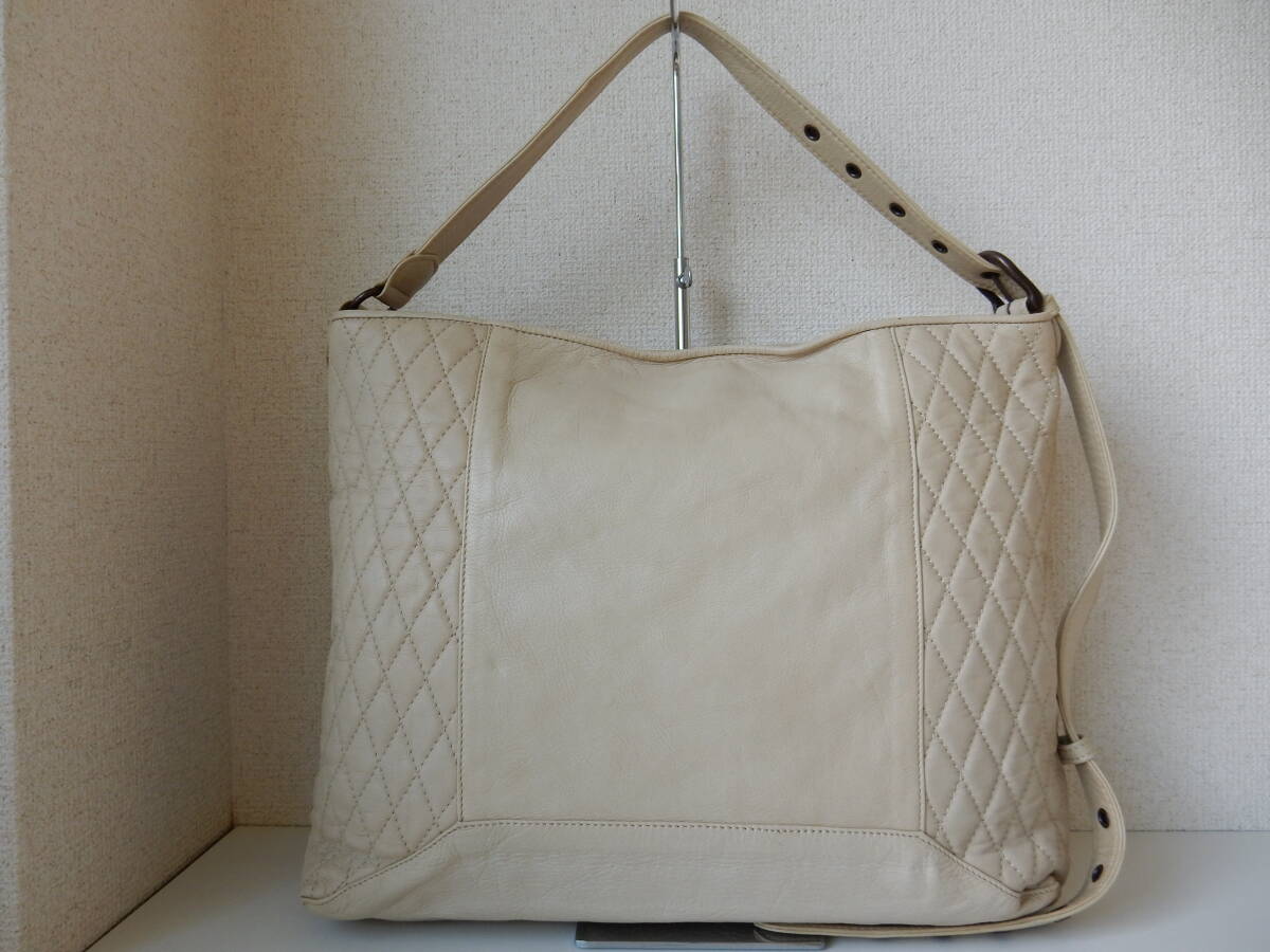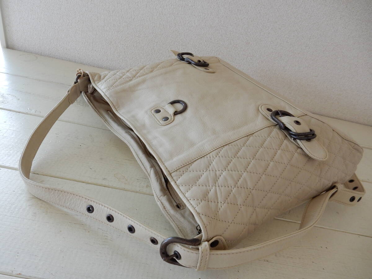 キルティングレザーにベルト使いがアクセントとなった本革ショルダーバッグ。