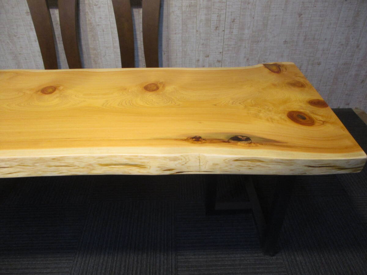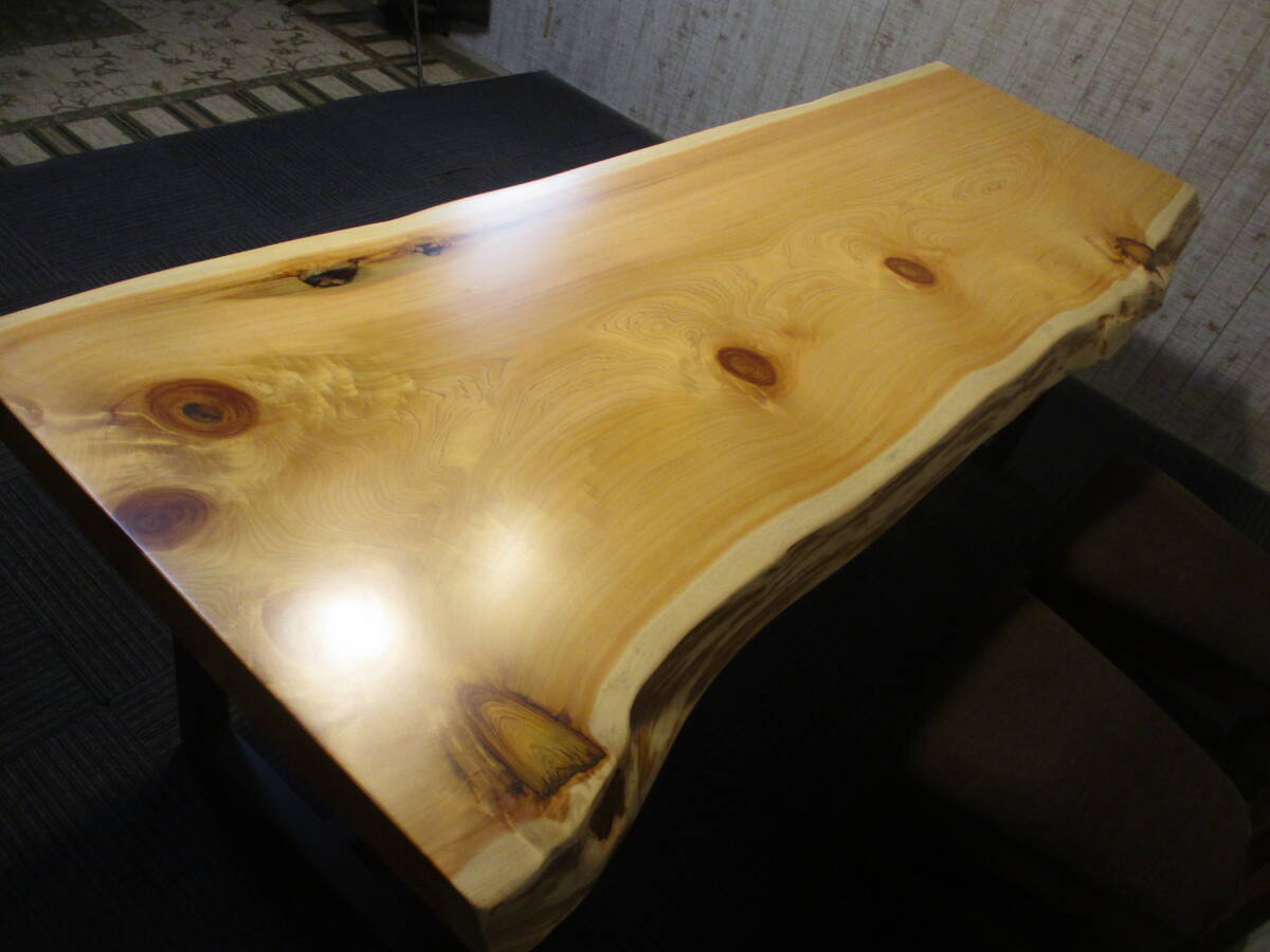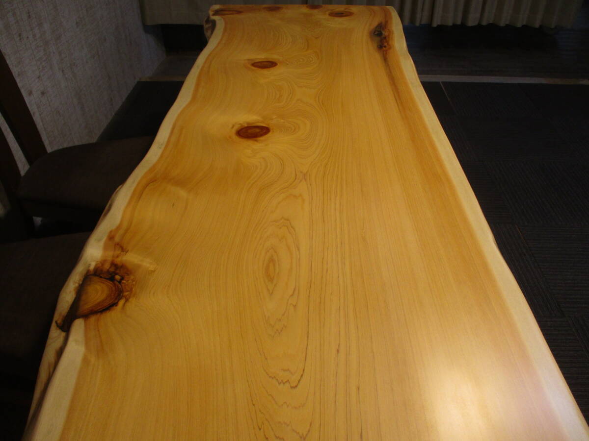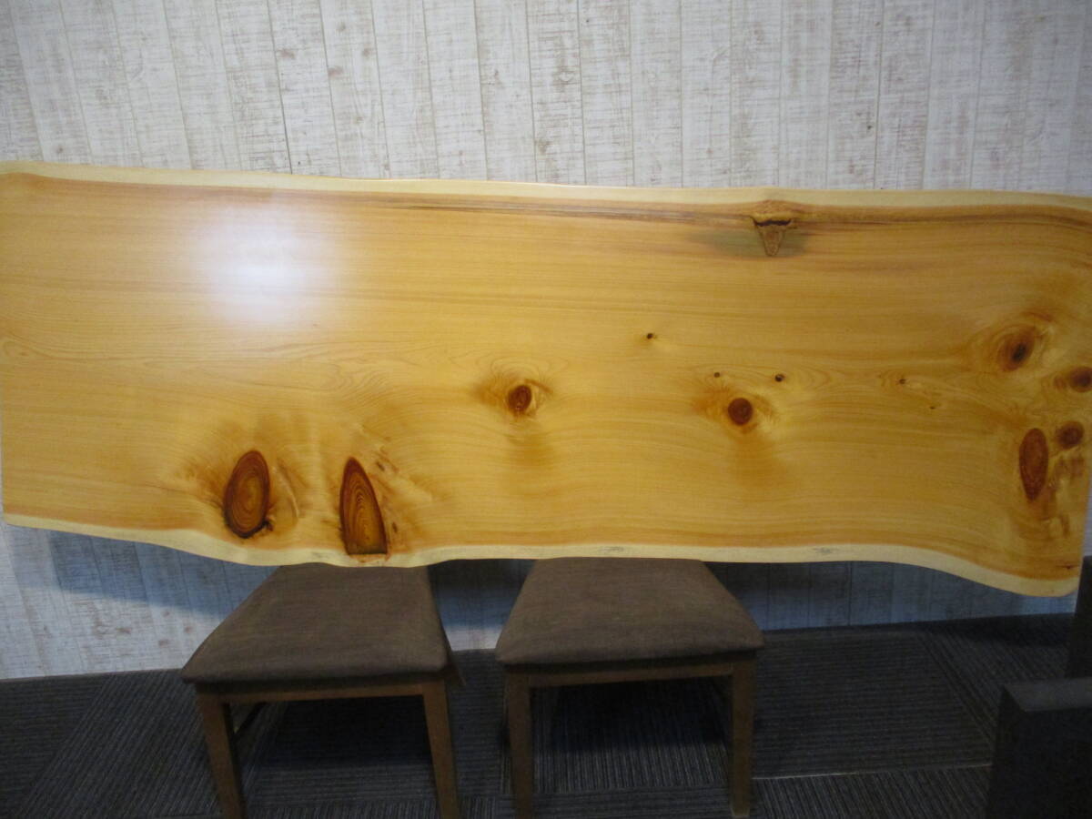 桧の一枚板無垢のテーブルです。奥行きのある檜です。稀少材です。檜はその節が魅力です。厚みもあり、ずっしりして高級感があります。長さはカットできます。