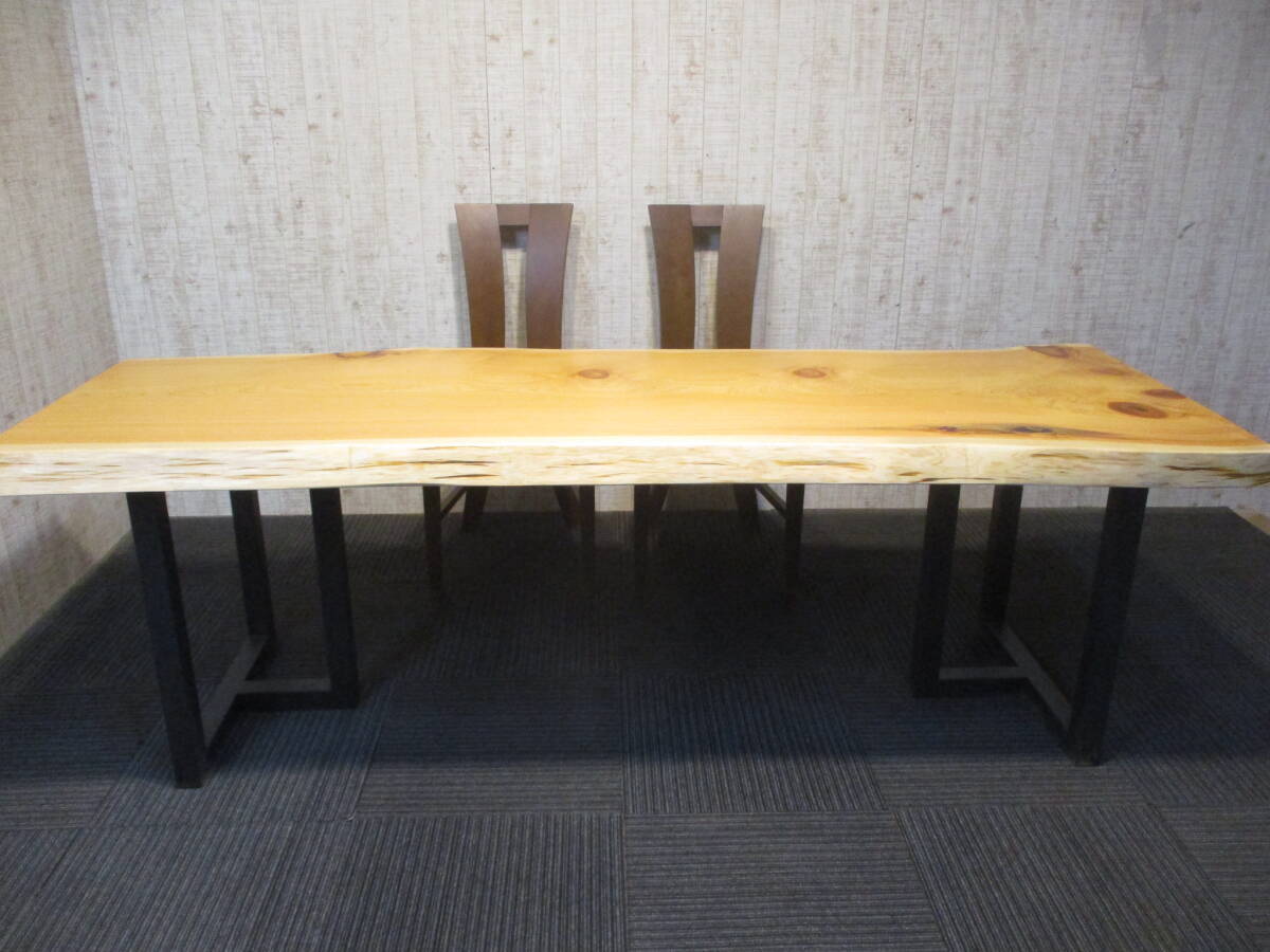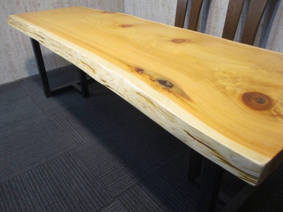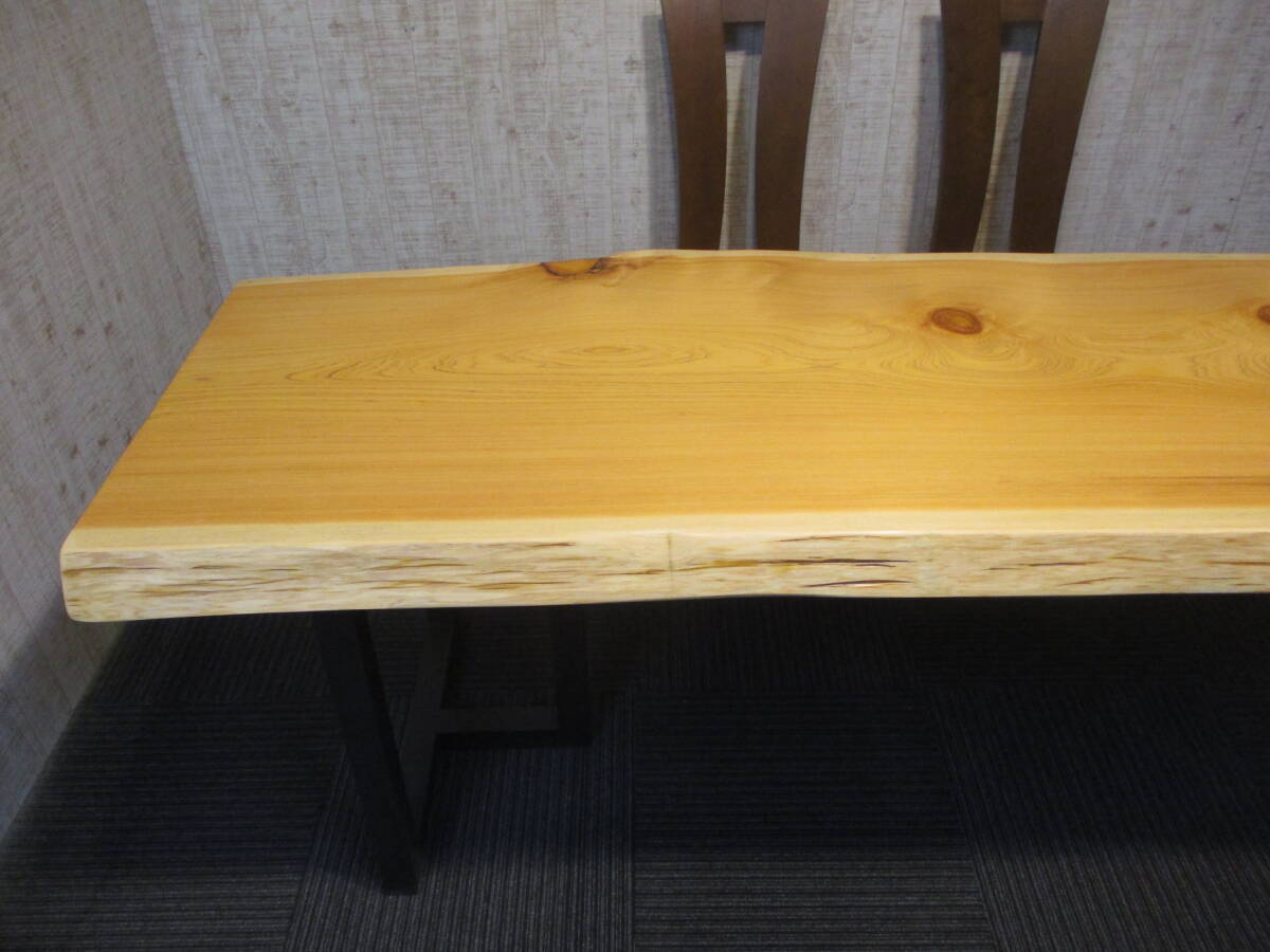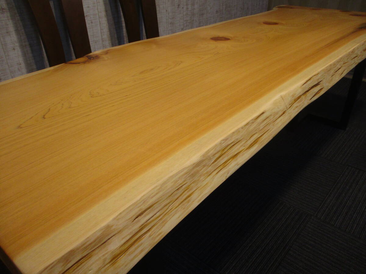 桧の一枚板無垢のテーブルです。奥行きのある檜です。稀少材です。檜はその節が魅力です。厚みもあり、ずっしりして高級感があります。長さはカットできます。