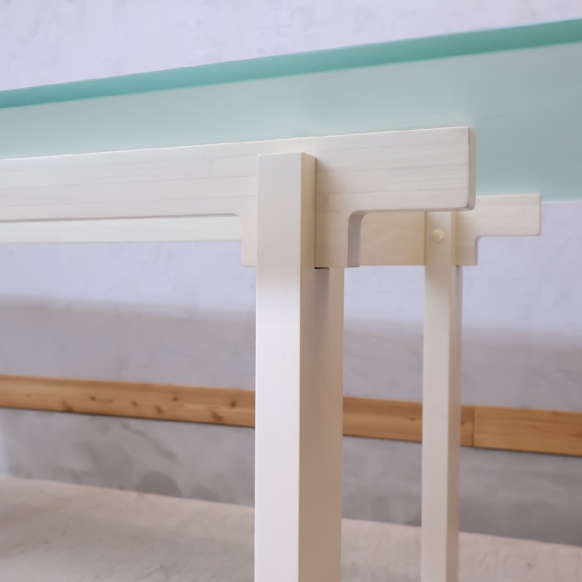 伝統的な木組みを使ったラバーウッドのフレームは爽やかなホワイト。