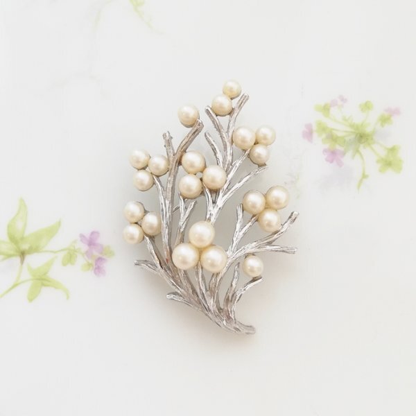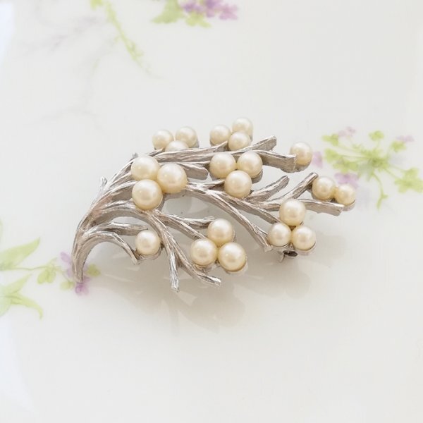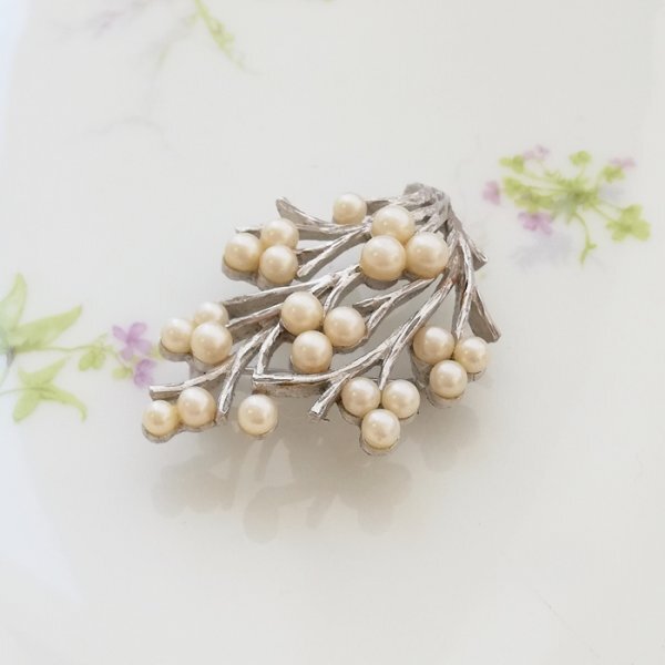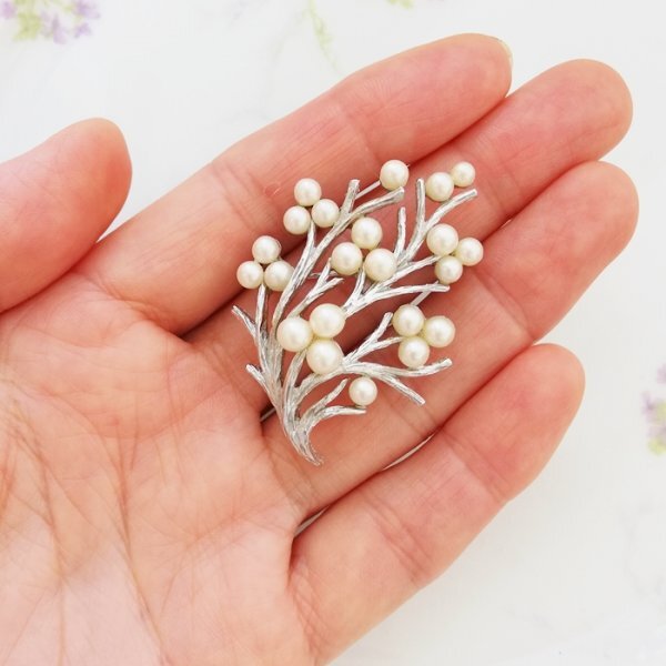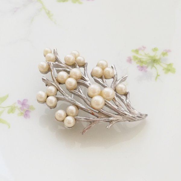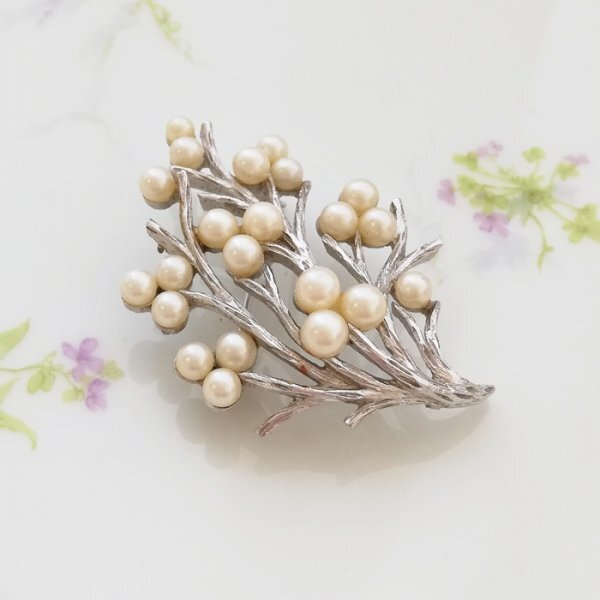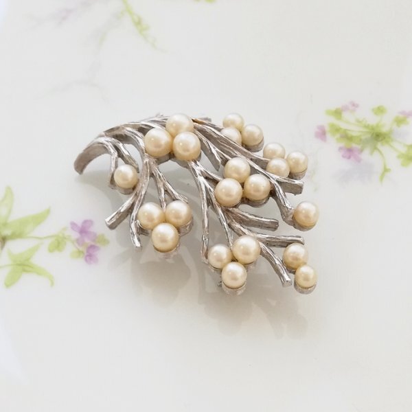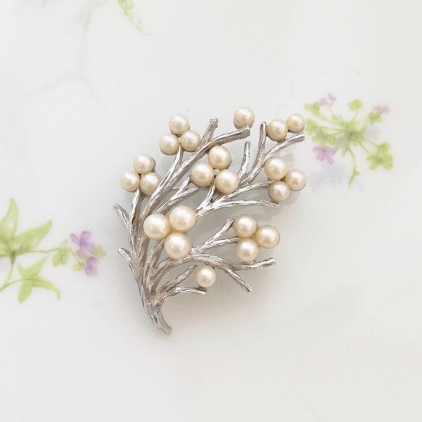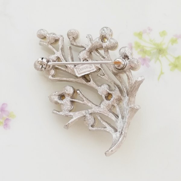 アメリカのコスチュームジュエリーメーカー、Trifariのブローチのご紹介です。 シルバートーンのツリーモチーフのブローチです。 繊細なシルバーメタルの枝にフェイクパールがセットされていて、エレガント雰囲気です。 お洋服以外にも帽子や鞄のアクセントにもどうぞ。 経年の為、パールに多少の小キズやピーリングが見られます。 ■ブランド: TRIFARI ■刻印: TRIFARI© ■サイズ: 約5㎝ x 約3.5㎝ ■重量: 約12g アンティーク・ヴィンテージ商品には、経年による傷や劣化などがあります。 目立つものはアイテムの詳細に記載しておりますが、説明以外にもキズや損傷などがある場合がございます。 古いものですので、ご理解いただける方のみご入札下さいませ。 他サイトでも販売しておりますので、同時にご注文があった場合は、品切れの場合もあります。その場合は、大変申し訳ございませんが、ご注文をキャンセルとさせて頂きます事をご了承くださいます様お願いいたします。 | |||