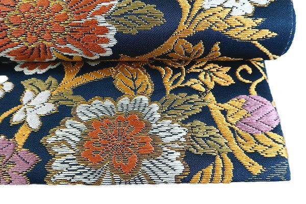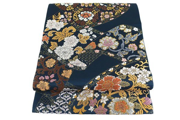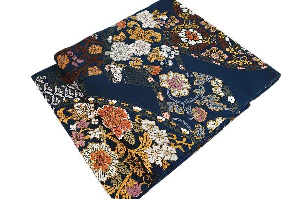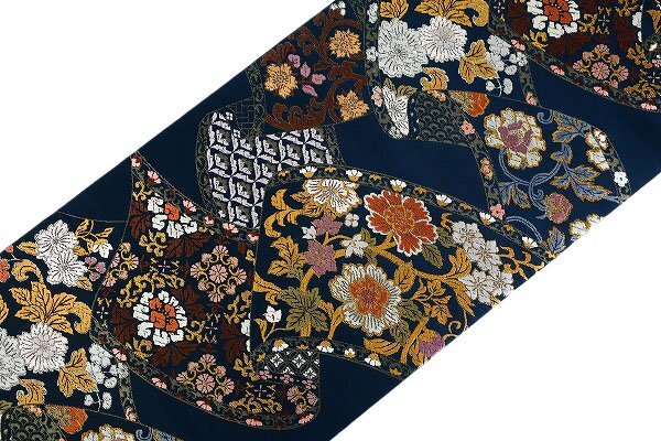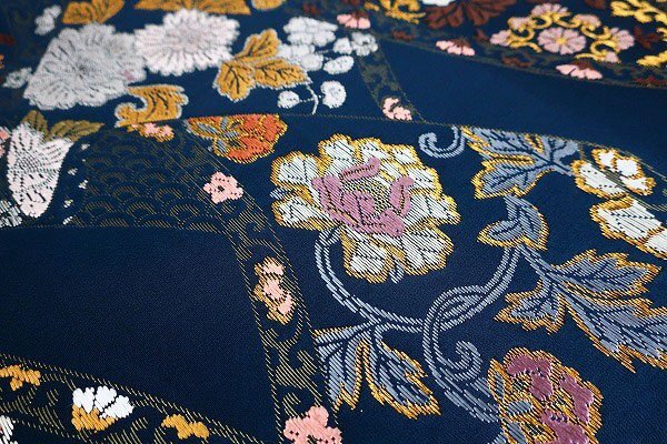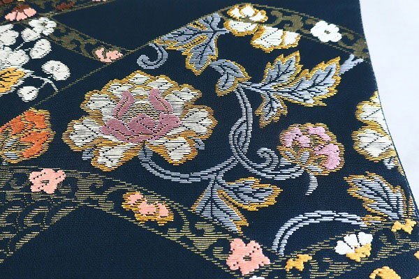 紺色の絹地に、牡丹をはじめとする吉祥花が織り込まれた袋帯です。 |