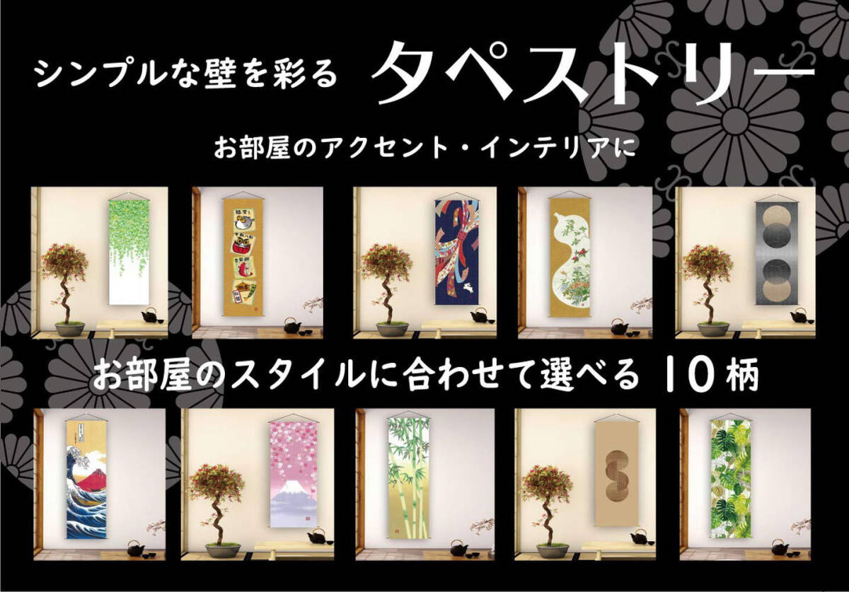 お部屋のスタイルに合わせて選べる10柄があり、取り付けに必要な紐、棒、画鋲が同梱されています。