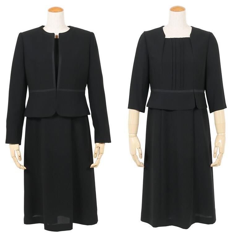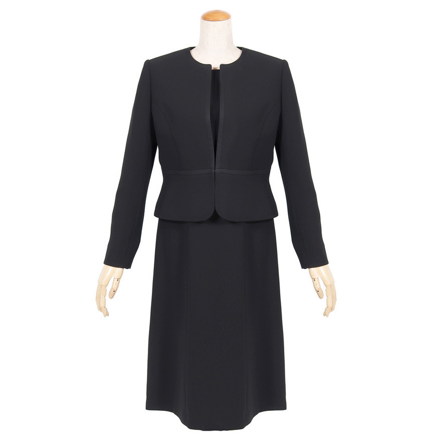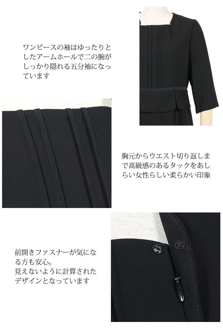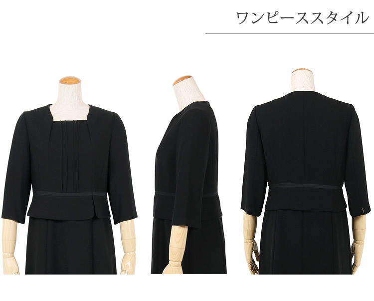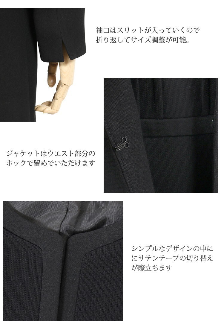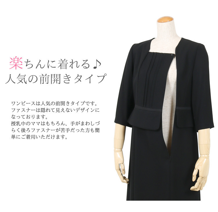 | オールシーズン対応ブラックフォーマル アンサンブル11号サイズ 脱ぎ着が簡単で授乳中のママに人気の前開きブラックフォーマルです。 デザインもスッキリとしたノーカラーで年齢層問わず着ていただけます。 喪服としてだけでなく、お手持ちのコサージュをつけて、お子様の卒園式や卒業式などのママスタイルとしてもおすすめです。 夏はワンピースで対応できます。 ■商品番号 111t143-au ■実寸サイズ ジャケット