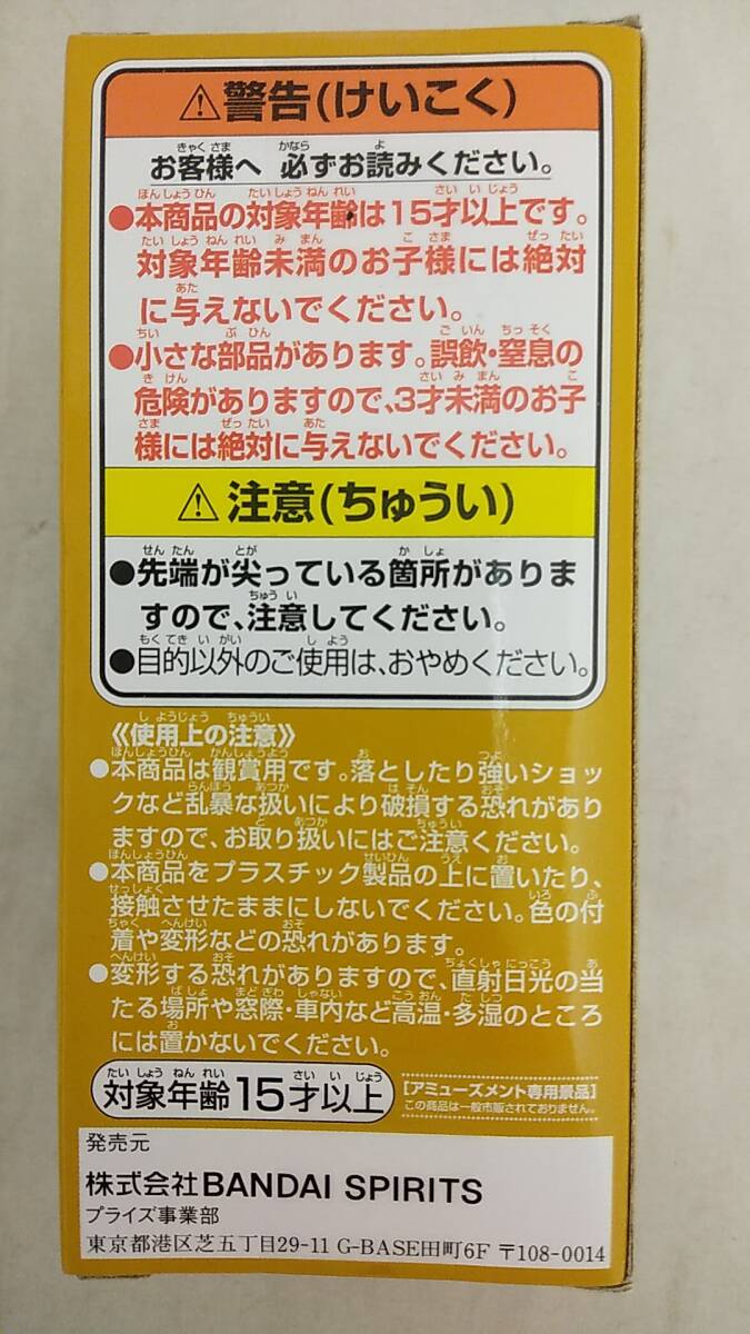| ↑カテゴリーが異なる場合がありますがご容赦下さい↑ 大雨・台風・雪等の場合は、予告なく全ての対応をお休みさせて頂く事がありますm(_ _)m ご覧頂きましてありがとうございます。 ※ご入札前に必ず以下商品説明欄に記載してある全ての項目に目をお通し下さい。 ◇未使用品以外は中古品の扱いになりますので当方での確認時に起こらなかったトラブルが起こる可能性があります。 ◇中古品という特性をご理解いただいた上でご入札をお願いいたします。 ◇内容物は画像に写っている物が全てとなります。 ◇撮影時の光の影響で本来とは異なる色に見える場合があります。ご不安な方はご質問ください。 ※付属品等が欠品している場合がありますので画像をよくご確認ください。 !いかなる場合でも当方からの取引案内前にご入金なさらないようにお願いいたします! !使用している商品画像の転用を禁じます! 商品状態 ・中古品ですが、新品、未開封品でございます。 ・中古品ですので、外箱に傷やダメージがある場合がございます。 ・フィギュア本体は新品商品になりますが、一度人の手に渡ったものとなりますのでご了承ください。 管理上、外箱に多少の傷や汚れ、スレ、へこみ等がございます。 保管による傷、汚れがあるかもしれません。 目立つ傷等に関しては画像で撮影をしているので 画像を参考にしてください。 見落としがあるかもしれません。 予めご了承ください。 ※上記以外の欠陥があるかもしれませんが、一度人を介しておりますので完璧を求められる方や細かい部分まで拘りのある方はご入札をお控え下さい。 複数落札 同梱は同日落札分(日付が変わった0時台終了分は含む)のみ 運搬時、手で簡単に持ち運べない重さになるような物に関してはコチラの判断で個口に分けて発送させて頂きます。ご了承ください。(例 ビールケース2箱までなら同梱可能。) ◇複数落札で同梱は可能であれば同梱致しますが、取引ナビ上でのお支払い、進行は別々での進行になります。ご了承ください。 ◇ID毎のお取引とさせて頂きますので、同じ方でも別IDの場合は別取引・別発送となります。 ◇大型商品(音楽機材・楽器・釣竿等)の同梱は出来ません。 ◇商品名が【長】から始まるものと、それ以外の記号や文字から始まる商品名のものの組み合わせでの同梱はできませんのでご注意下さい。 ※日をまたいでの大量落札につきましては、1口毎にお支払い頂いてからの発送、次のお取引に移らせて頂きます。 | ||