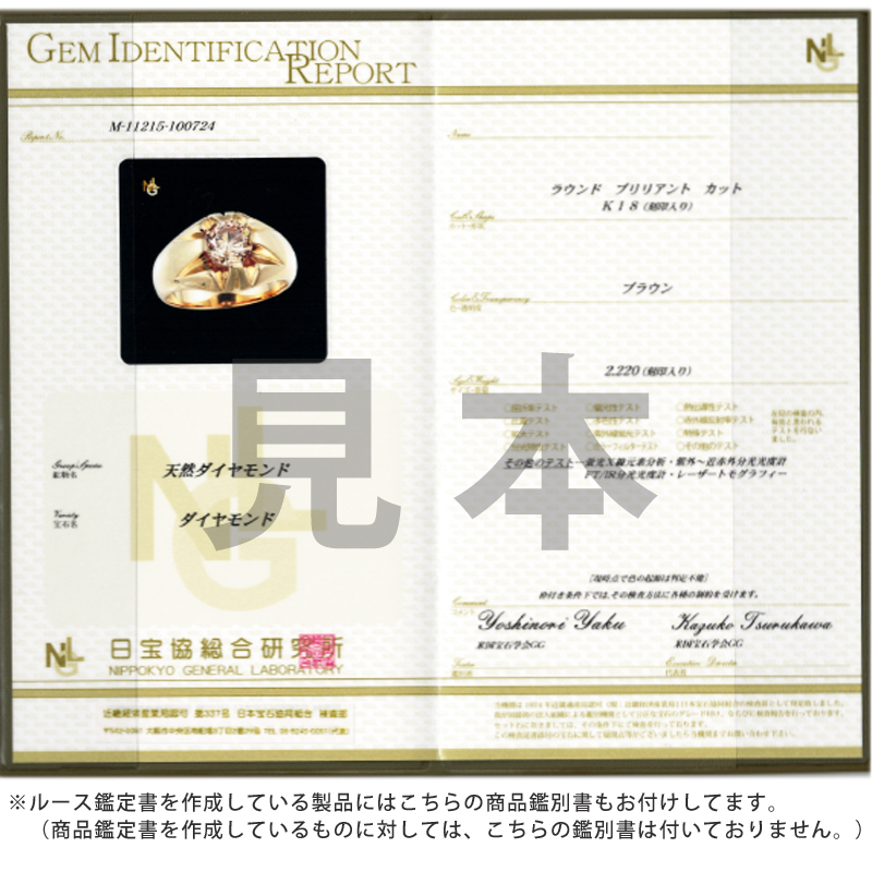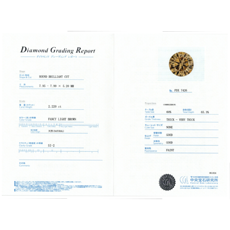 | 品質について | FANCY LIGHT BROWN SI2 日本で一番支持されている中央宝石研究所の鑑定書付きです! 鑑定書の品質をご参照ください! |
