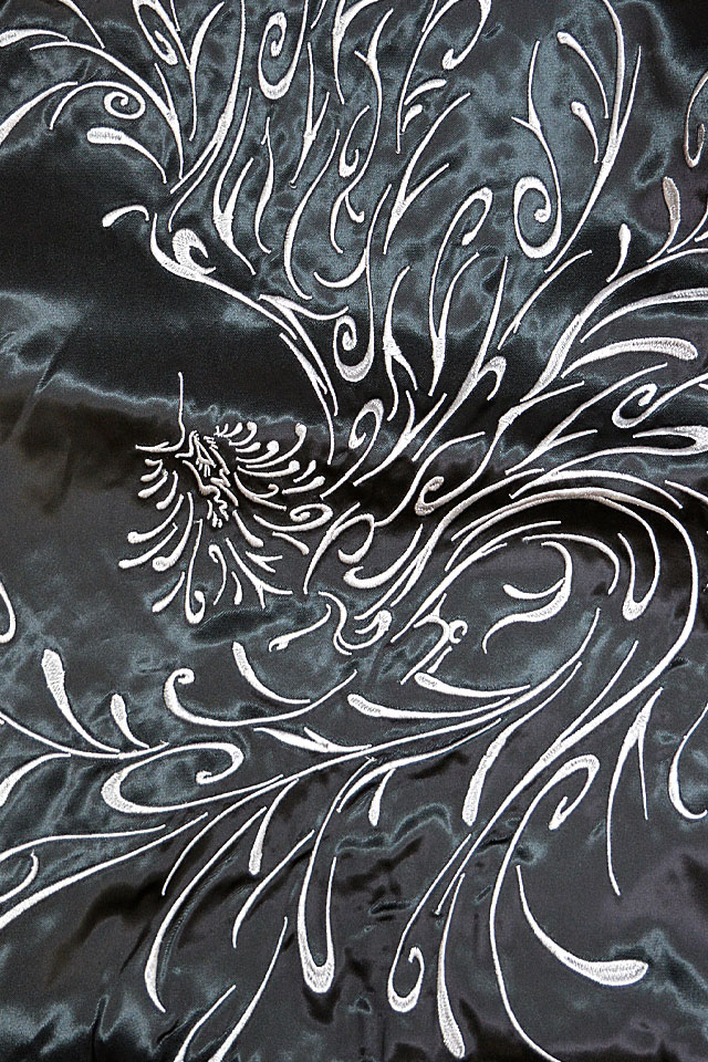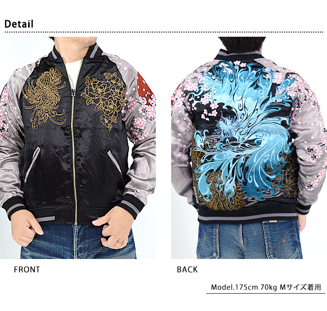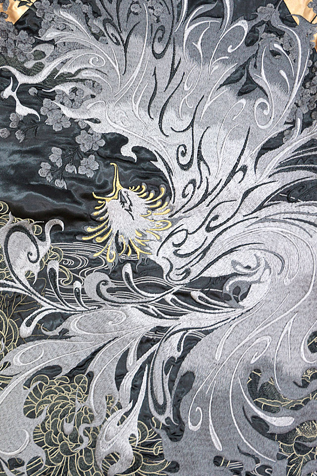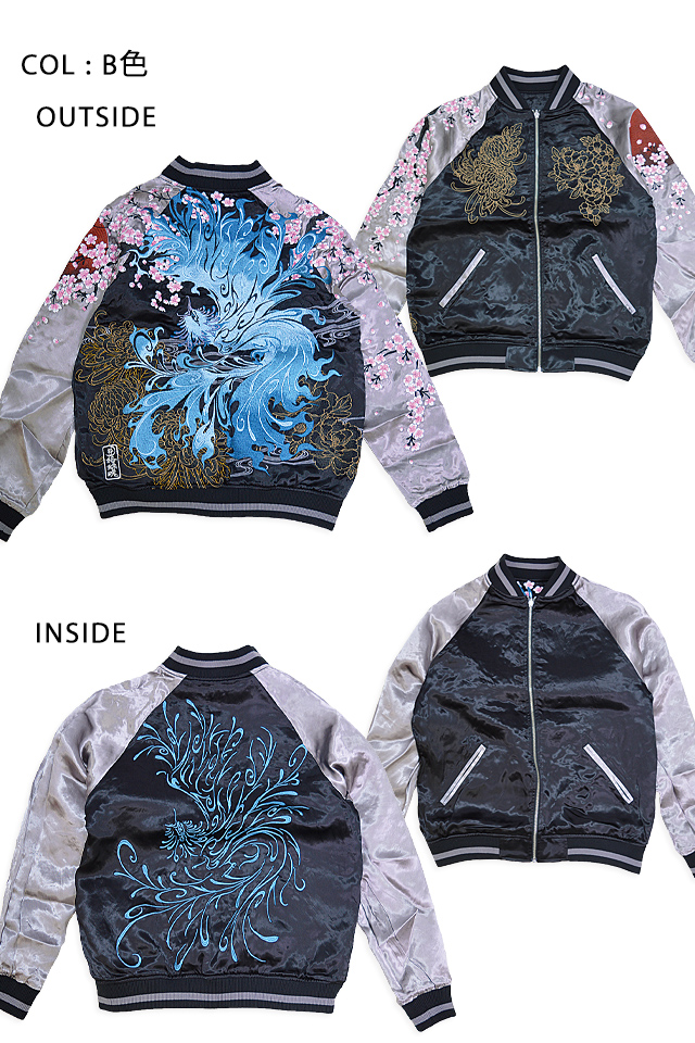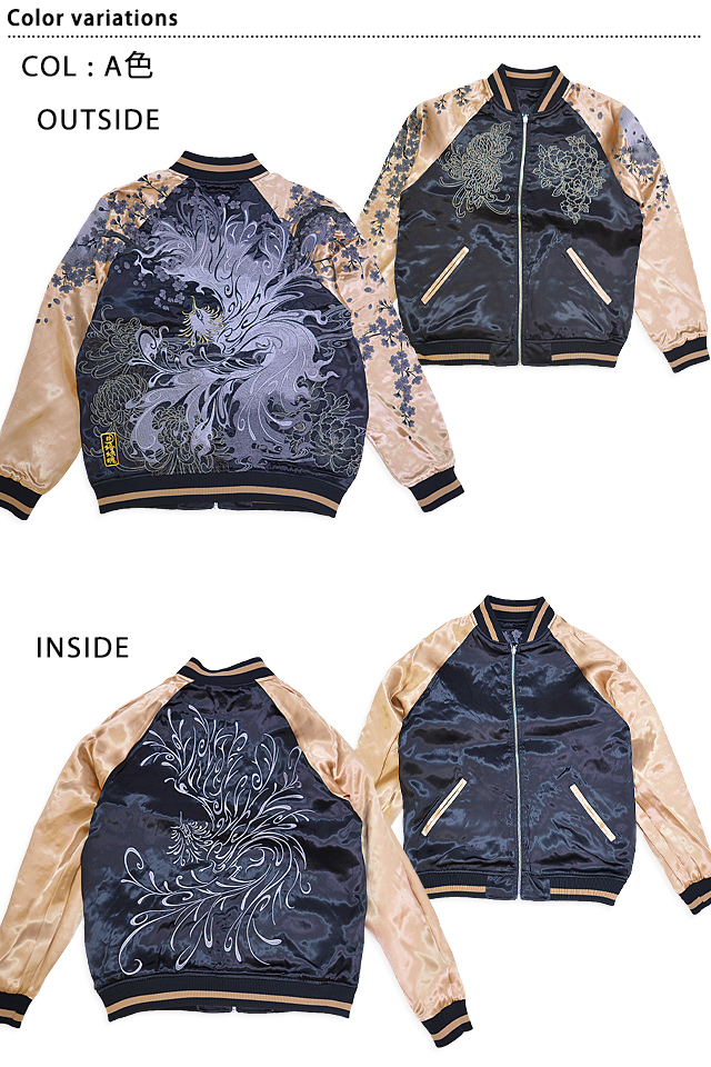 絡繰魂さんから「粋 不死鳥百花リバーシブルスカジャン(243129)」のご紹介です。 重みを感じる程の刺繍量が魅力的な粋シリーズから、最新作のスカジャンが登場しました。 今回モチーフの主役に採用されたのは、珍しい不死鳥柄。 背中には羽根を広げた不死鳥の姿をダイナミックに刺繍しました。 背景には菊と桜をバランス良く配置。 フロントには菊をアウトラインのみで刺繍しました。 表面はしっかり柄の入ったスカジャンですが、対象的に裏面はシンプルに仕上げ、メリハリを付けました。 ボディーにはレーヨンサテンを使用し、ドレープや陰影がくっきりと現れています。 | ||||||||||||||||||||