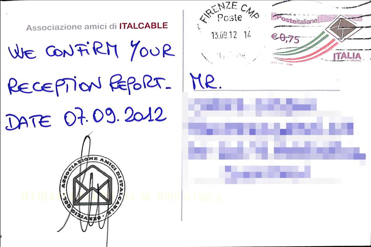 | 【商品名】・・・ITALCABLE(★イタルケーブル)のベリカード。 ★RTMの略は、RADIODIFFUSION TELEVISION MAROCAINE です。 【コメント】・・・小電力でイタリア語が主の為、入手困難なベリカードです! 【国名・地名】・・・イタリア共和国★地方都市フィレンツェ。 【受信データ】・・・2012年9月7日・SW10000KHZを受信。 【記載事項】・・・受信データ・受信者の住所・氏名が記載。 【状態】・・・シワ、汚れ、シミ、焼け、色あせ等があります。 ■カードの状態は、画像を参考に判断して下さい。 ■この機会にぜひこのベリカードを貴方のBCLコレクションに加えて下さい! | |
