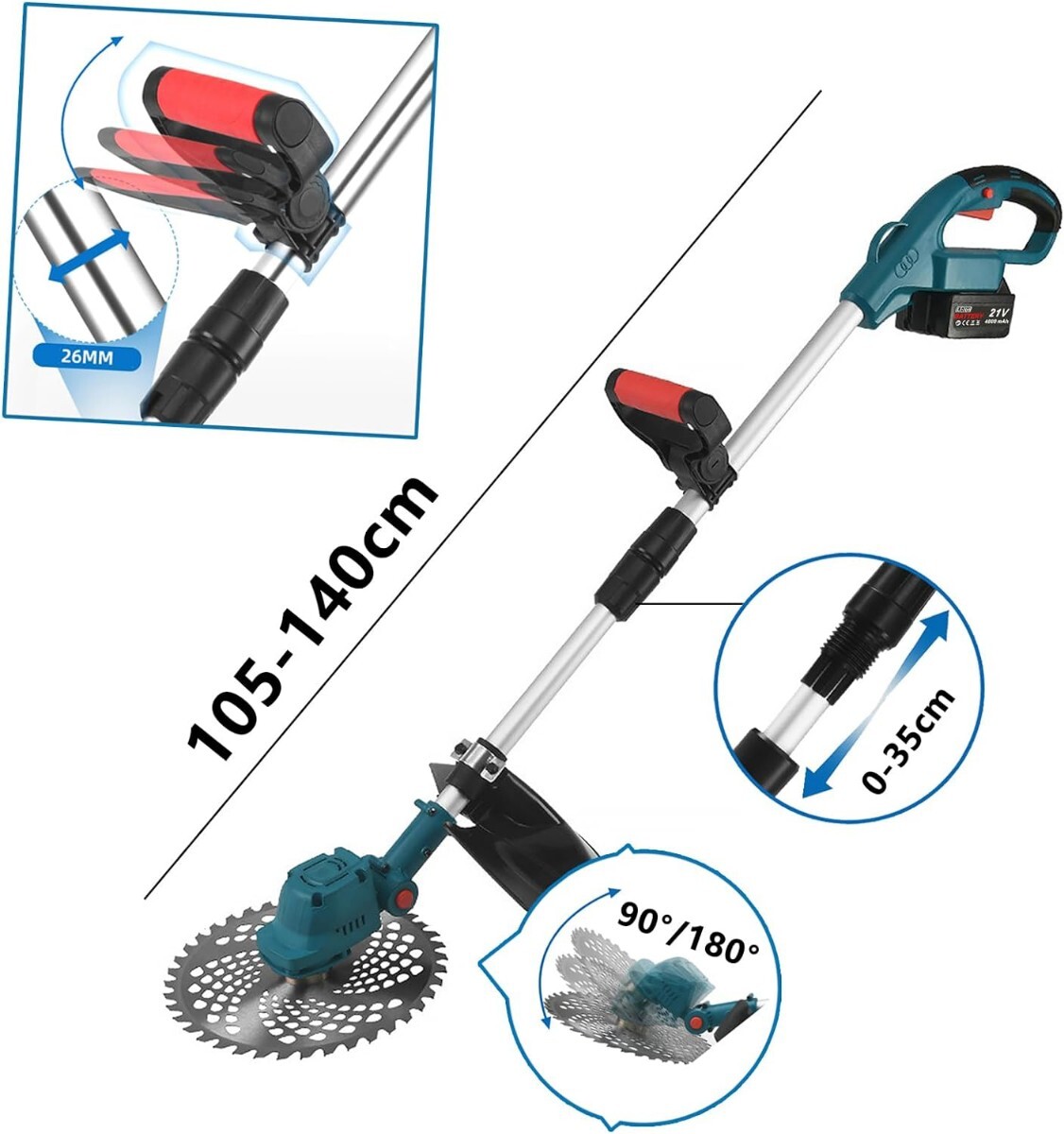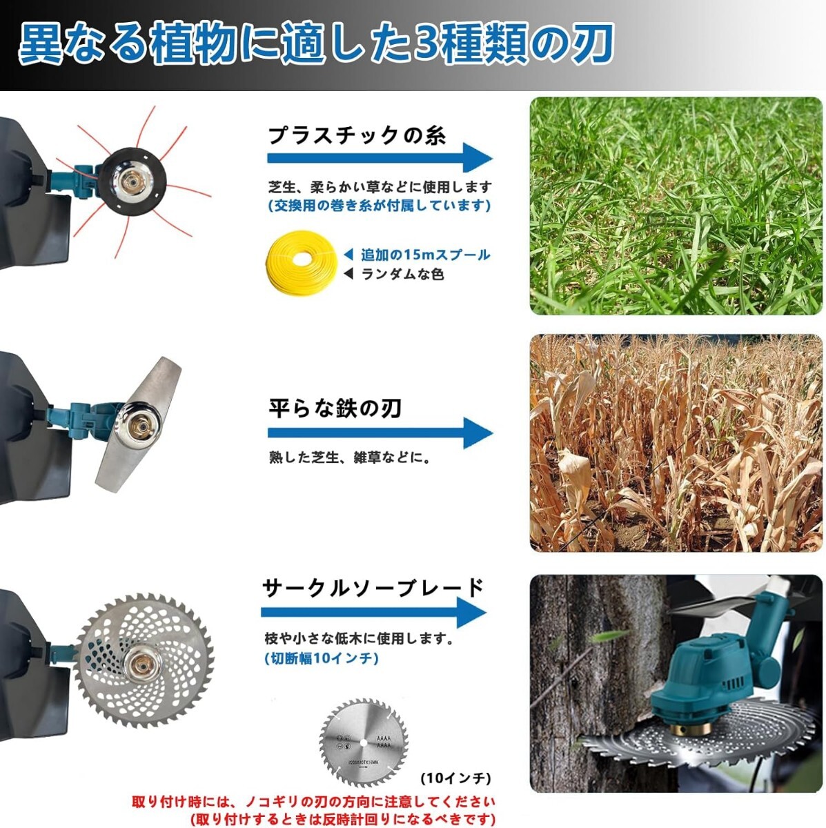 【3種類のカットブレードとワイヤレス設計】:①草刈りナイロンカッター、(柔らかい草、雑草)のトリミングに適しています;②ステンレスブレードは、(芝生、小低木、農作物)のトリミングに適用;③マンガン鋼丸鋸ブレードは、強力な切断能力を持ち、(粗い低木や枝)を最大250MMまでカット可能です。ワイヤレスで、電源コードの制限を受けず、どこでも持ち運びが可能で、コードレス芝刈り機lawn mowerを使えば、庭や低木のトリミング、敷地、花壇、歩道、テラス、アウトドアキャンプ場を素早く片付けることができまに非常に適しています。