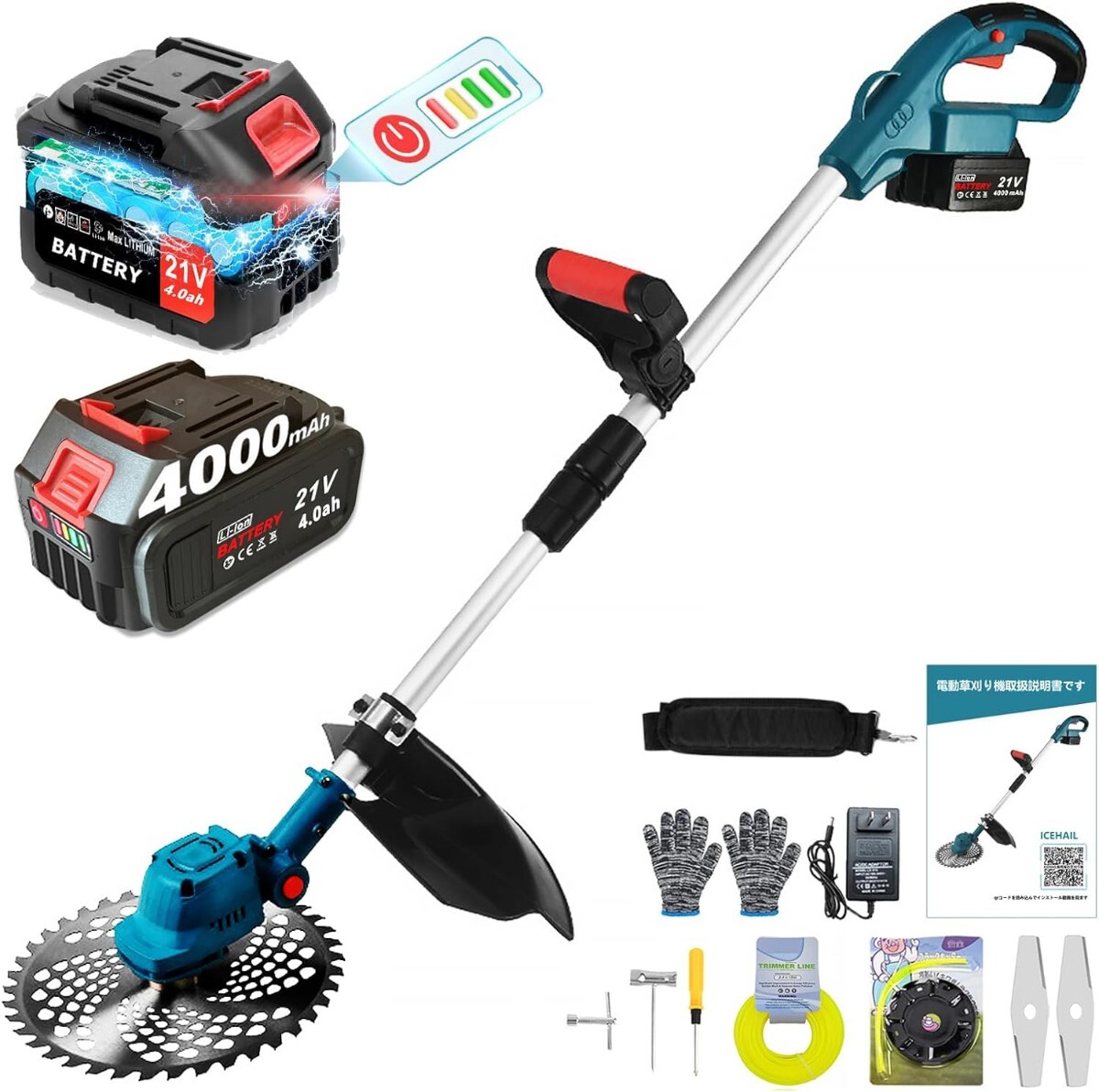 【強力なブラシレスモーター/ 2個の4000mAhのバッテリー配備】- Icehailの充電式刈払機は、最高速度20,000rpmの高性能大出力直流ブラシレスモーターで超速カットを実現します。ブラシモーターと比較して、ブラシレスモーターは30%の馬力を増加させ、20%の消費電力を削減し、カット速度を20%向上させ、排熱が早く、全天候での作業をサポートします。72時間連続稼働しても焼損しません。庭での草刈りやDIYに非常に適しています。2つの4000mAh大容量高品質リチウムイオンバッテリー(マキタ互換)を装備し、長寿命を実現し、満充電で最大120-140分間連続使用が可能です!