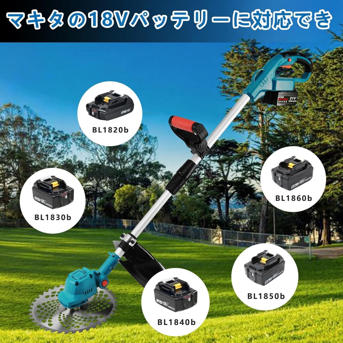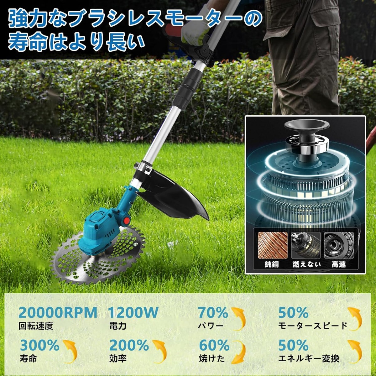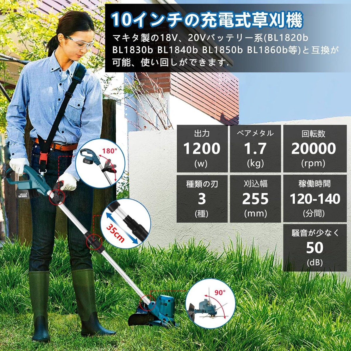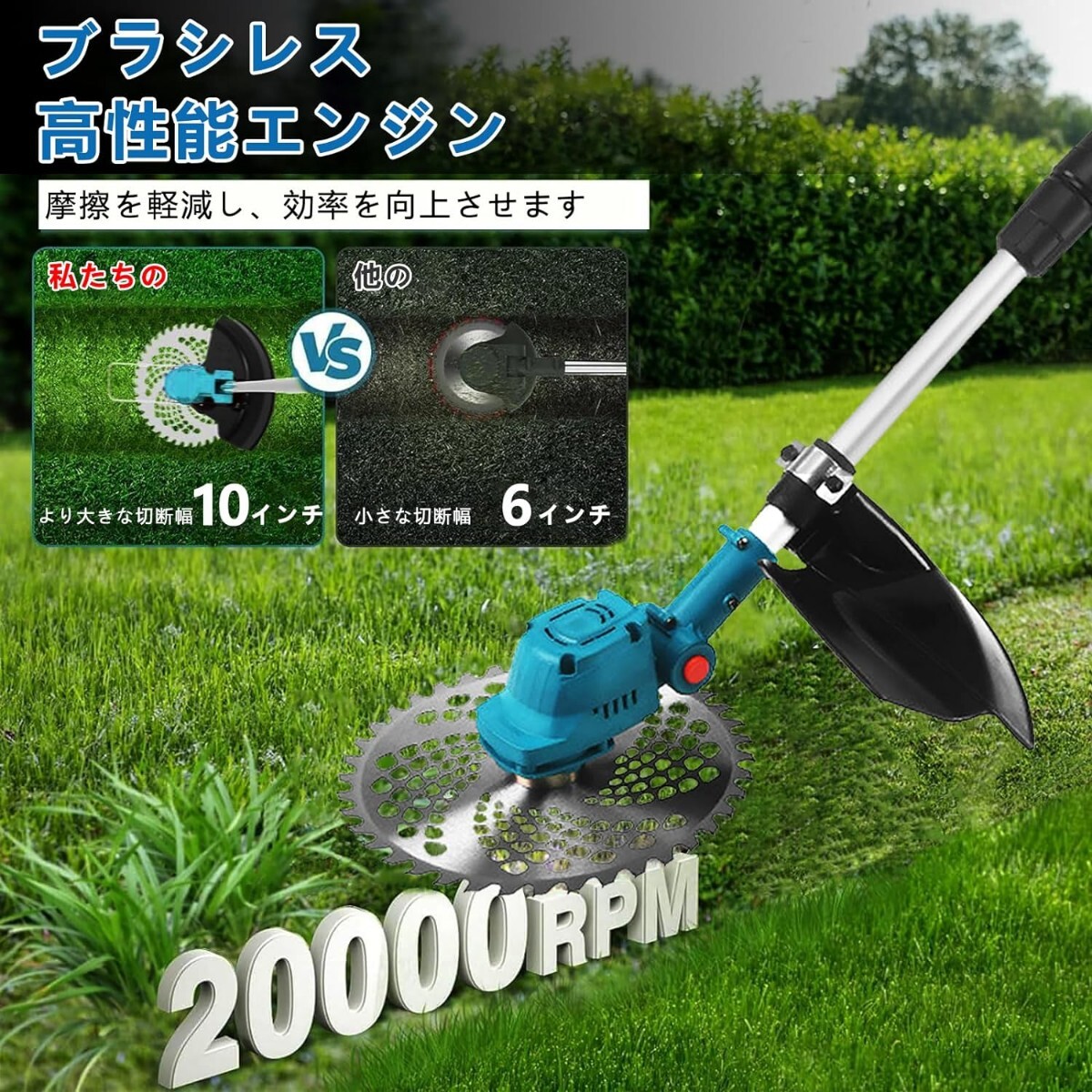 電動芝刈り機 充電式 草刈り機 マキタ18v互換 刈込幅255mm PSE認証済 4000mAh電池残量表示2個付き 1.7kg軽量 20000rpm コードレス草刈機 搭載ブラシレスモーター1800W 低騒音 安全設計 (環境に優しい) 御勧め 男と女性高齢者 家庭用 伸縮式角度調整保管が楽 3種類替刃多地形用枝切り 芝生 畑 雑草 植木 伐採 農業 園芸用機器