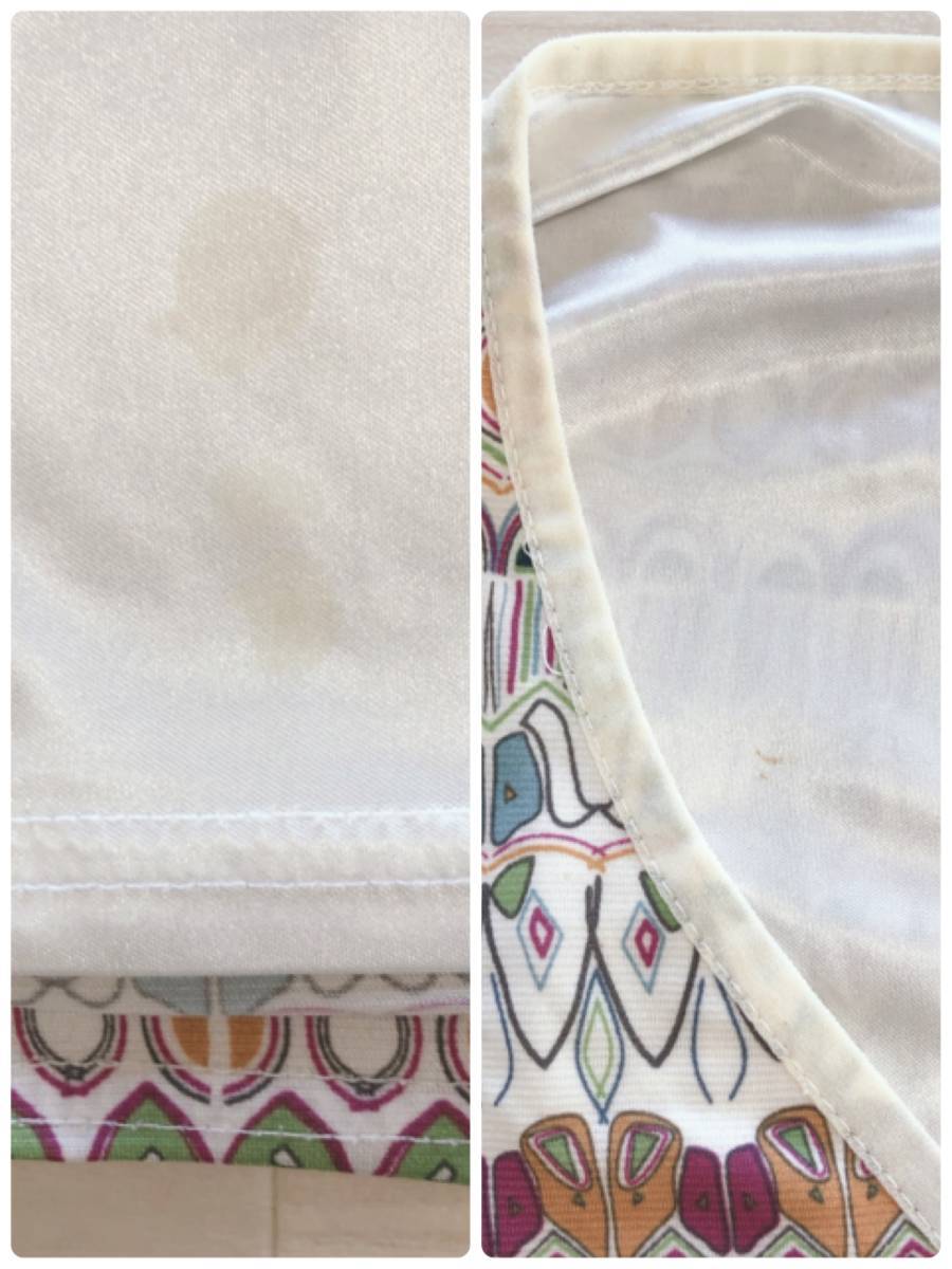 表面腹部に二か所、裏地背中上部、裏地腹部にそれぞれシミがありますが、まだまだご使用いただけるアイテムです。(写真をご確認ください)