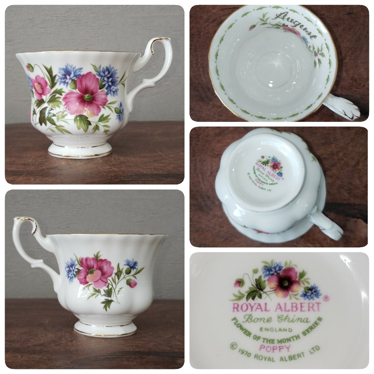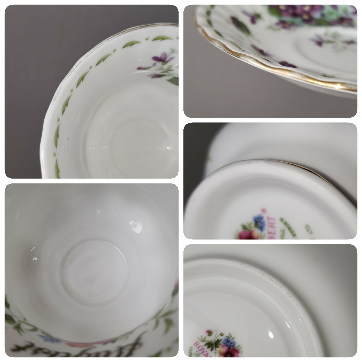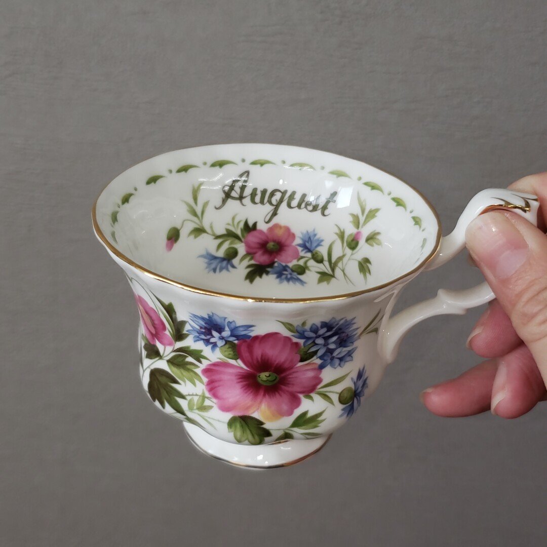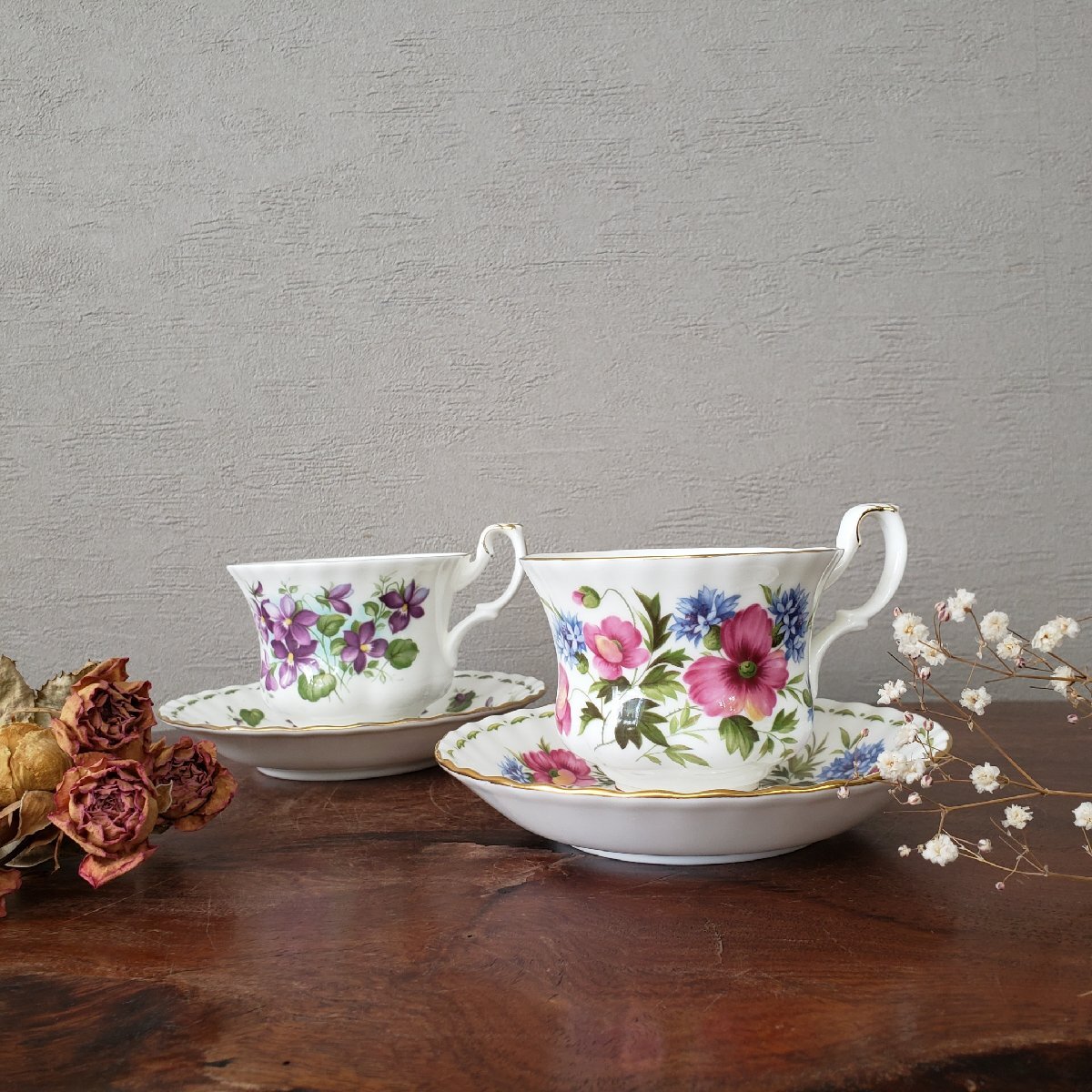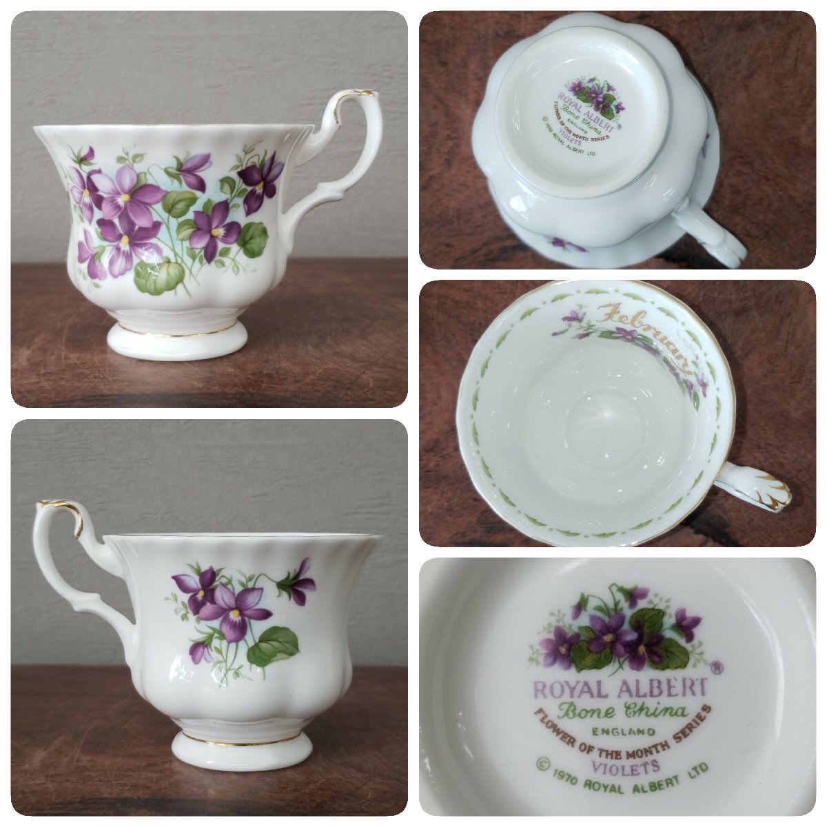 ロイヤルアルバートのフラワーオブマンスシリーズの2月と8月のカップ&ソーサーです。 | ヒビやワレカケは見当たりませんでしたが、カップ口径のゴールドラインが擦れて薄くなっているところや消えているところがあります。 発送サイズ |