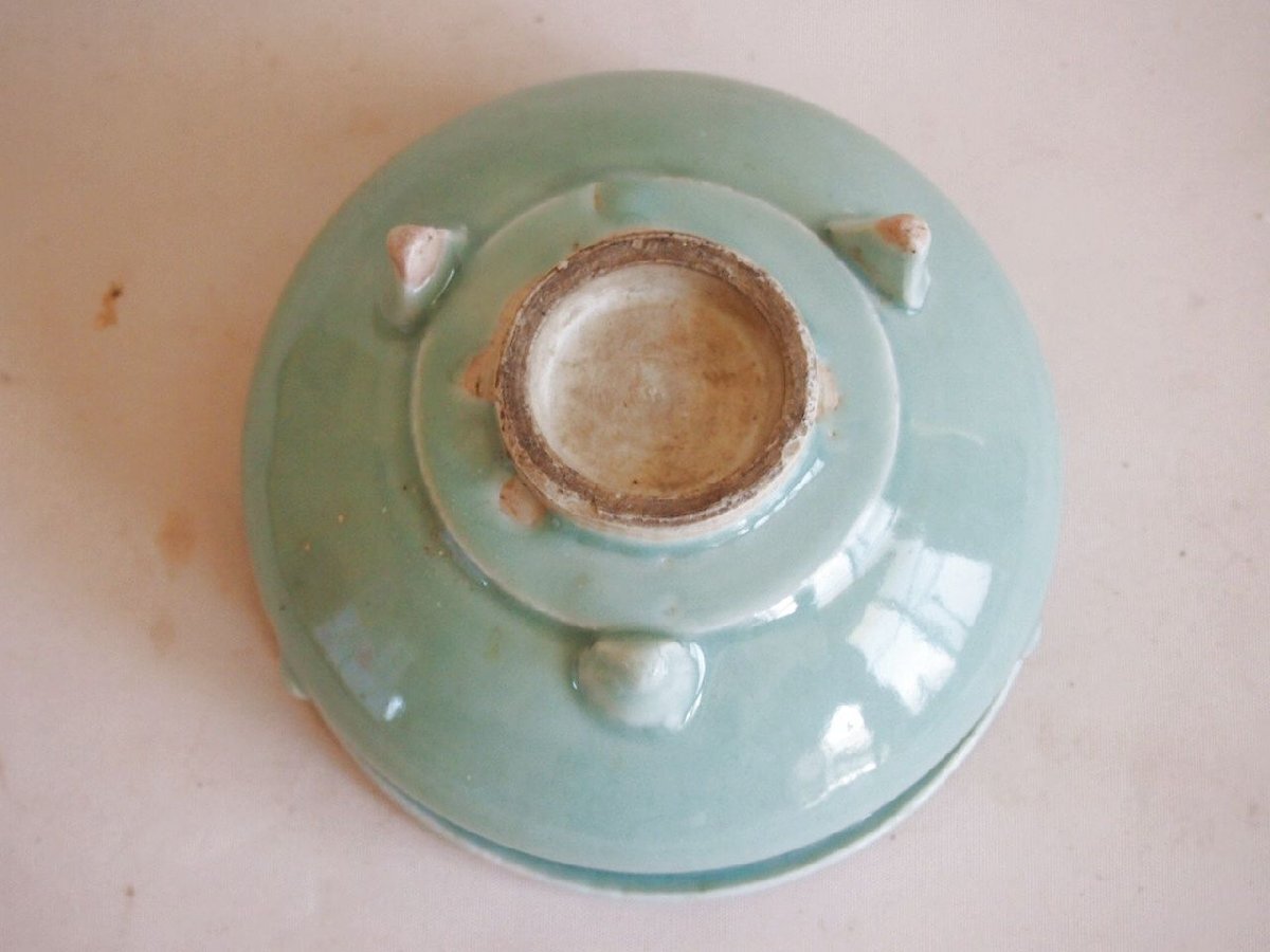 | 江戸時代 古伊万里 青磁三足香炉15.5cmです。 胴の突起をアクセントし シンプルながら 力漲る安定感ある造形で 中国の古代竜泉窯青磁にも通じる 大変美しい釉薬が厚く掛けられた 正に用と美を兼ね備えた 芸術品と言えます。 扱いやすいサイズで、 花生けなどに 見立てても素敵です★ 時代が感じられ 高台淵に古い時代ソゲは見られますが フチなどにも欠けは見られず 健全な状態です。 古い品ですので画像もご確認の上 ご検討ください。 ※茶筅(高さ12cm)は サイズ確認のサンプルです。 ★サイズ(約寸) 高さ7cm 胴径15.5cm 口径内13cm 重量453gほど 古美術品と共に充実した生活を♪ |