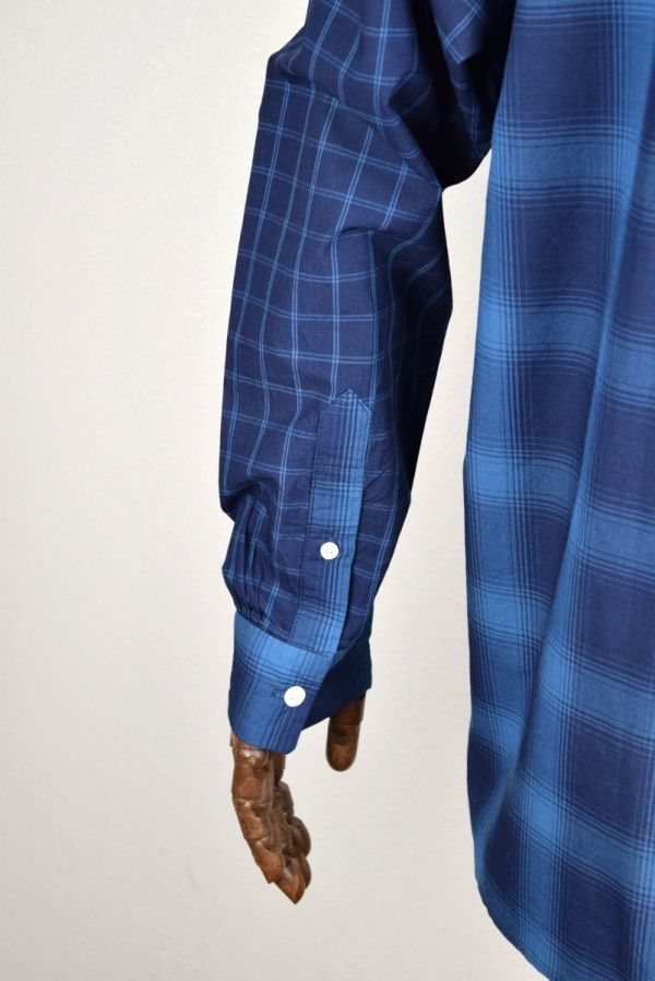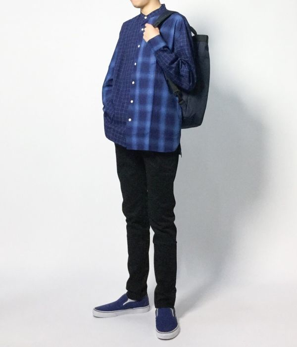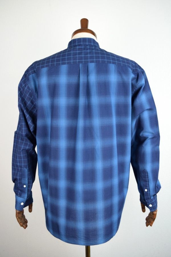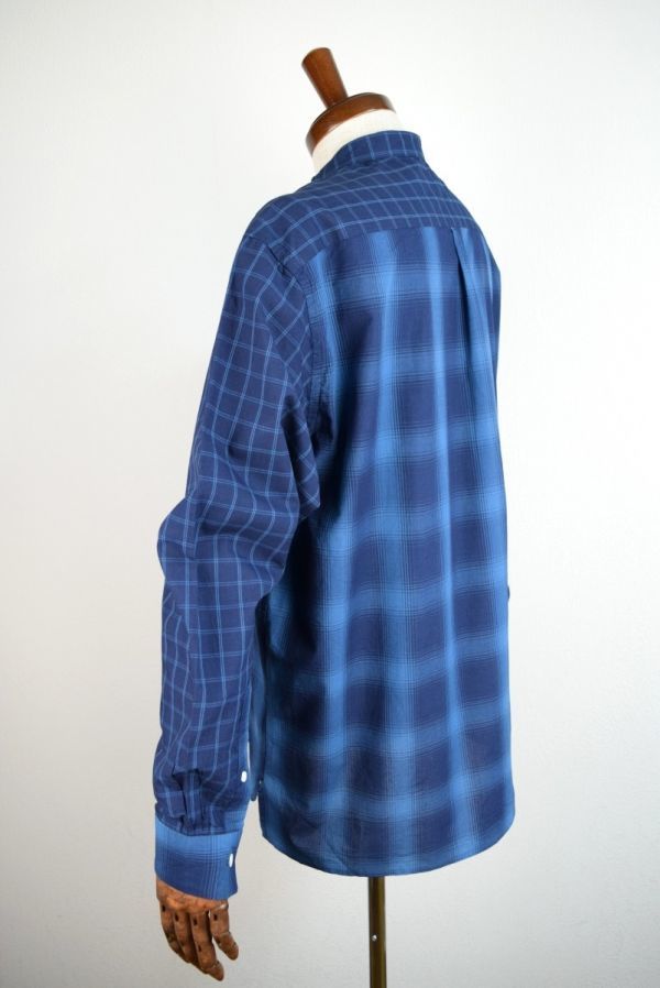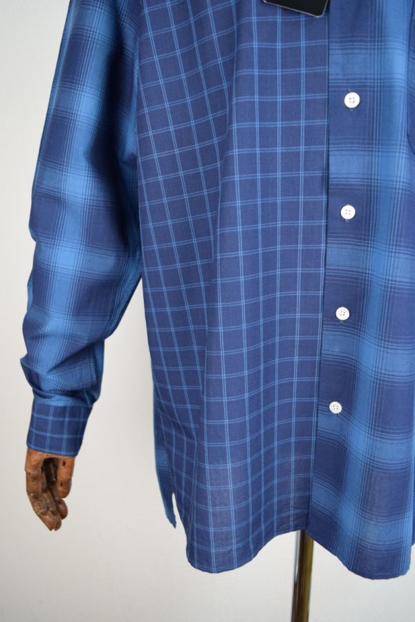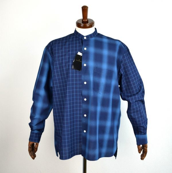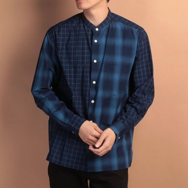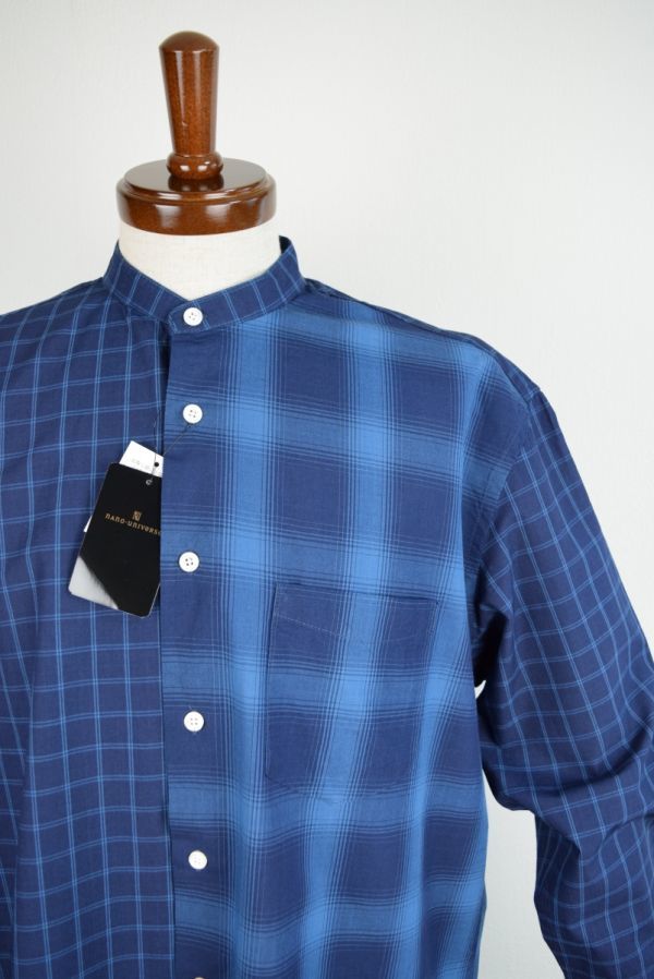 二種類のチェックを組み合わせたクレイジーパターンのバンドカラーシャツ。