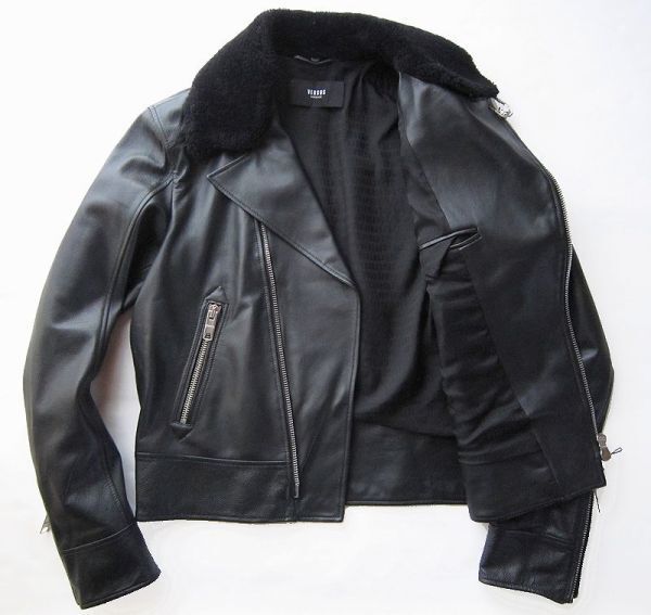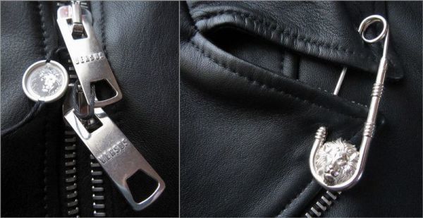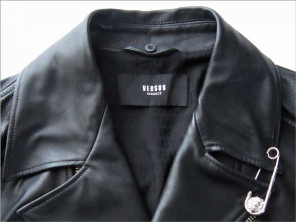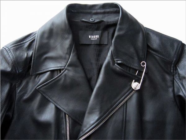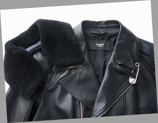 柔らかで滑らかな上質なスペイン産ラムスキンレザーを使用、襟にはリアルファー(羊毛皮)を用い、VERSUSのシンボルのライオンヘッドのモチーフ刻印入りの安全ピン、ファスナー等細部ディテールまで拘ったヴェルサーチならではの唯一無二の個性的なデザインに仕上げられたラグジュアリー感漂う逸品です。