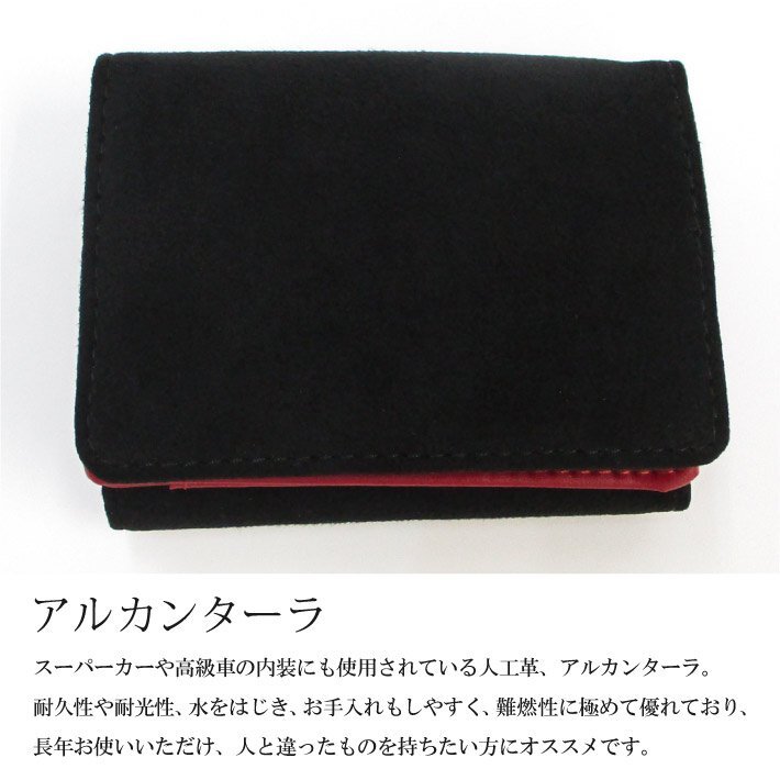 車好きにはたまらないアルカンターラ素材の財布です 表側の素材は、スーパーカーや高級車の内装にも使用されているアルカンターラという、クルマ好きには高級内装素材として知られている人工革です。 スエードに似た高級感ある見た目ですが、より耐久性や耐光性、水もはじきやすく、難燃性が極めて優れていると同時に肌触りの良い素材です。 液体の吸収力が低く、水に濡れても乾けば元通りの風合いを取り戻します。汚れ落としが簡単です。 耐久性に優れているので長年お使いいただけます。人と違ったものを持ちたい方にオススメです。 コンパクトで使い勝手がいいサイズ感とデザインです。 誕生日プレゼント・クリスマス・バレンタイン・父の日・母の日などの贈り物にも最適です。 ■カラー:BK×RED(レッド) ■素材:外側 アルカンターラ、内側 牛革 ■サイズ(約):横10cm×縦7.5cm×マチ3.5cm ■重量:約82g ■仕様:お札入れ×1、お札入れ仕分けポケット×3、小銭入れ×1、フリーポケット×1 --革製品について-- ・製作過程により多少の傷、汚れ、縫い目が粗い、塗装にムラ、接着剤跡等がある場合がございます。 ・天然素材の商品は、自然由来の素材のため革には細かなシワや傷跡・トラ等が存在する場合があります。 ※シワなどは、動物の生育環境や年齢、個体によって異なる、革の特性です。 ・ご覧のモニターやプラウザの設定、照明等により、画像と実物の色合いが、若干異なる場合がございます。 これらについては予めご理解頂いた上でご購入お願いします。 | |